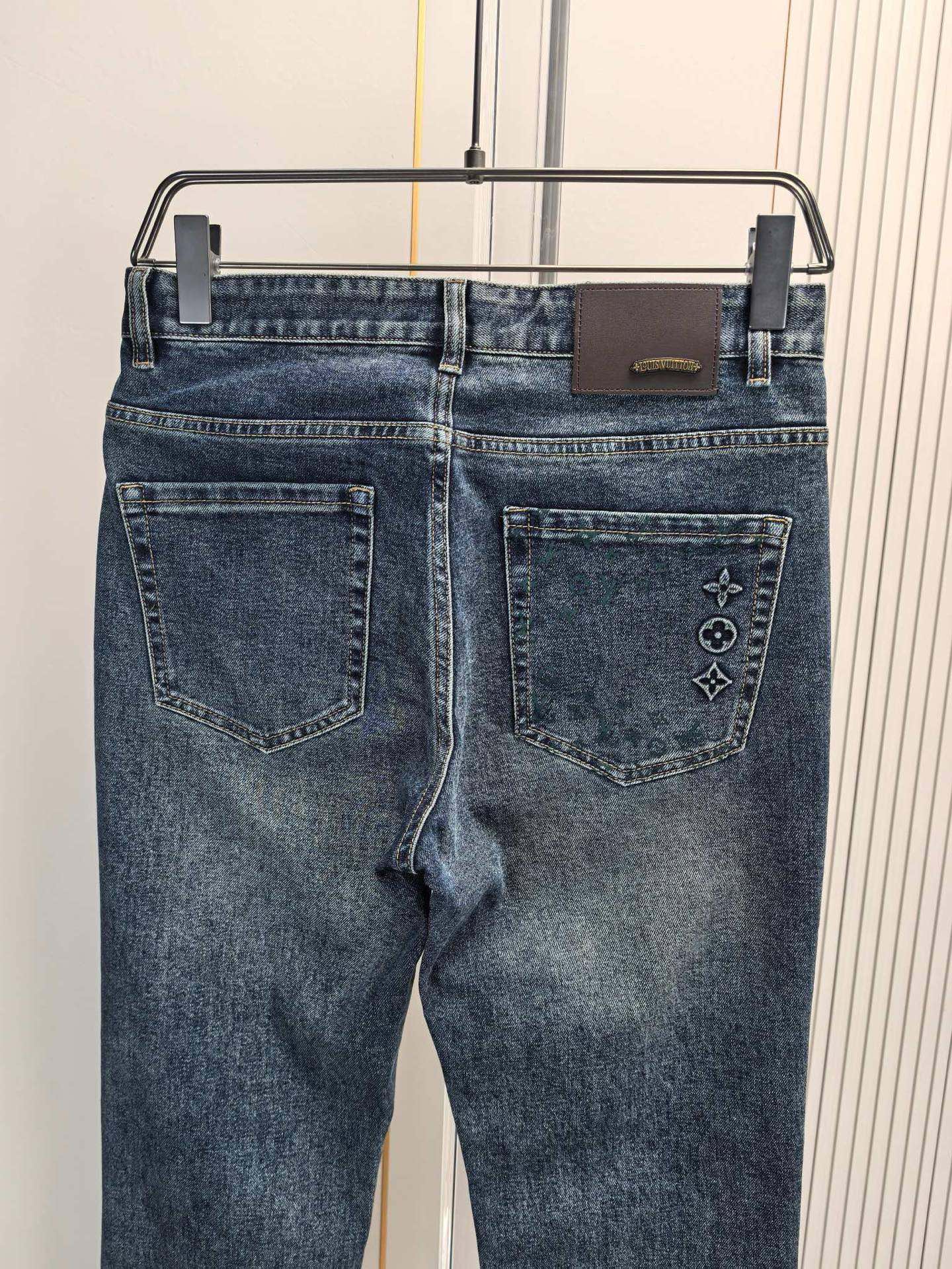 LV 2025 early fall men's jeans. Heavy wash denim, custom fabric, soft & comfortable. Double washing process, top-notch feel & breathability. Custom metal logos, premium materials. Great elasticity, low-key design. Sizes 29-40.