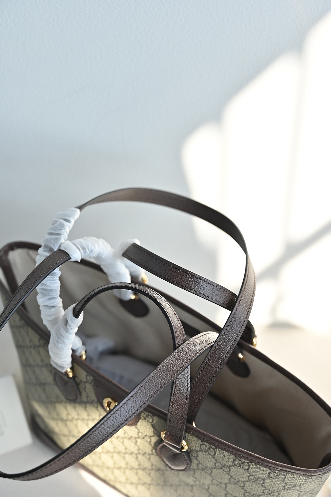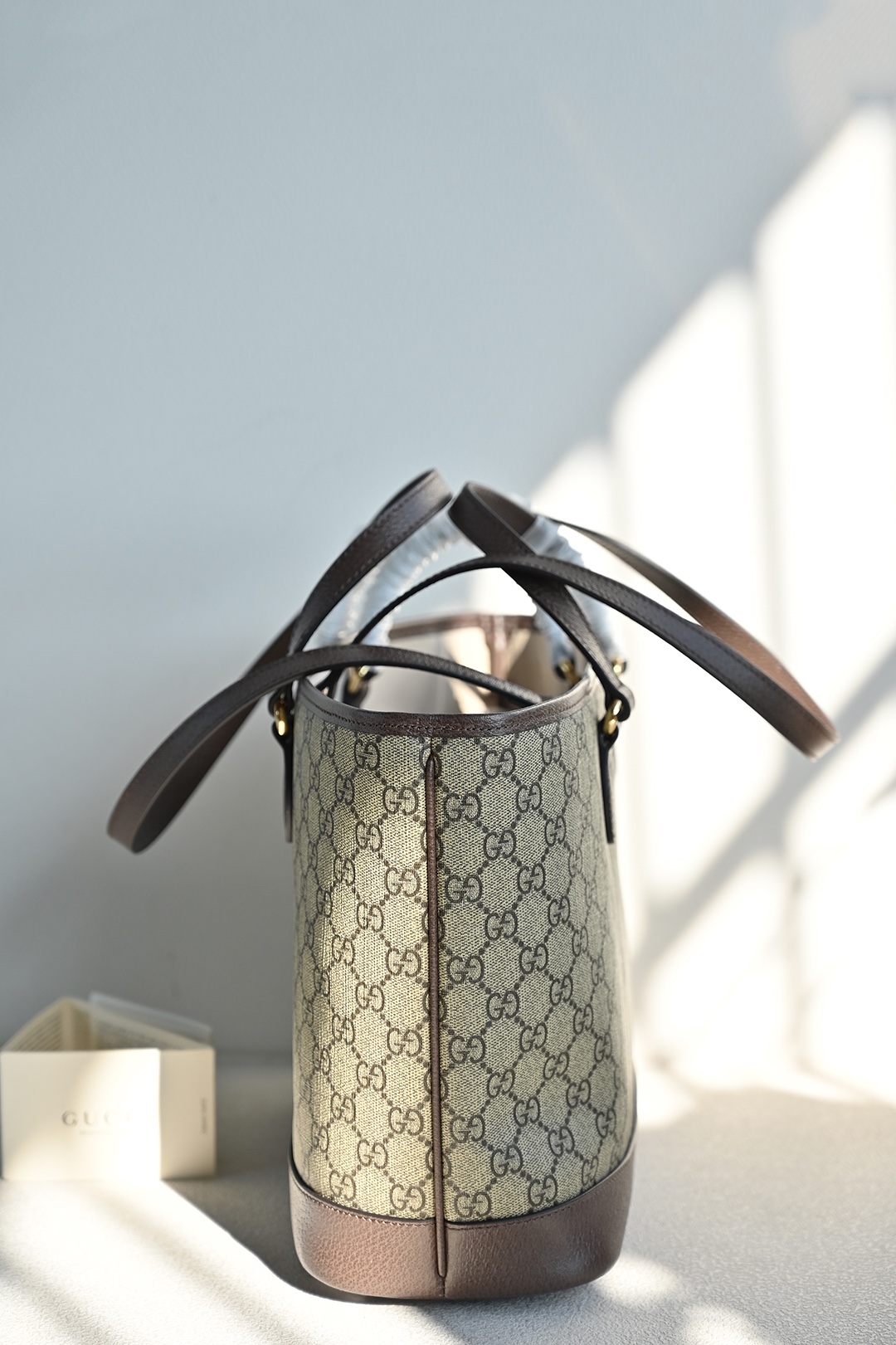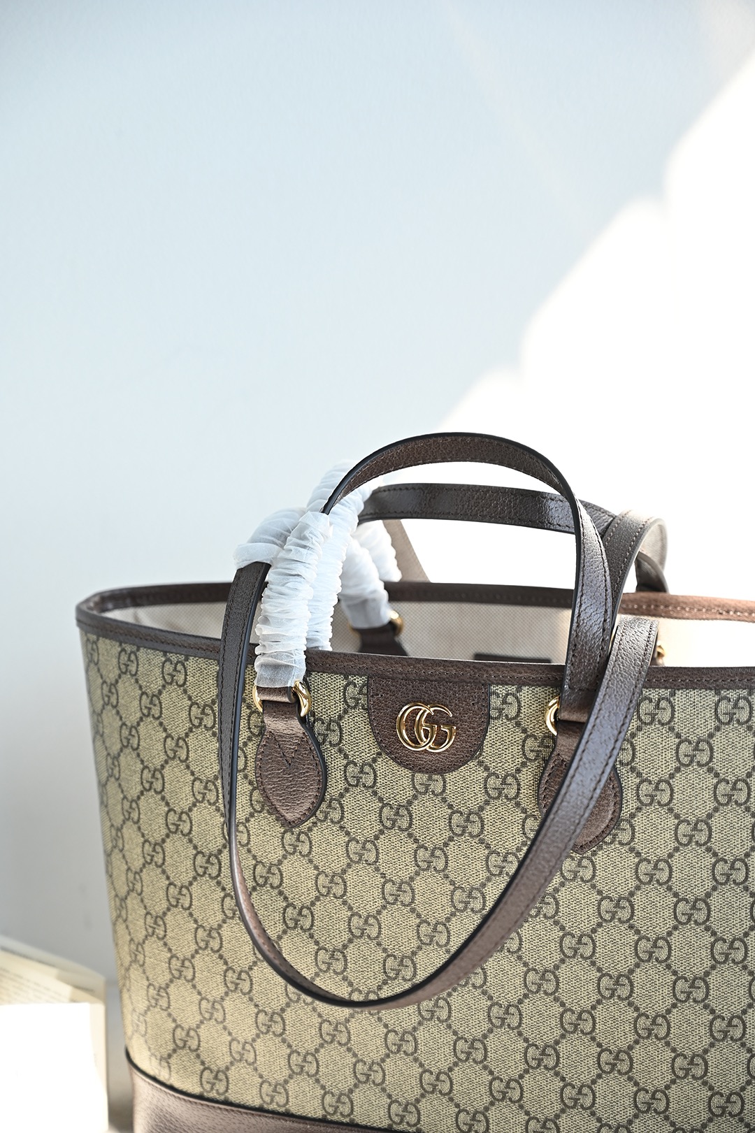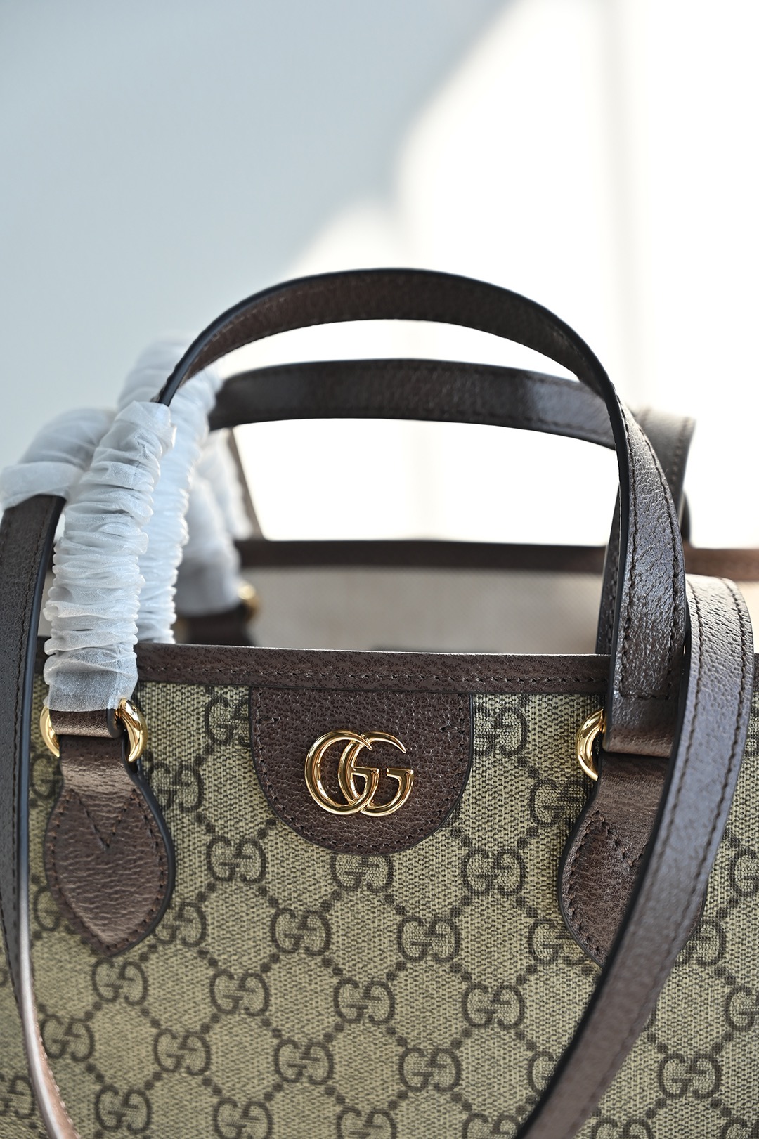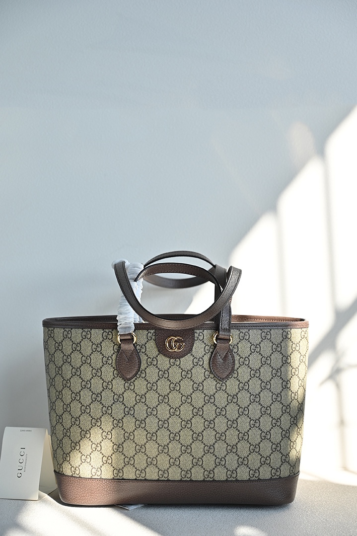 The Ophidia series remains one of Gucci's iconic handbags. Each season, the brand introduces new styles, creating versatile accessories suitable for various looks. The two handles give this tote bag a multifunctional attribute—it can be worn as a shoulder bag or carried as a handbag. The double G, as a classic design element, is deeply embedded in the brand's designs. On this handbag, it is exquisitely presented in an eye-catching manner, complementing the GG Supreme canvas and brown leather trim.