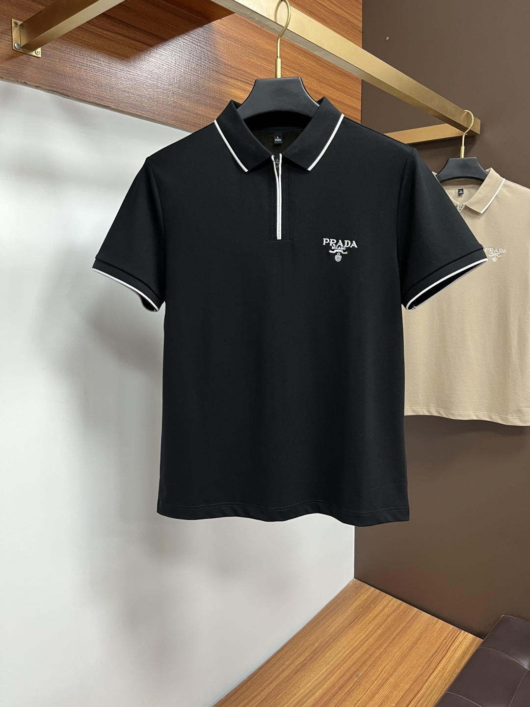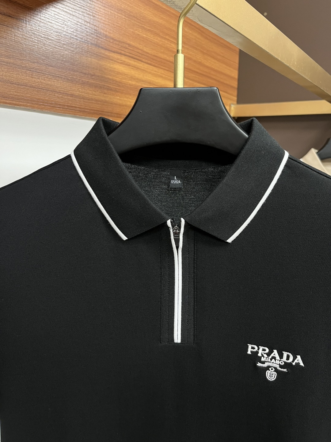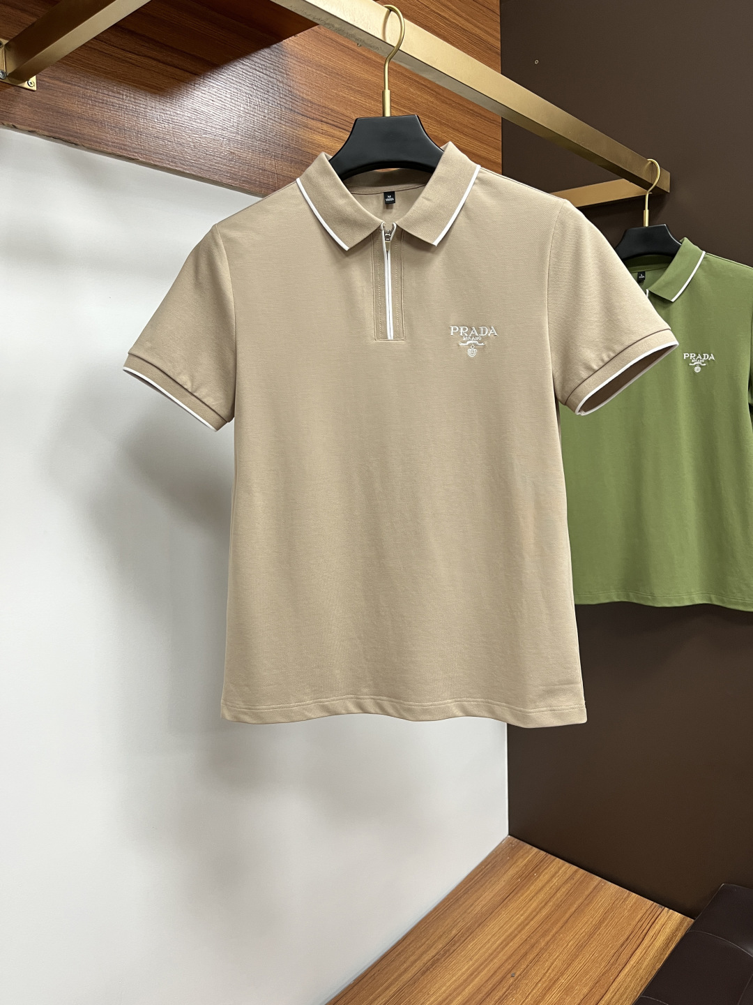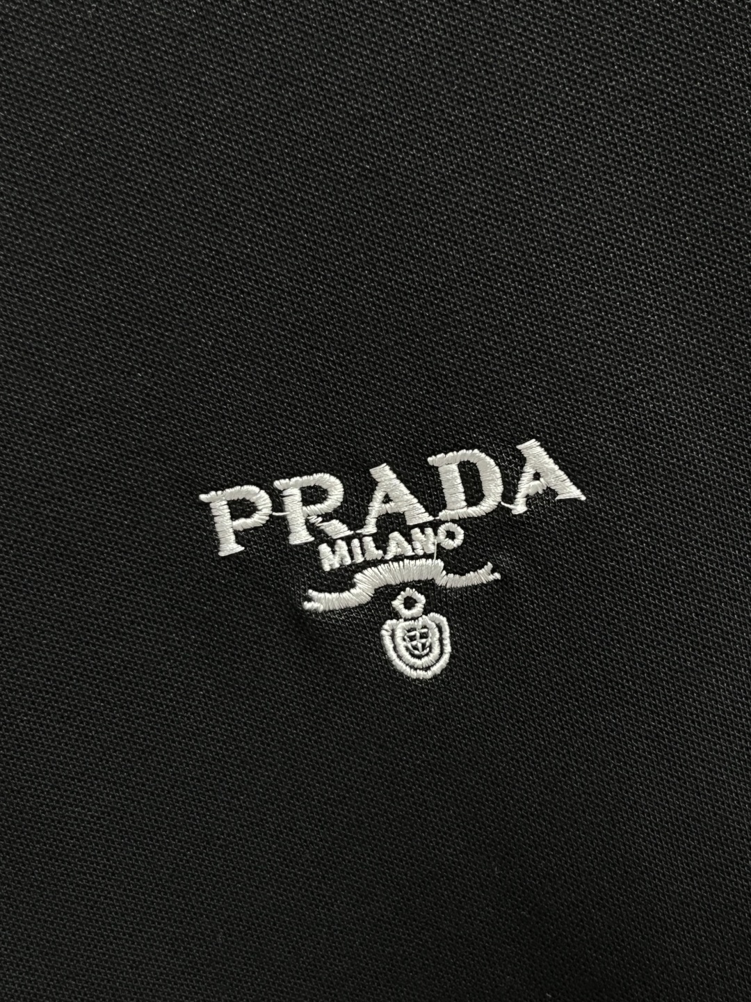 Prada 2025 spring-summer polo collar design, single-breasted, clean lines. Soft, breathable fabric. Versatile for business or casual wear. Sizes M-3XL.