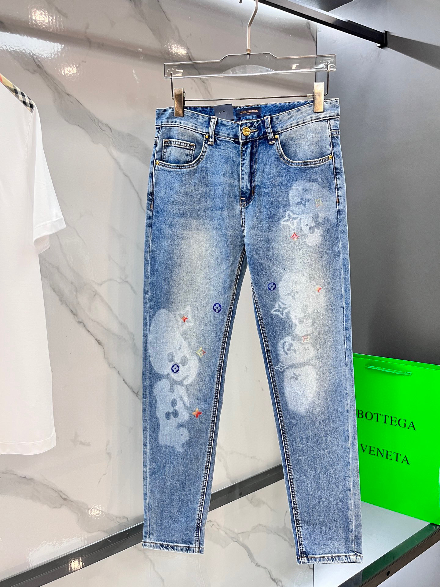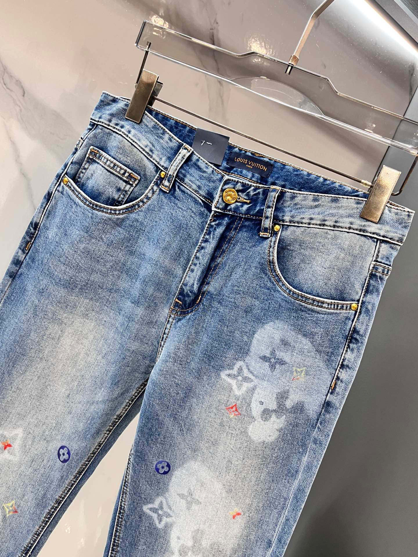 LV thin jeans. 2025 latest. 98% cotton, 2% elastane. Sturdy, soft, slight stretch. Comfortable fit. Minimalist style, hidden zipper, embossed pockets. Clean cut, elegant look. Sizes 29-36.