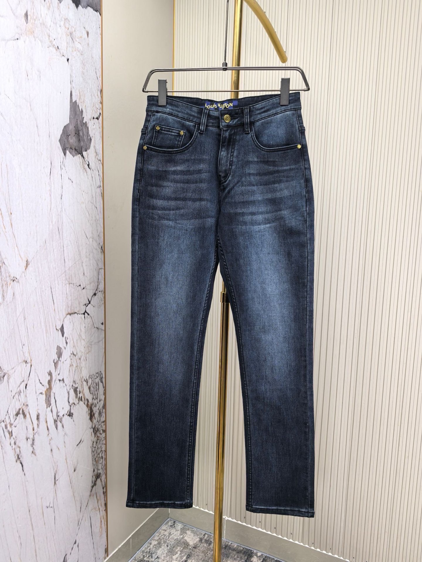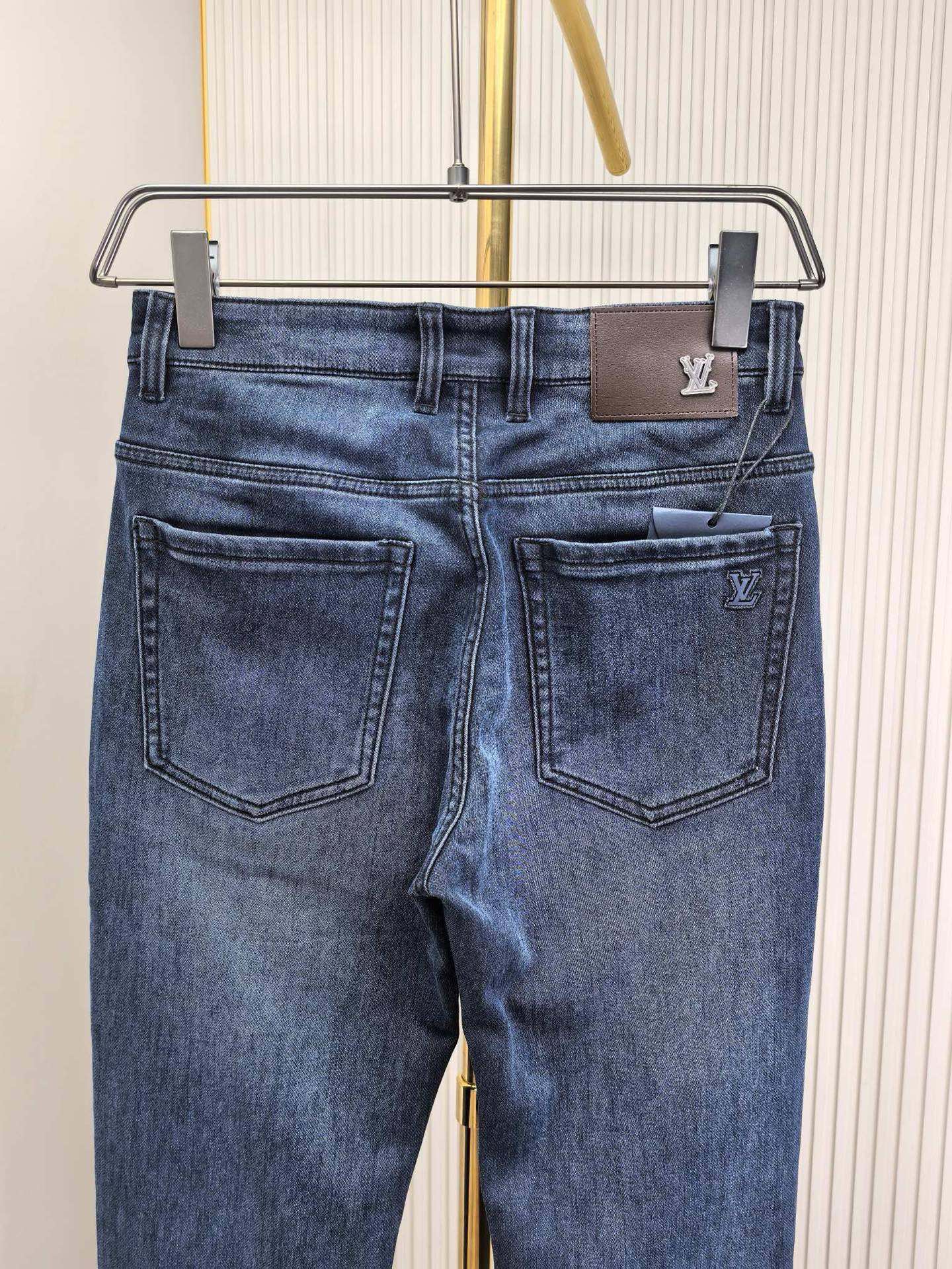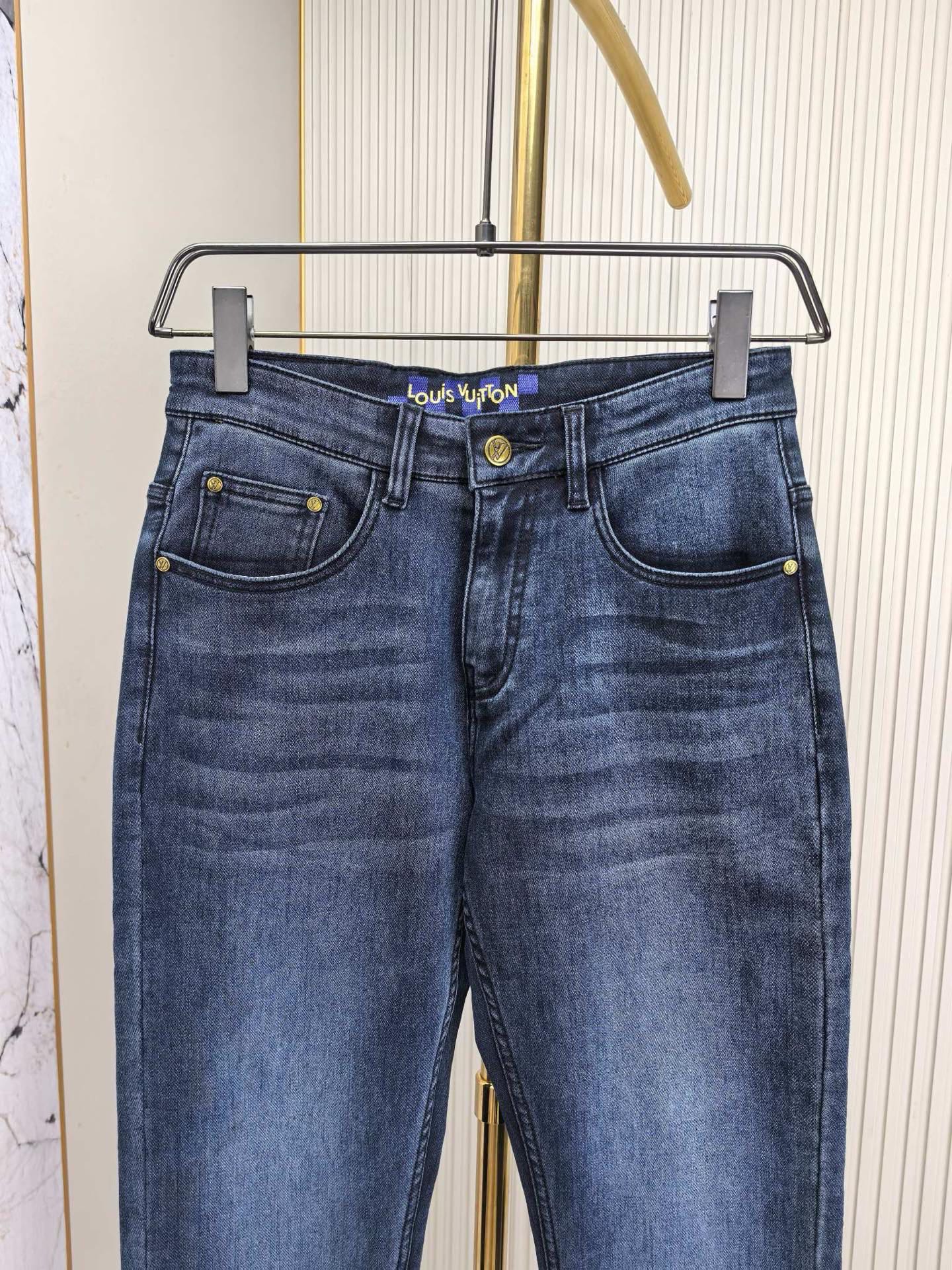 LV 2025 early autumn men's jeans. Heavy wash denim, custom fabric, soft & comfortable. Double washing process, top-notch feel & breathability. Custom hardware logo, premium materials. Great elasticity, low-key design. Sizes 29-40.