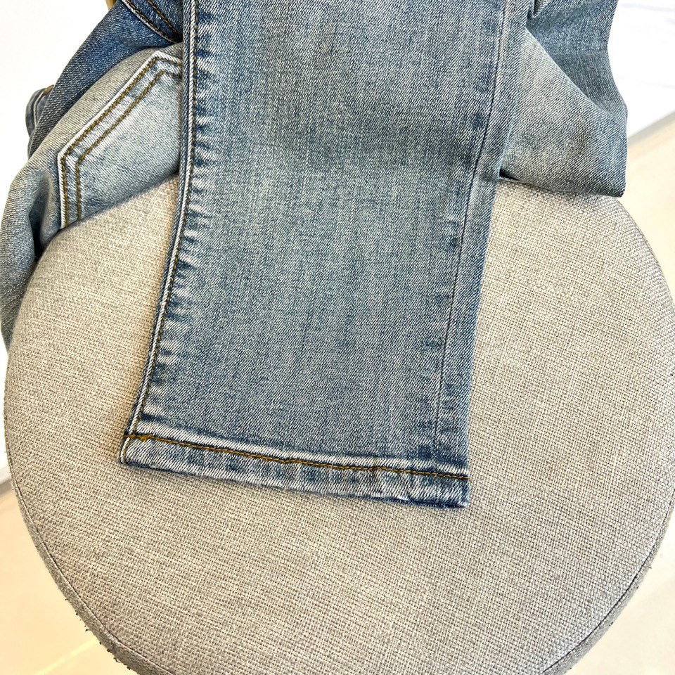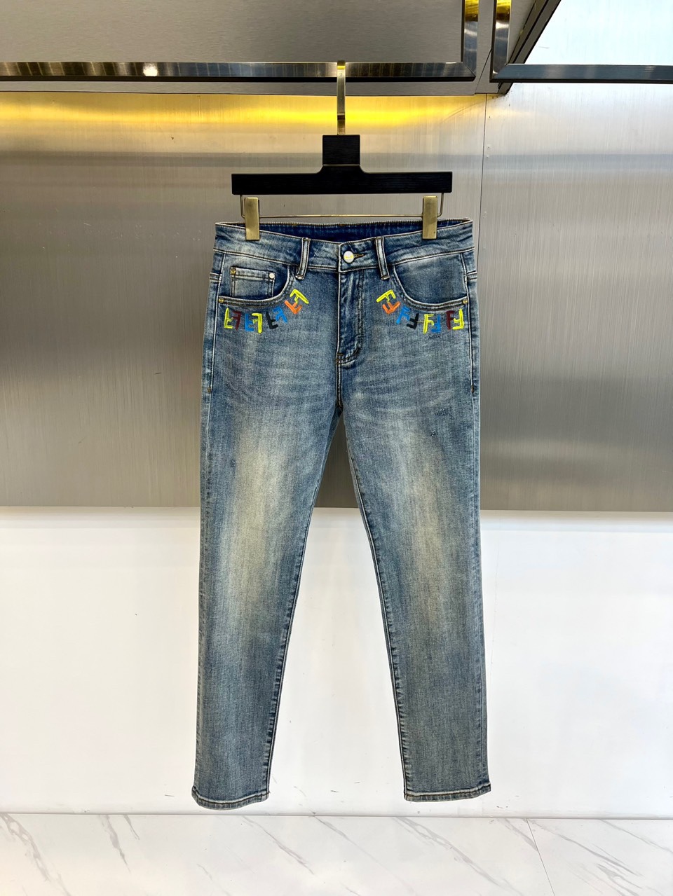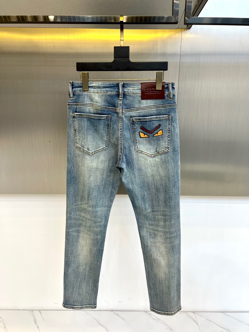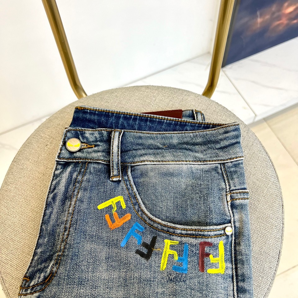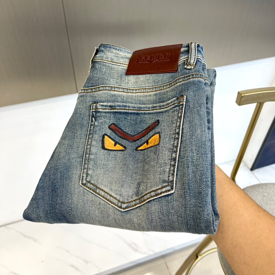 Fendi 2025秋冬 light blue jeans with monster embroidery. High-quality denim, retro finish. Versatile style with leather jackets or knitwear. Combines luxury and playful design. Sizes 29-38 (no 37).