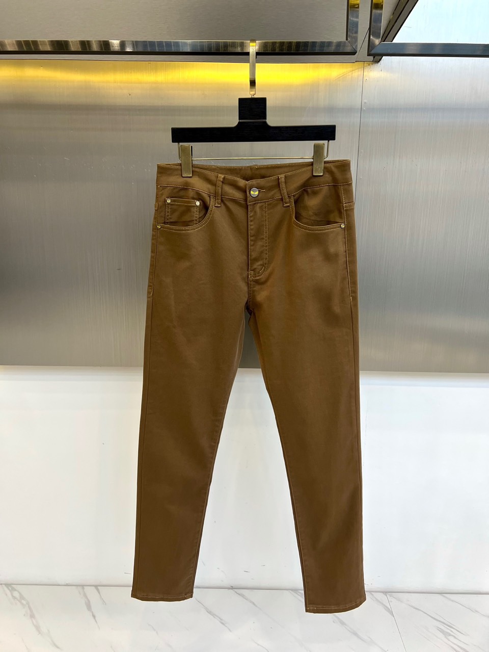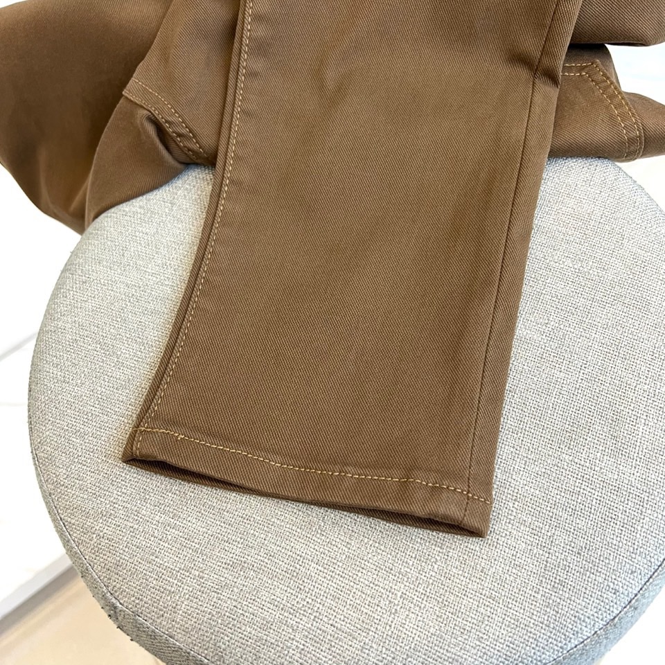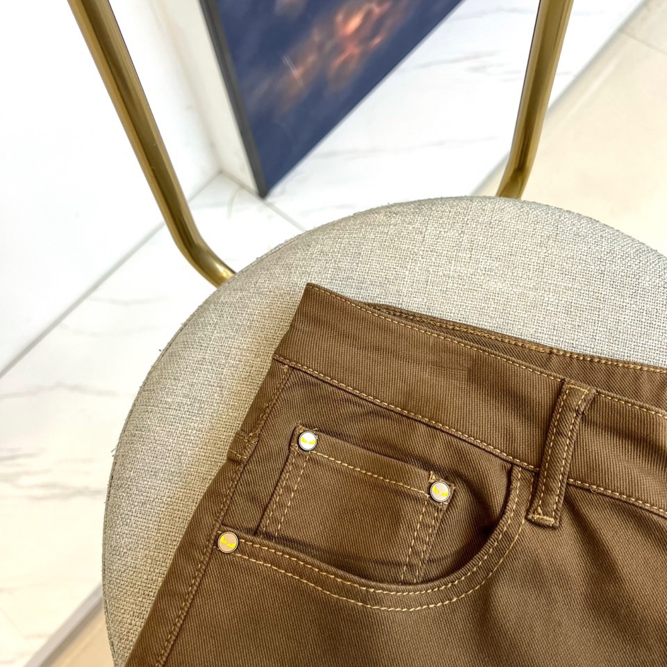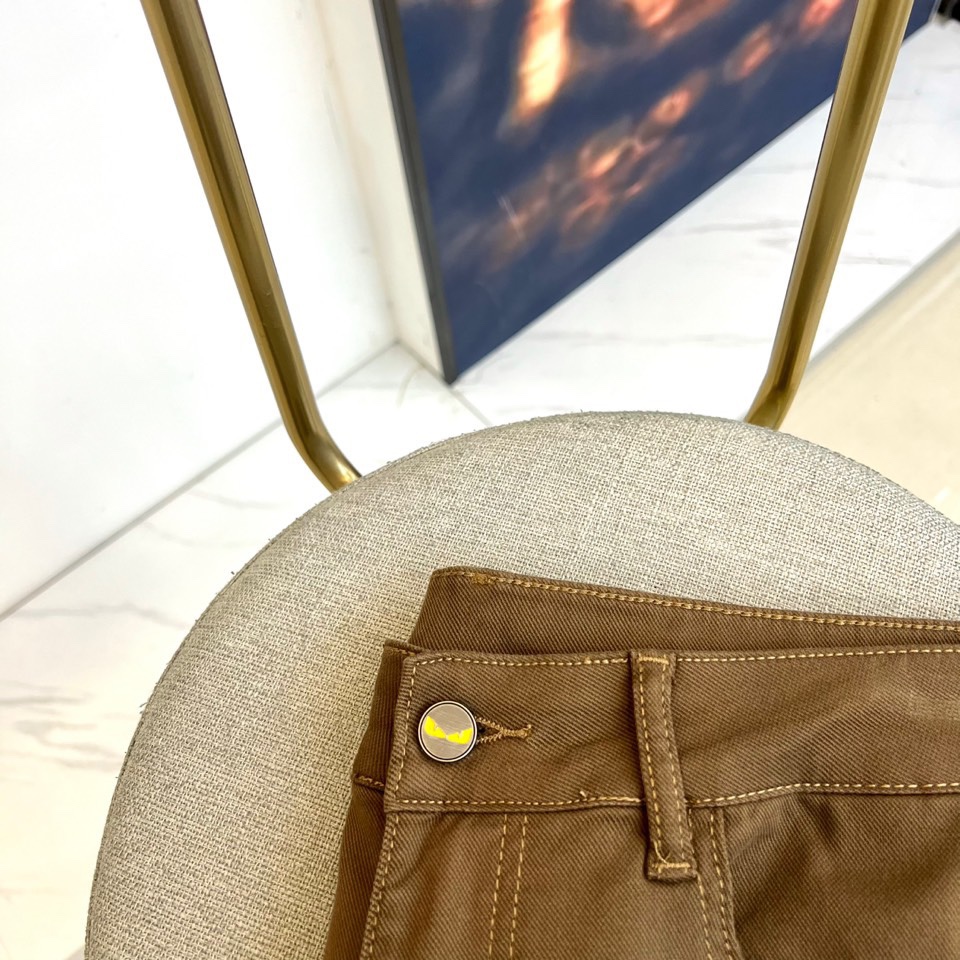 Fendi 2025 AW dark brown jeans. High-quality denim with signature leather patch and metal monster eye clasps. Italian craftsmanship. Combines street style and high fashion. Pairs with coats and leather jackets. Sizes 29-38 (no 37).