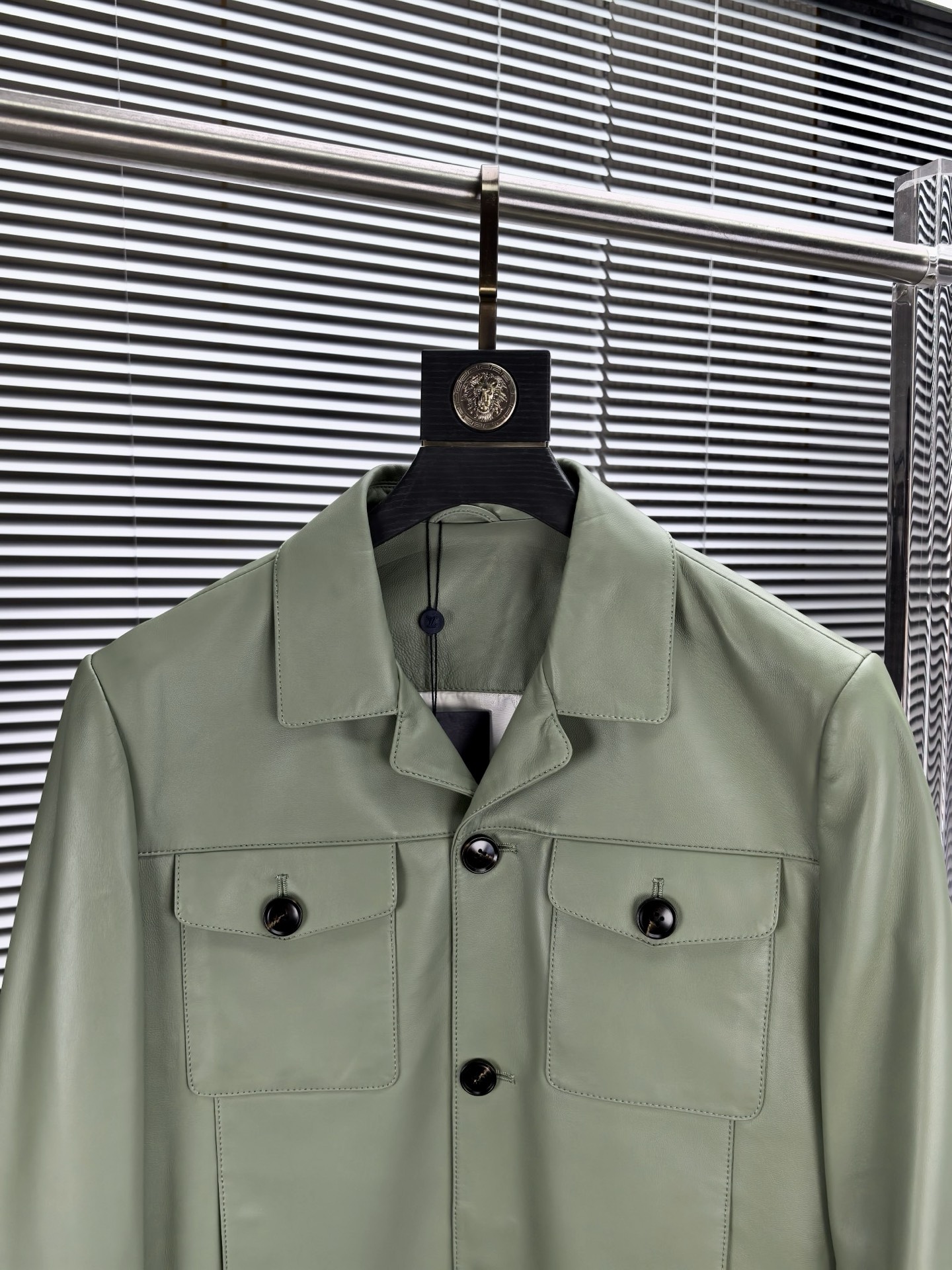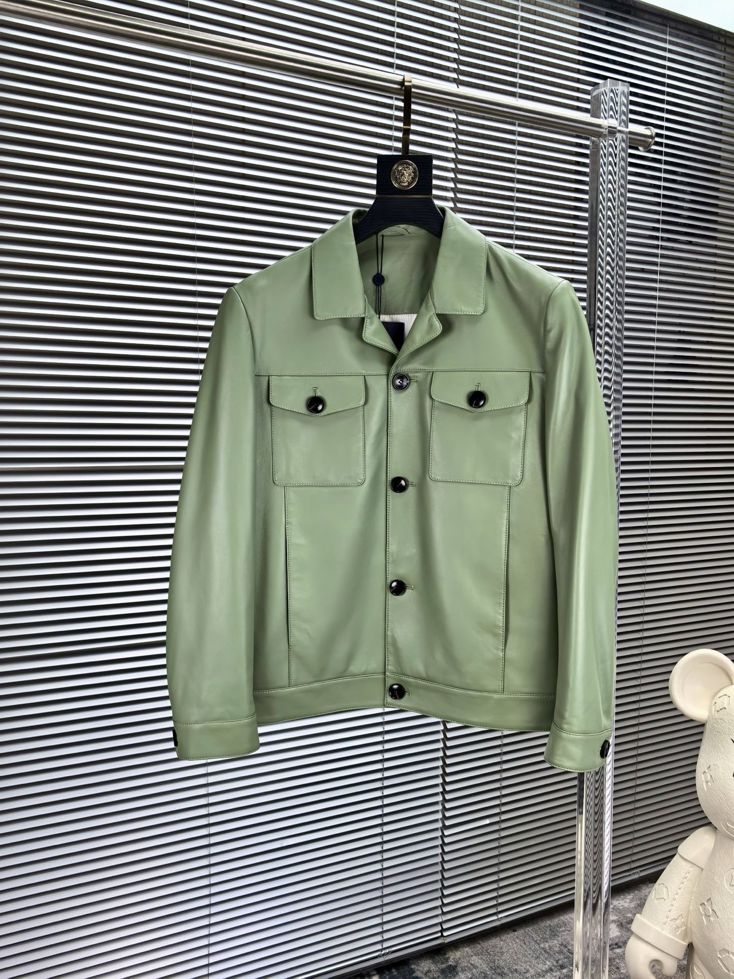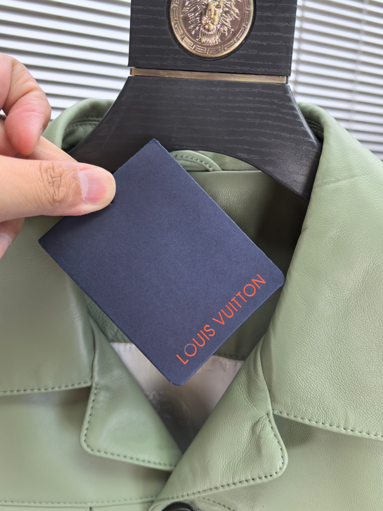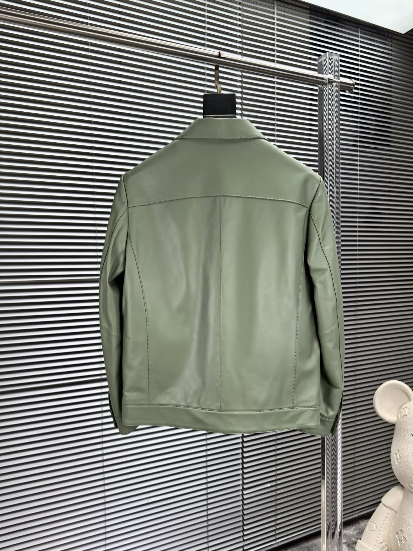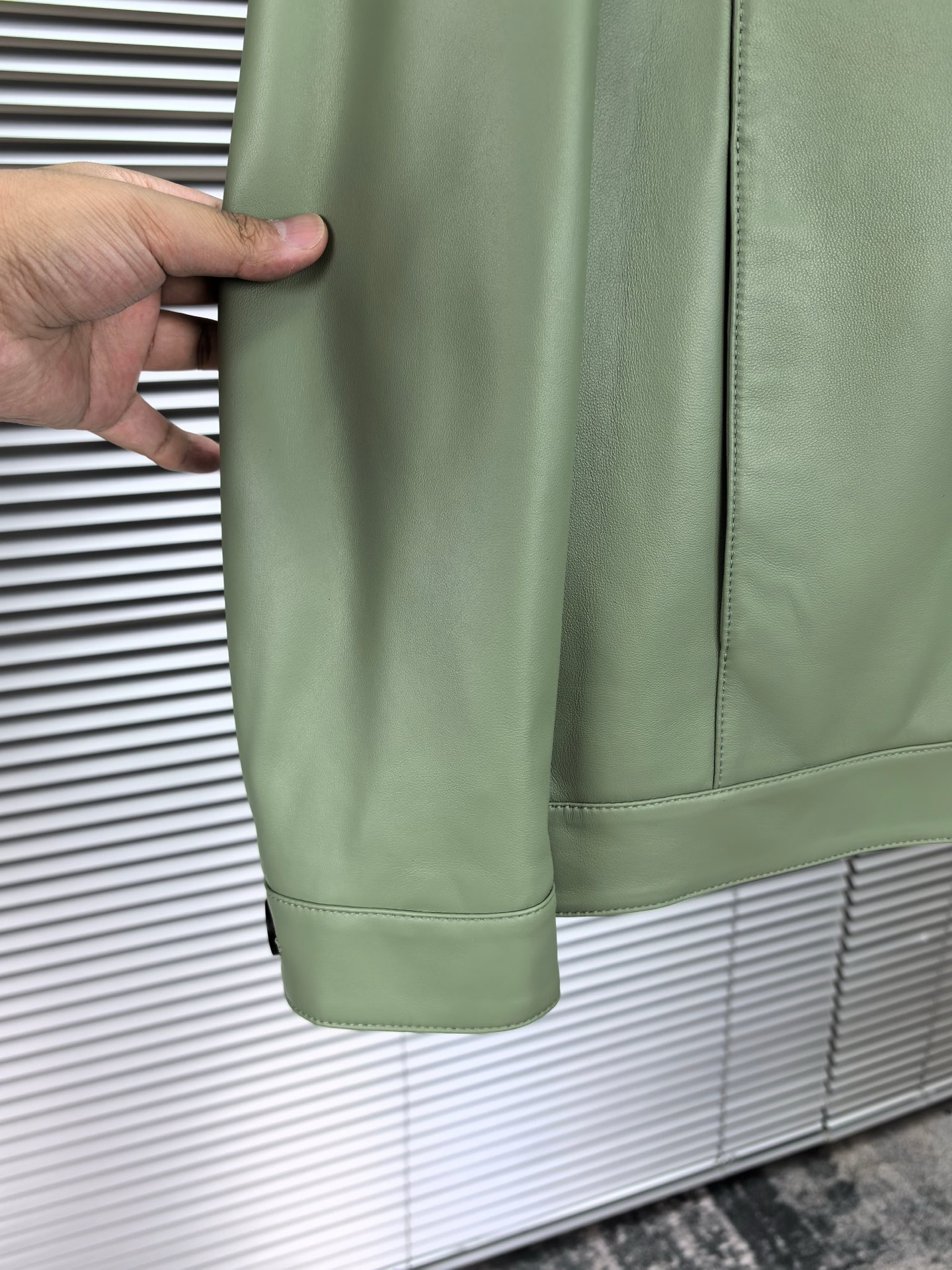 LV Men's 2025 Lamb Leather Jacket. Imported New Zealand sheepskin, soft texture. Matcha green color. Versatile for business/casual wear. Sizes 170-195.