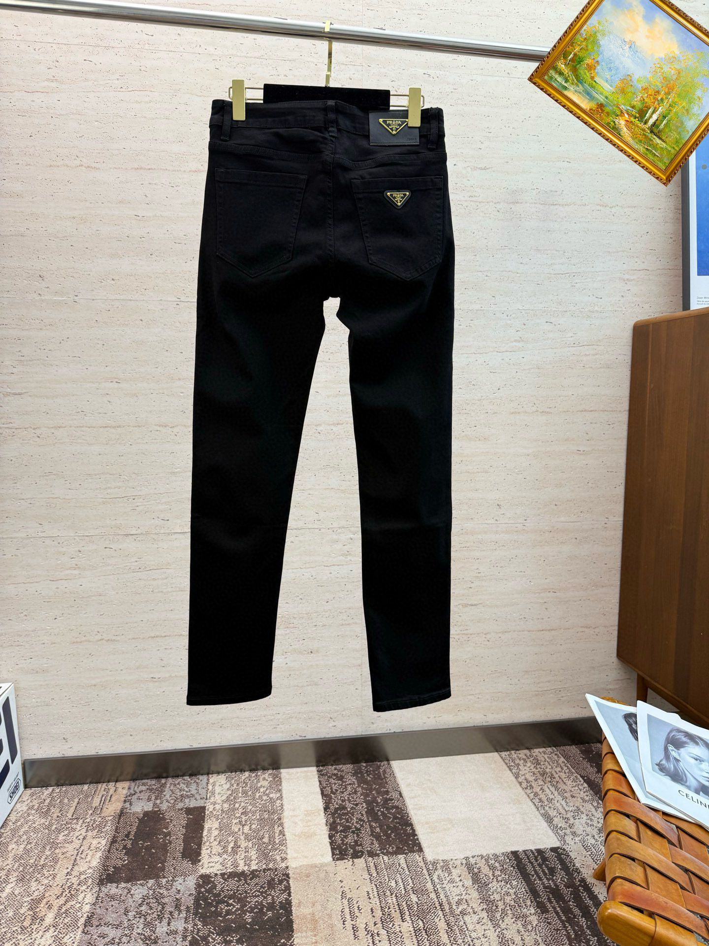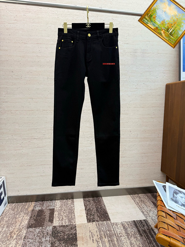 Prada 25S men's straight-leg jeans, spring/autumn style. Made from soft, resilient cotton denim with a dry, textured feel. Features the classic embossed logo. Sizes 29-38.