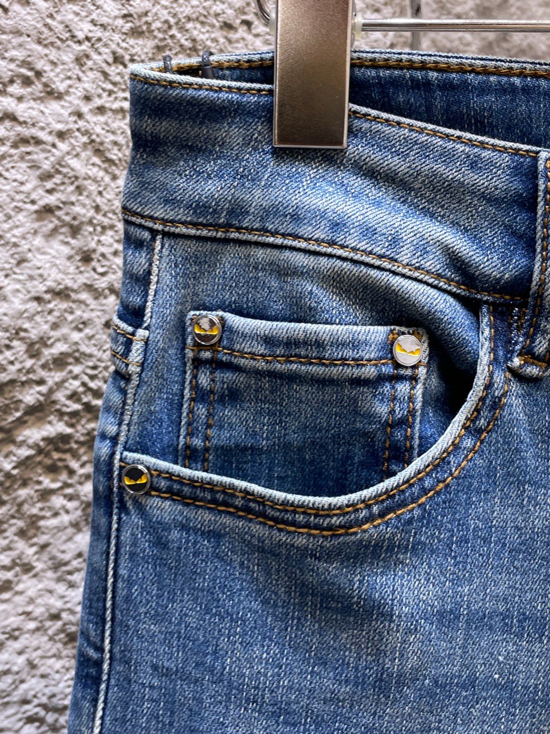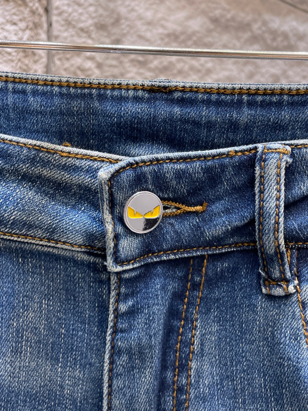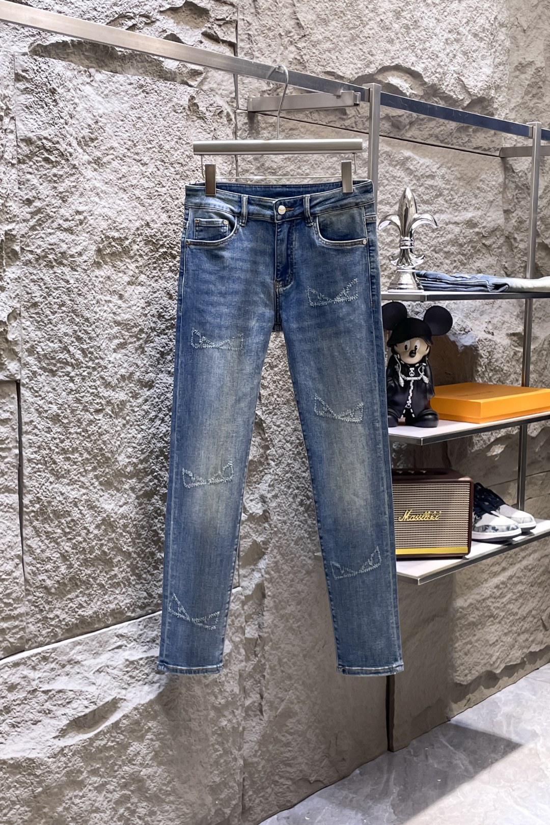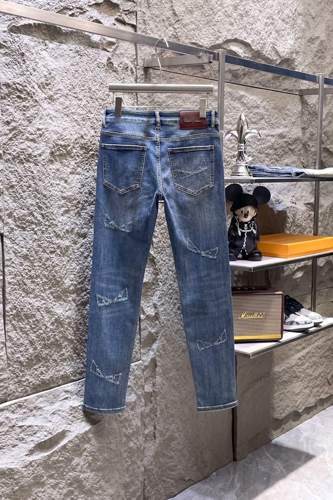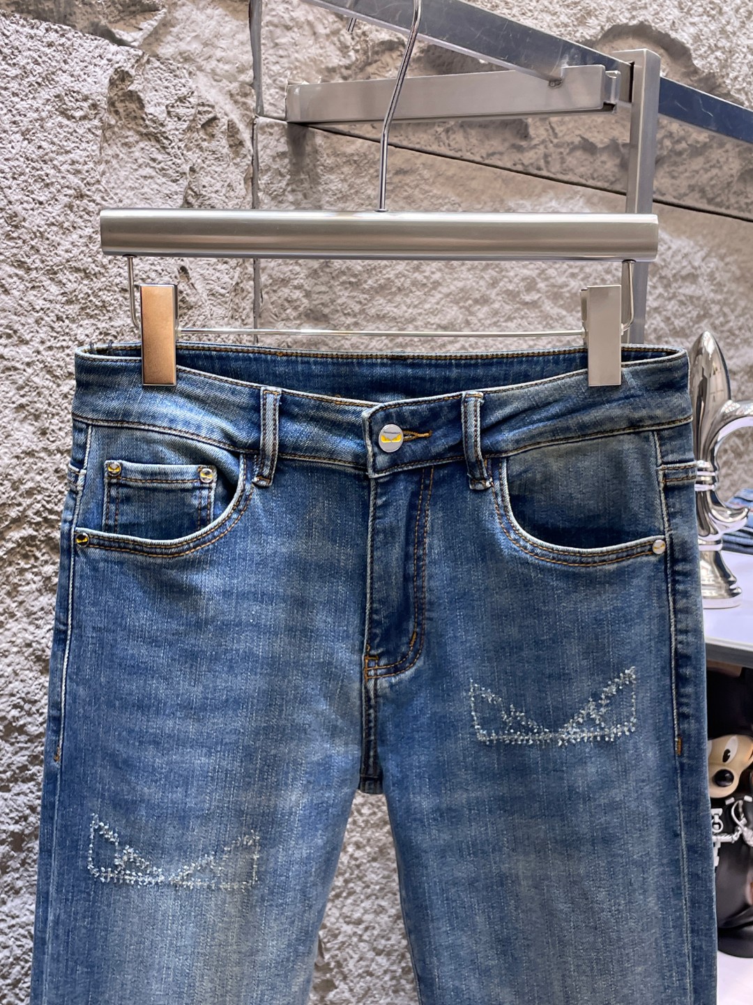 FENDI men's autumn/winter jeans. Imported denim, eco-wash, soft, durable. Slim straight fit, stretchy. Sizes 28-38. Next-day shipping.
