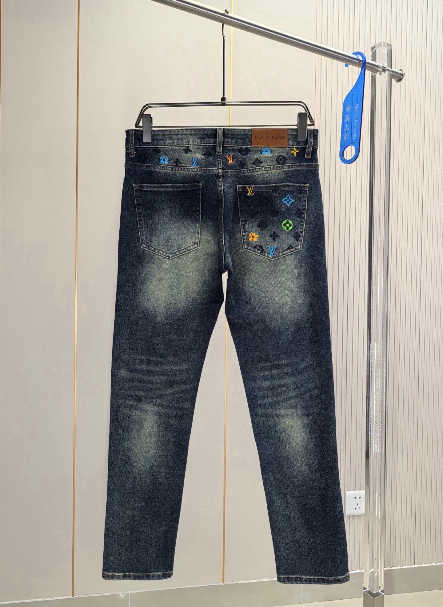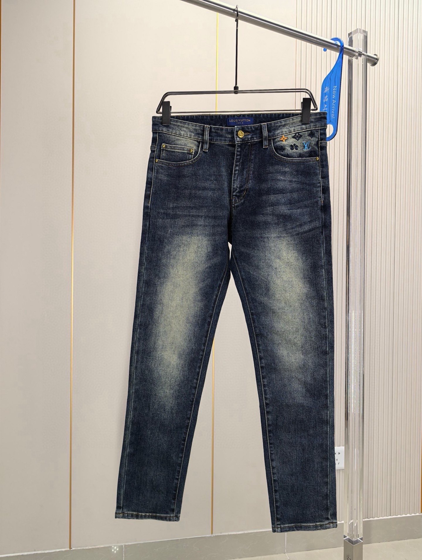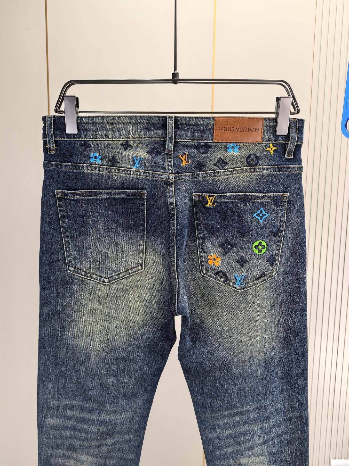 LV 2025 early autumn men's jeans. Heavy wash denim, custom soft fabric. Double washing process, comfortable, breathable. Branded hardware. Sizes 29-38.