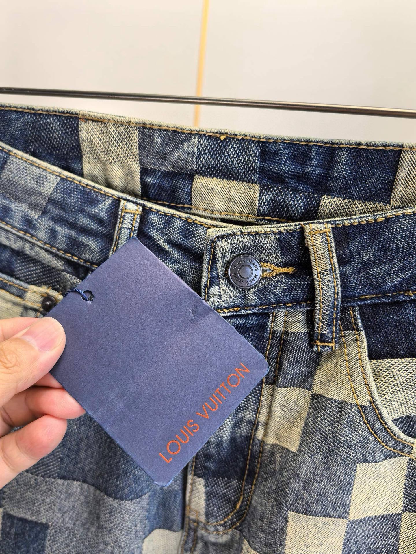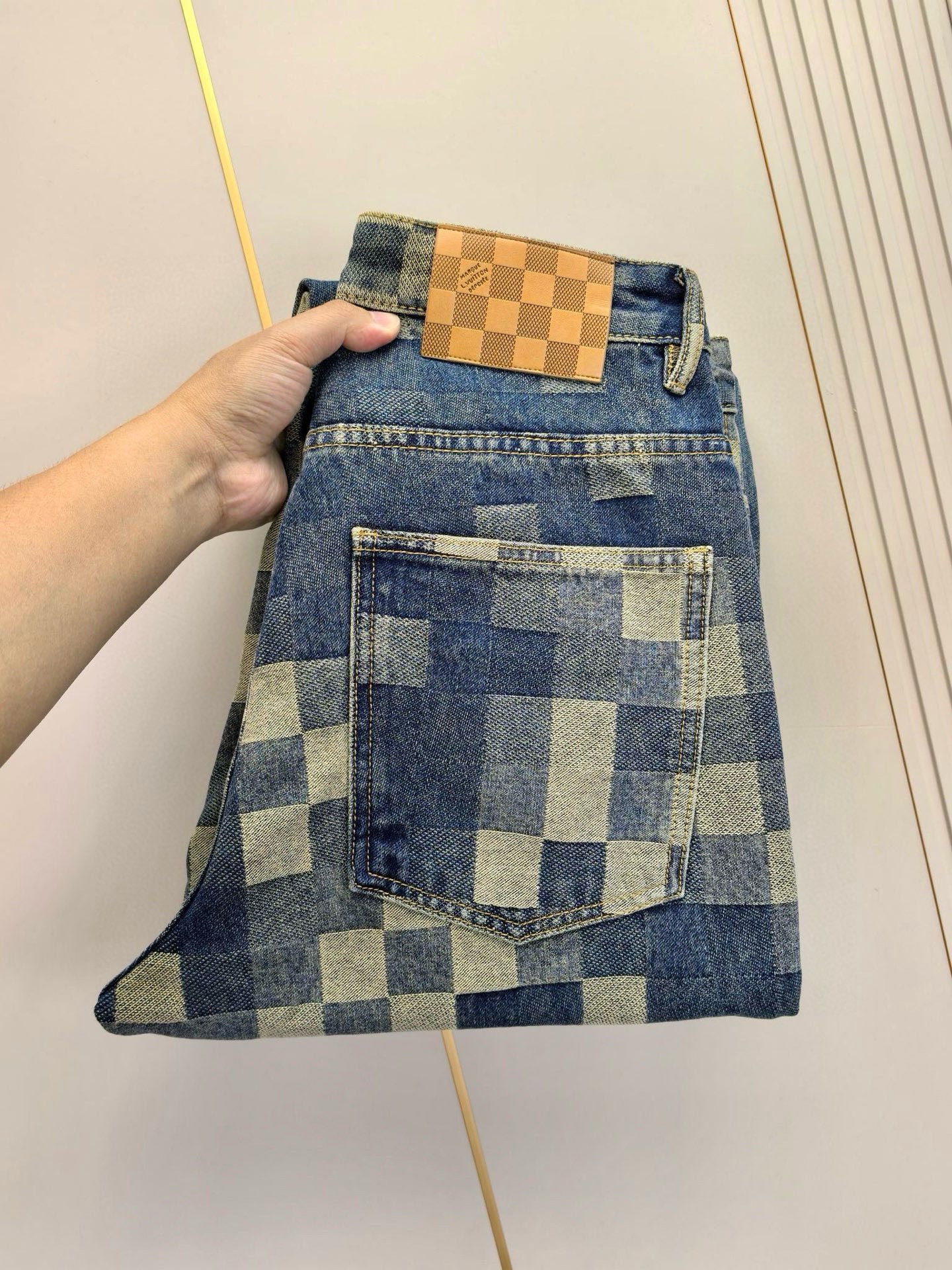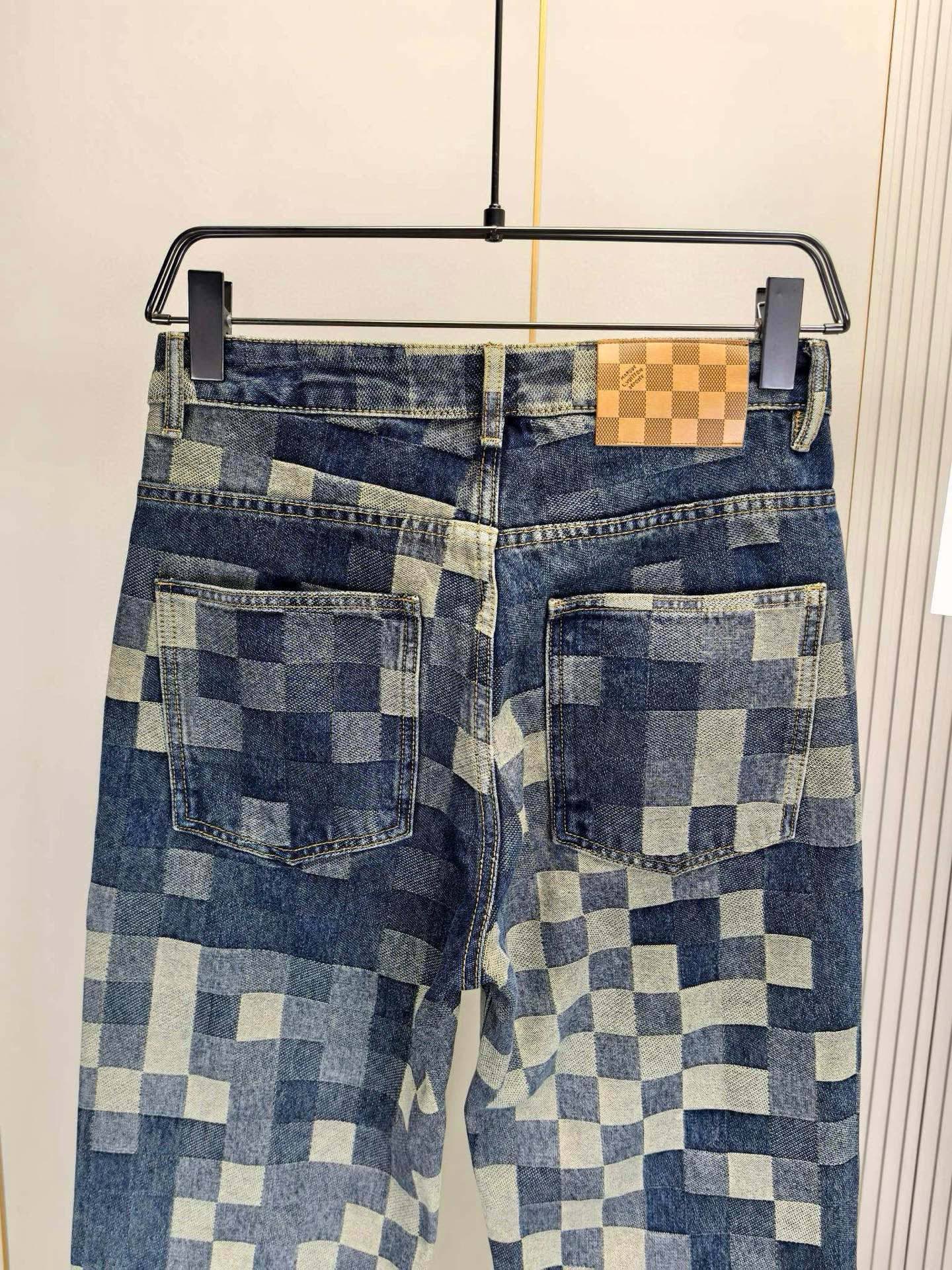 LV brand 2025 autumn/winter embroidered men's jeans. Wide-leg design, custom soft denim with precise grid cutting. Advanced washing for comfort and breathability. Premium hardware. Sizes 28-40.