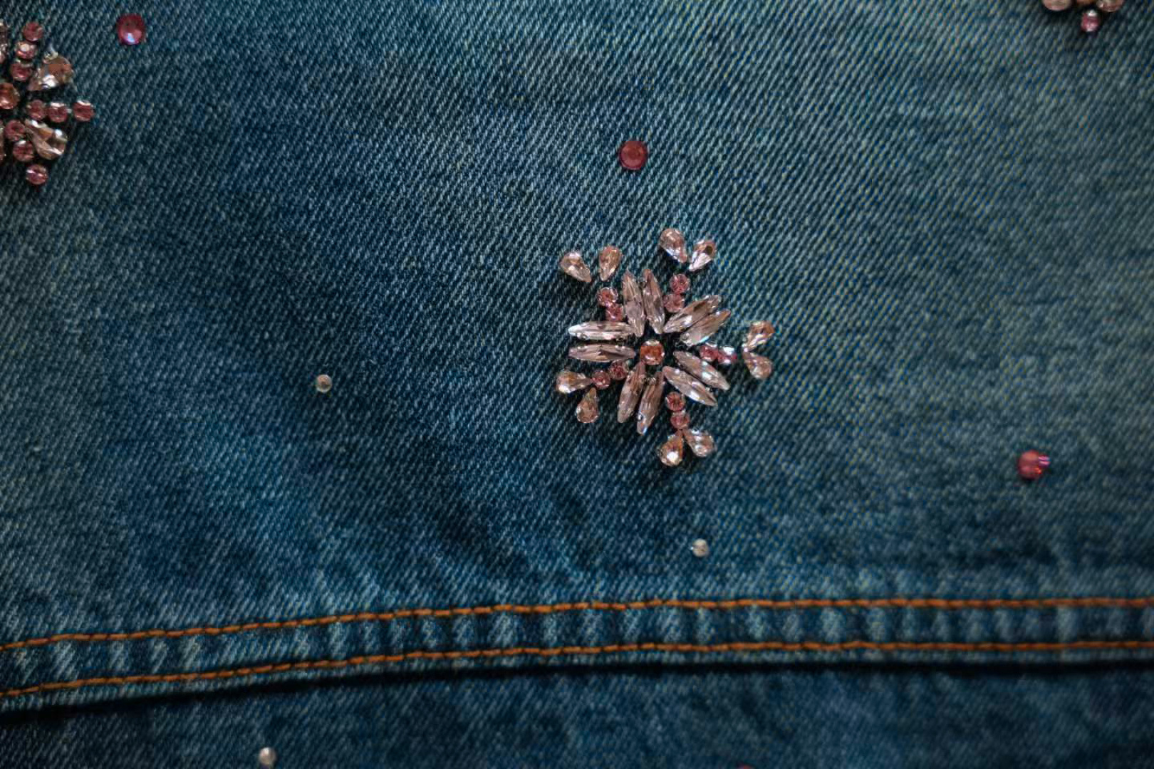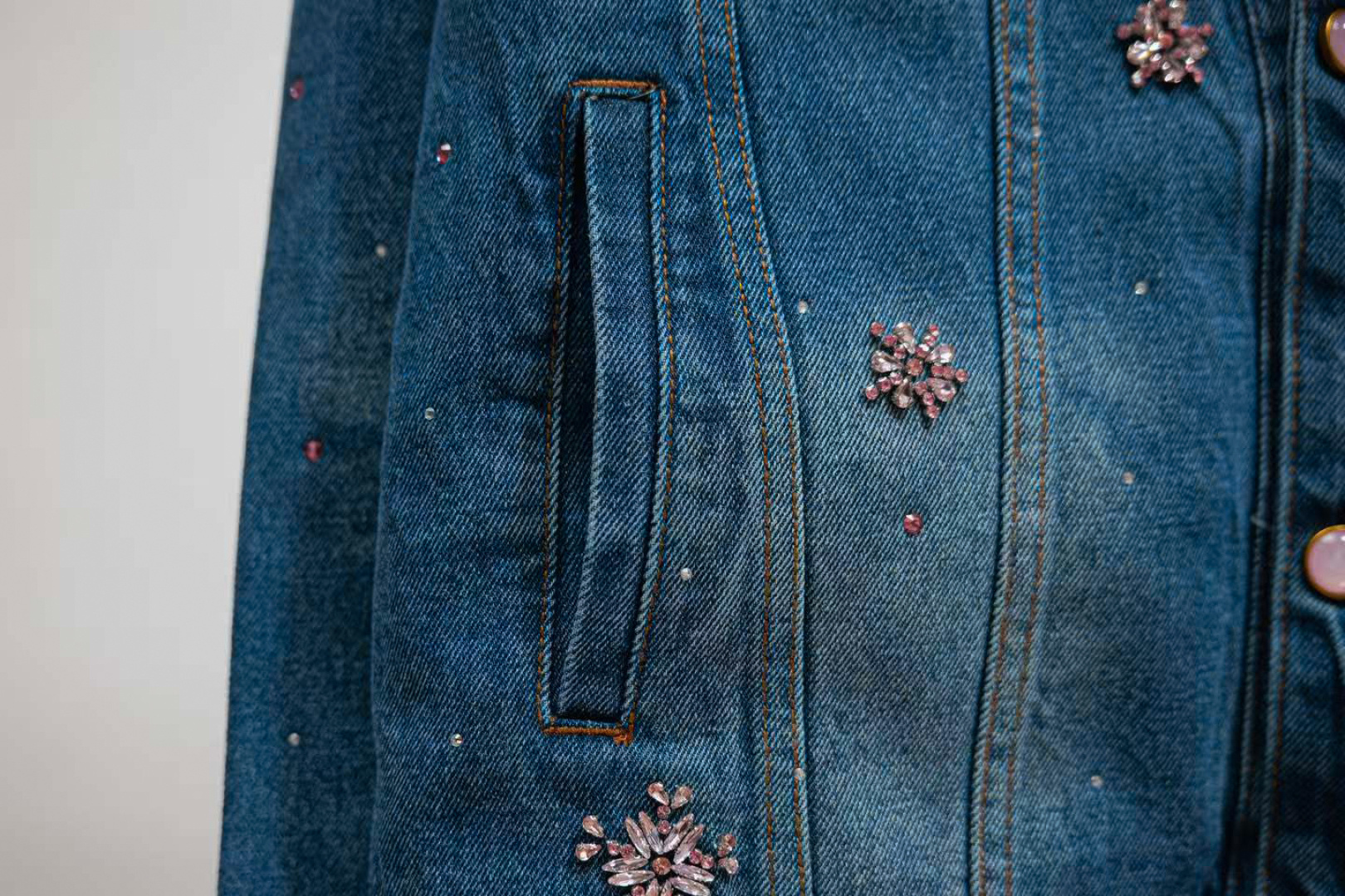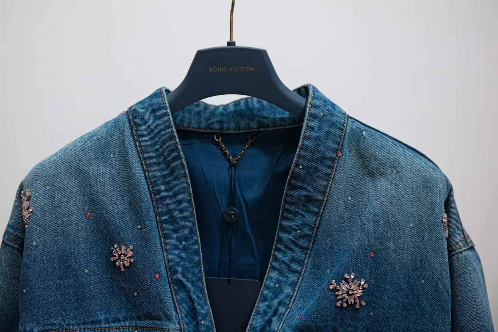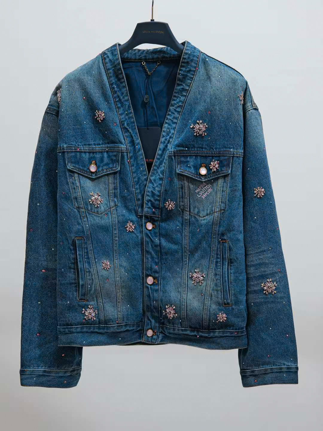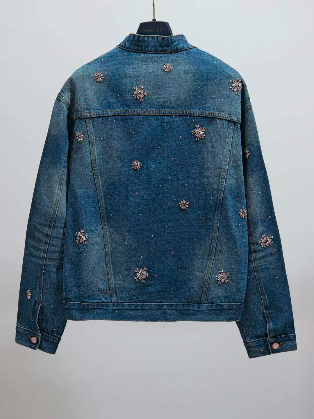 LV denim jacket with hand-embroidered crystal cherry blossoms, "Marque L. Vuitton Déposée" embroidery, Damier leather patch. Indigo. Sizes S/M/L/XL.