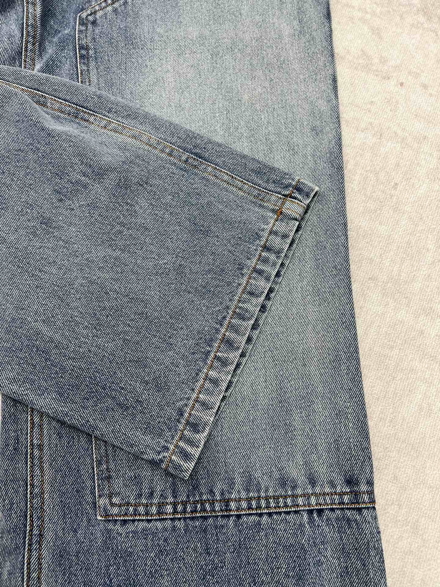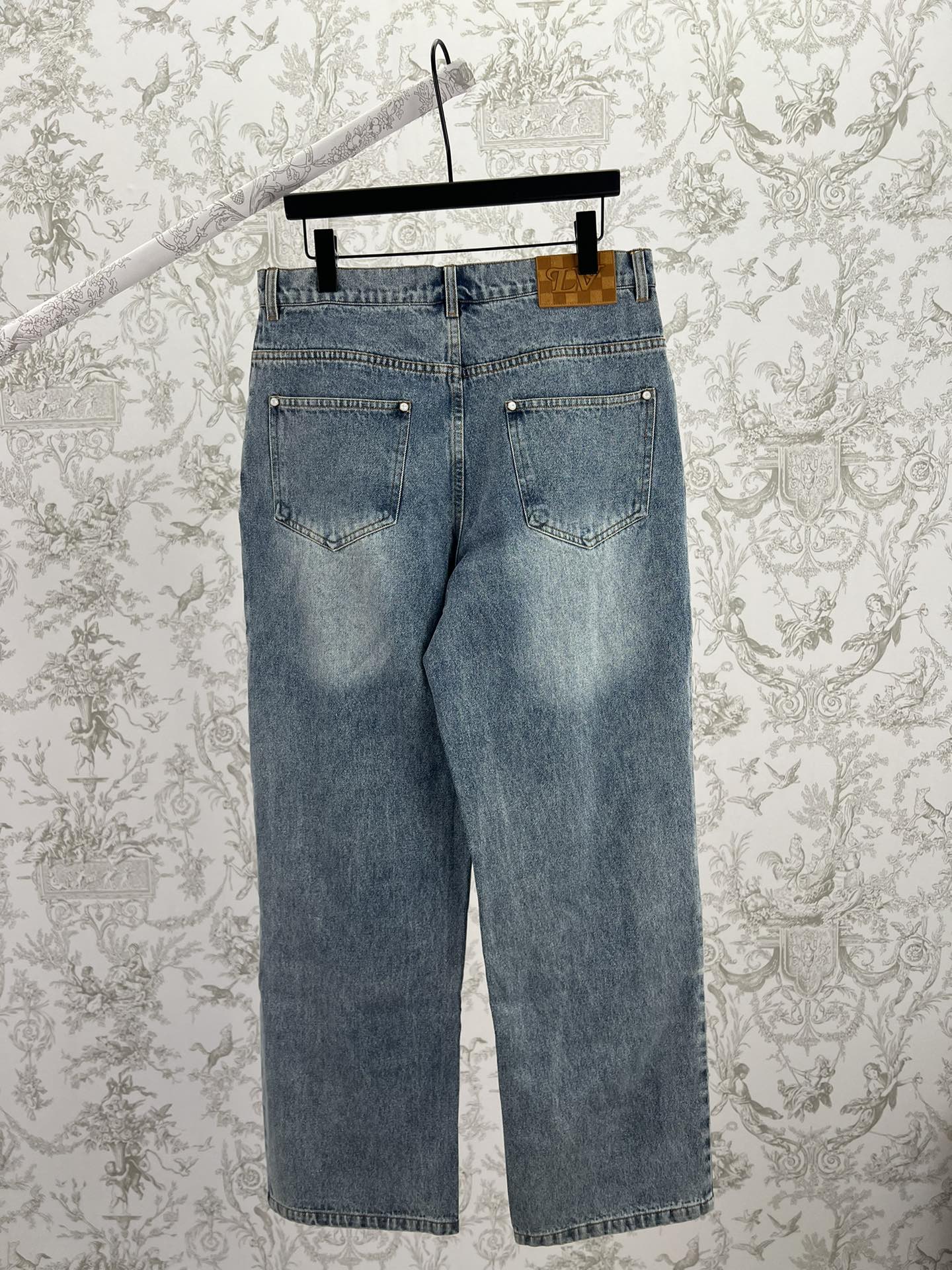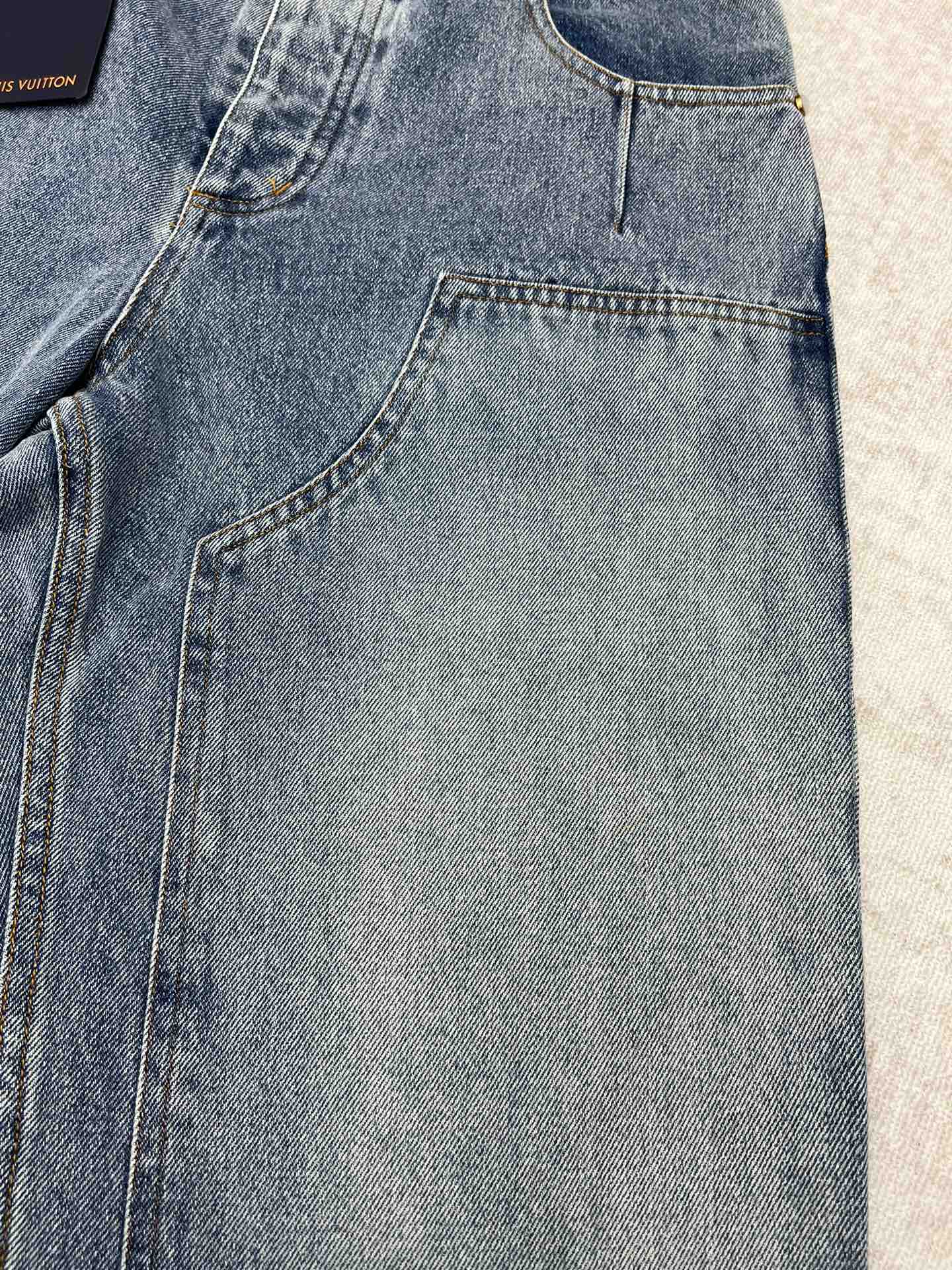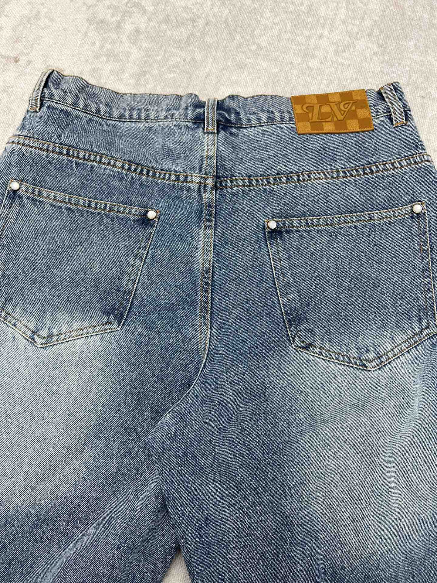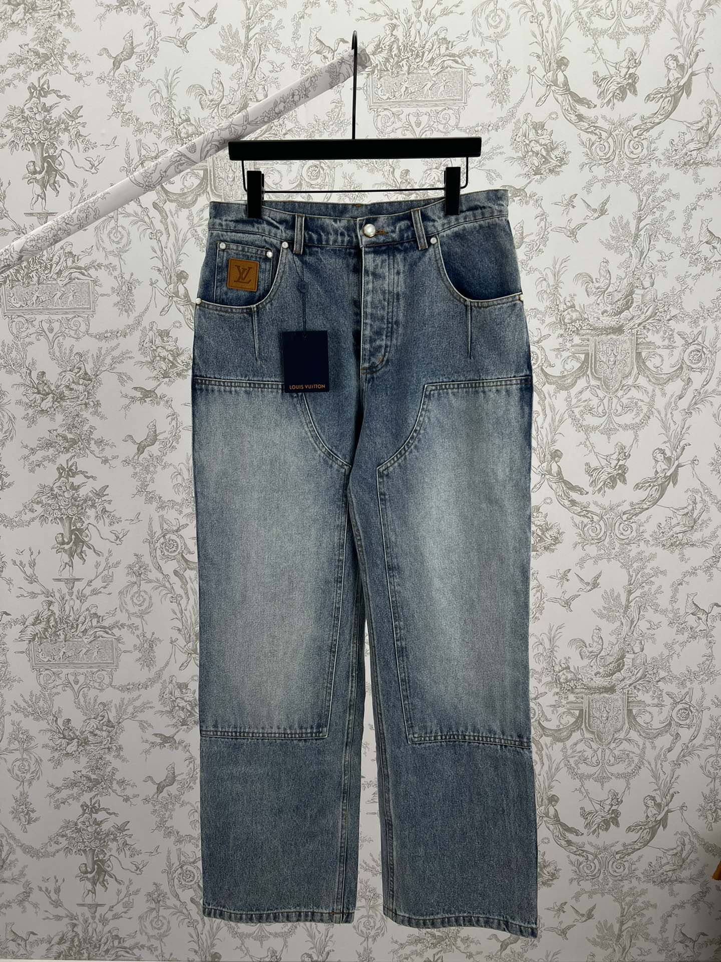 Louis Vuitton 25ss jeans. Suede, skateboard silhouette. LV patch, Mini Damier tags on ticket pocket and back. Pearlized rivets, Damier label. Sizes: S,M,L,XL.