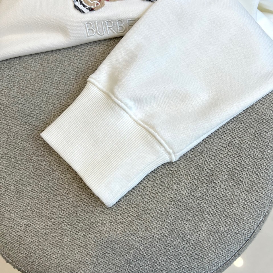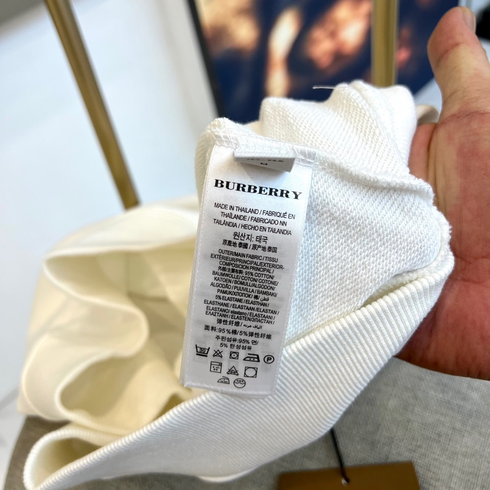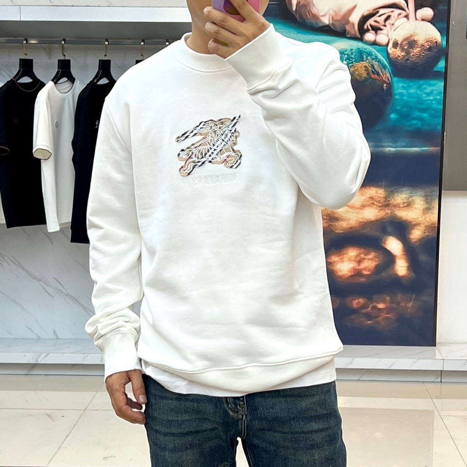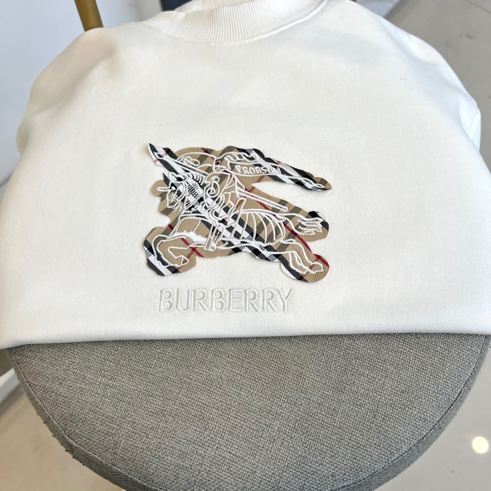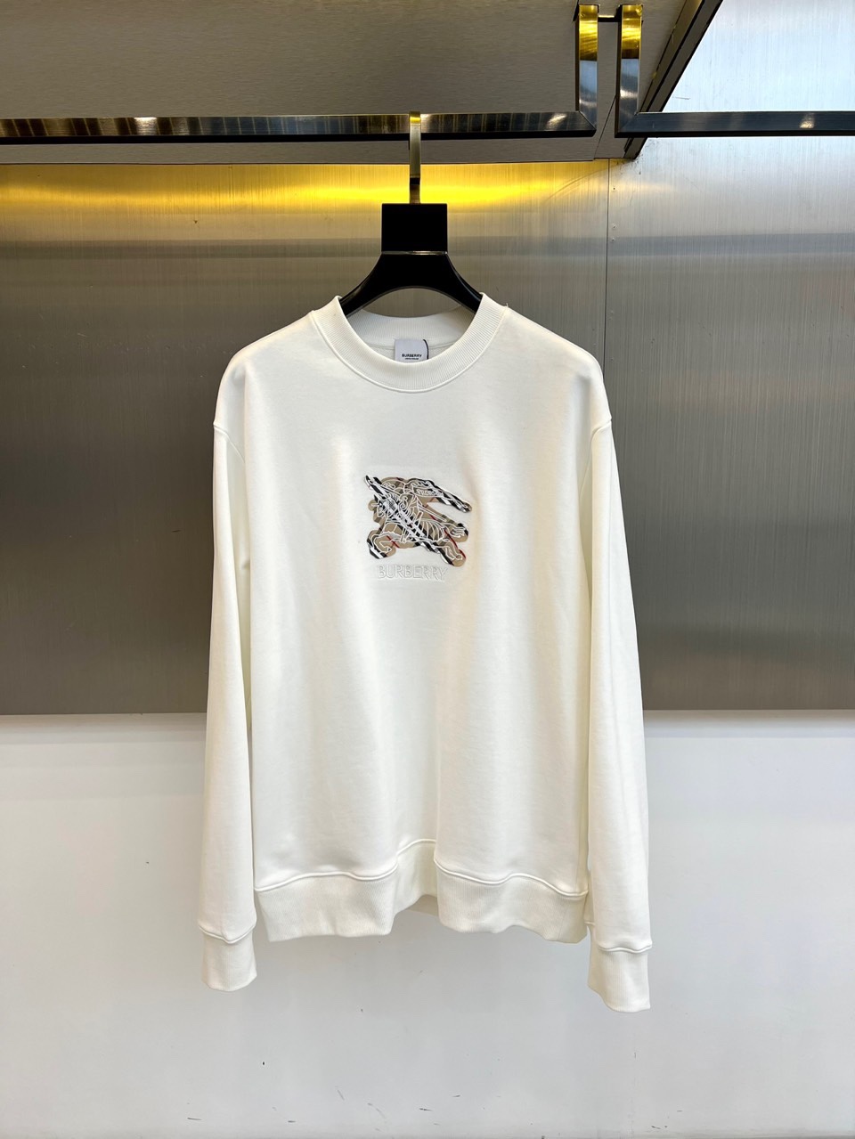 Burberry 2025 autumn-winter crewneck sweatshirt in classic white. Features iconic embroidered knight logo and "BURBERRY" text. Made from high-quality soft cotton with relaxed fit. Combines retro luxury with modern simplicity. Sizes S-XL.