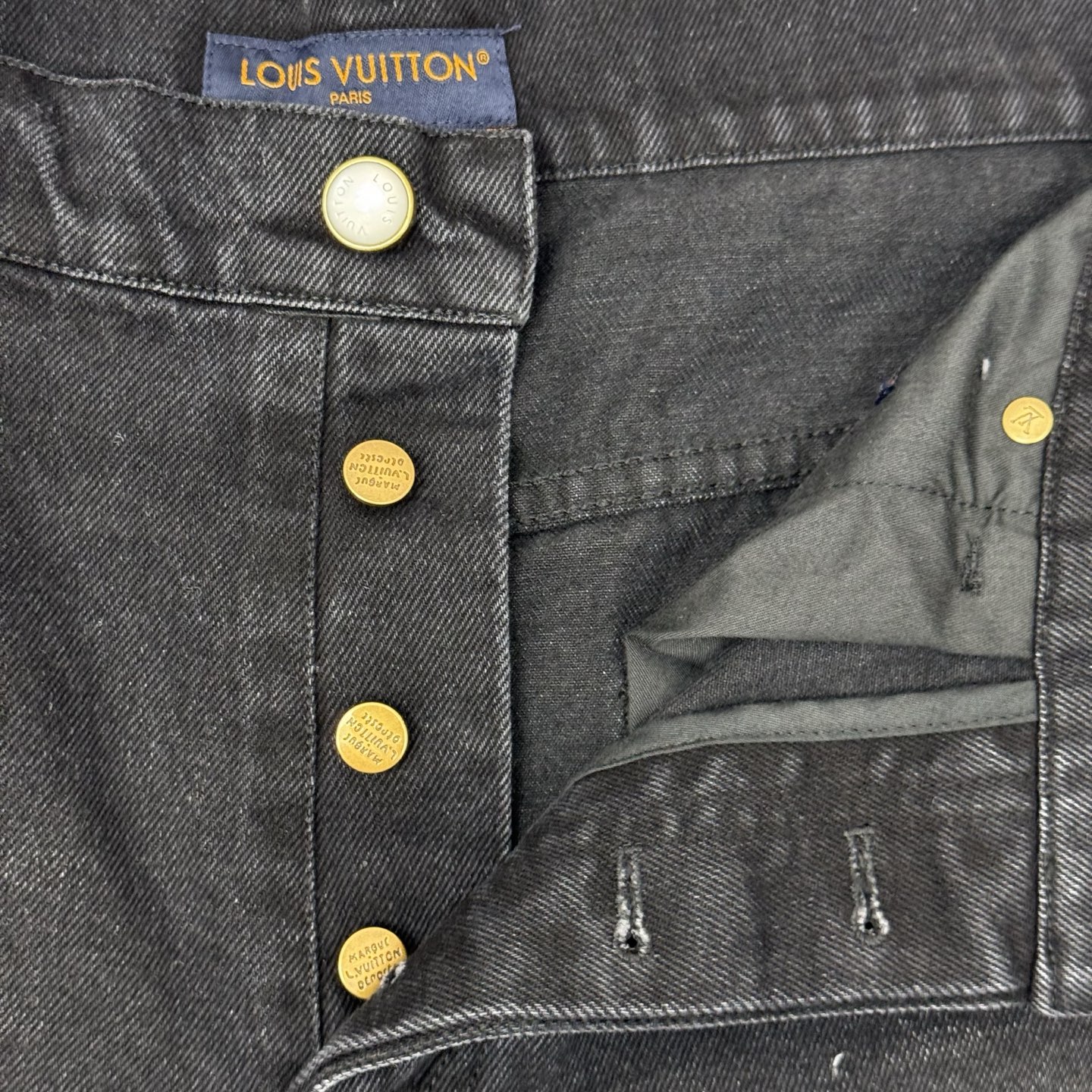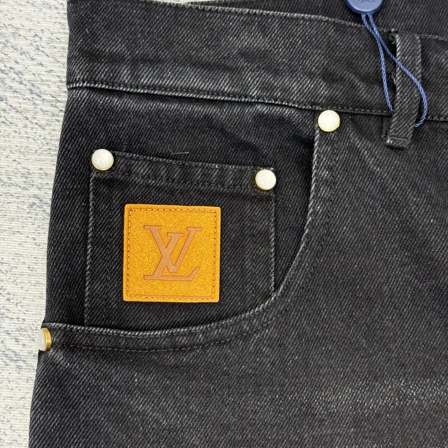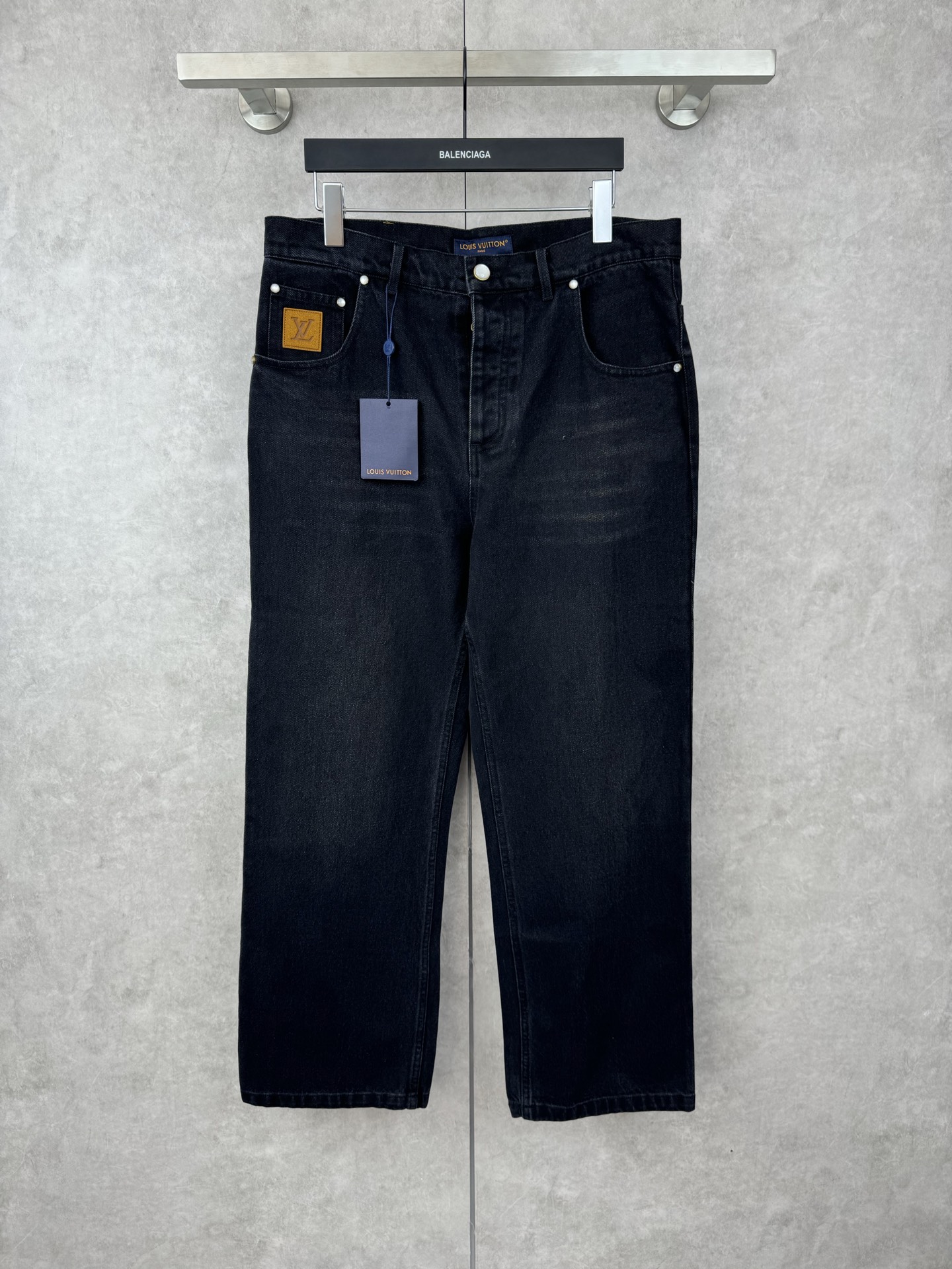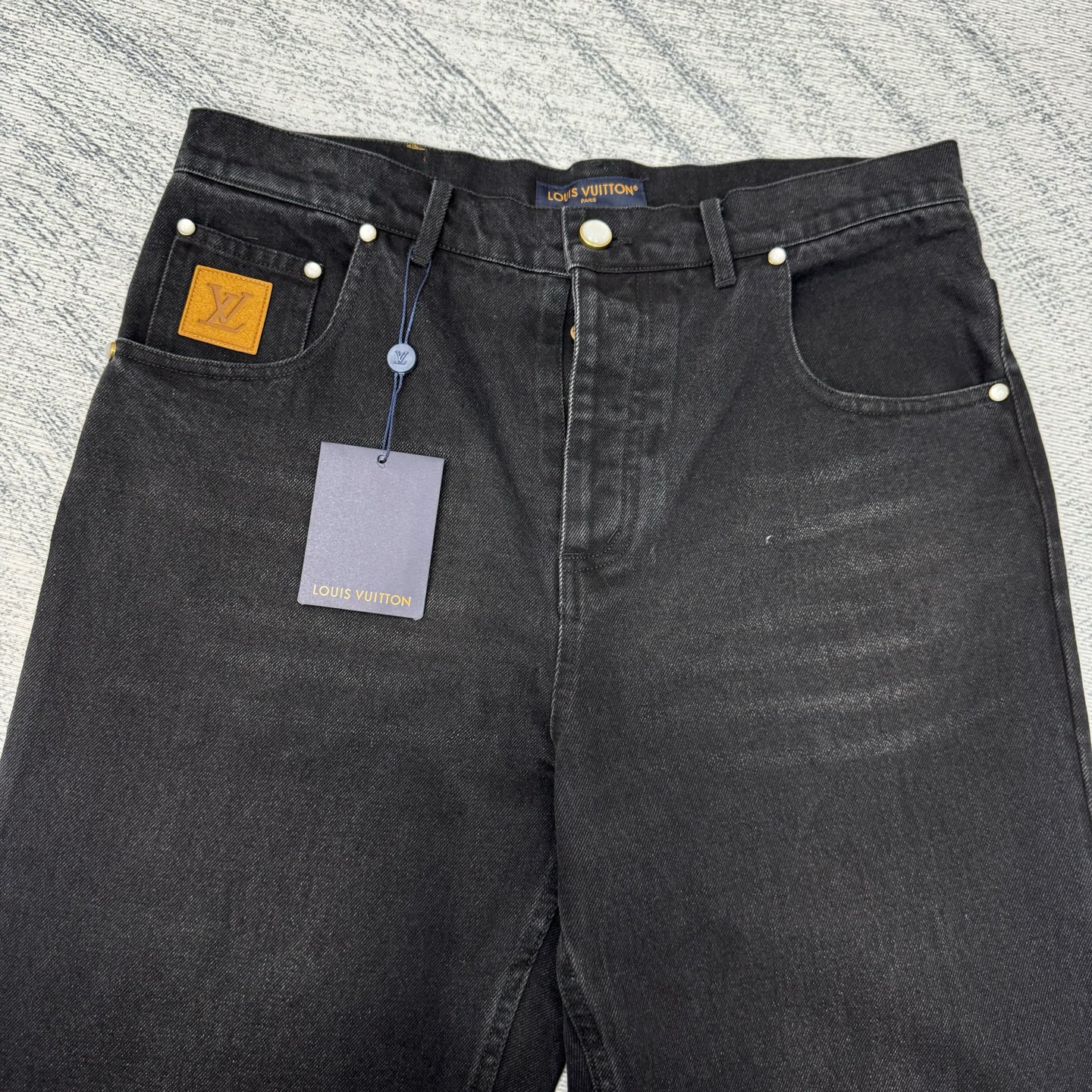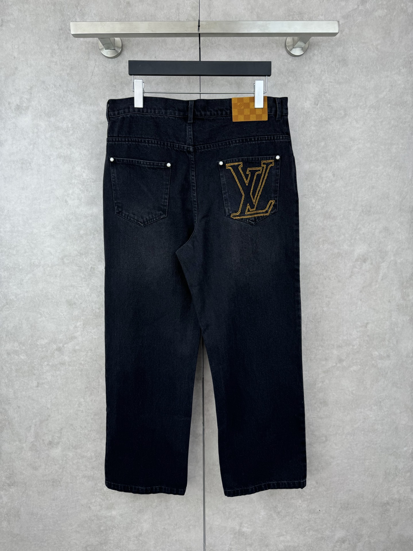 1V 25 new straight-leg washed denim jeans. Custom black-gray denim with LV embroidery, suede patches, pearl buttons, rivets, five-pocket design.