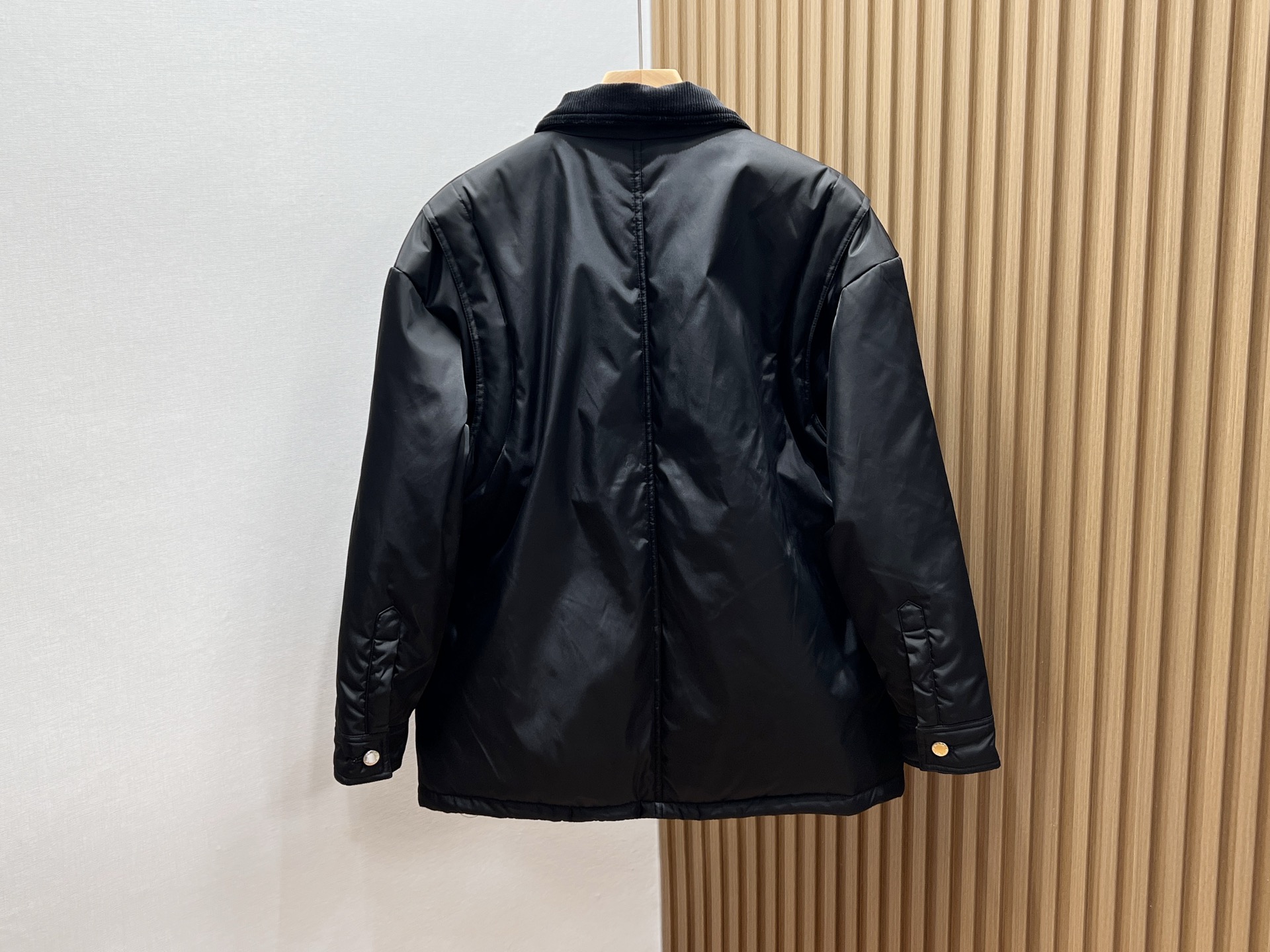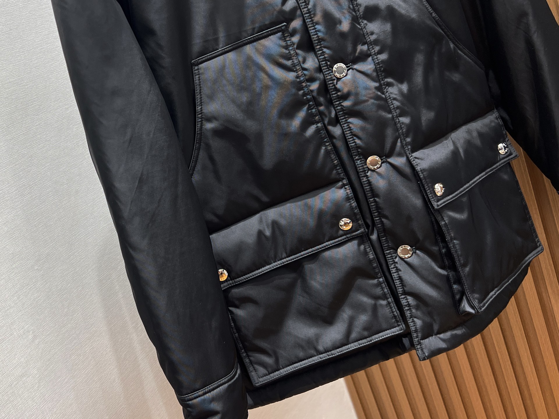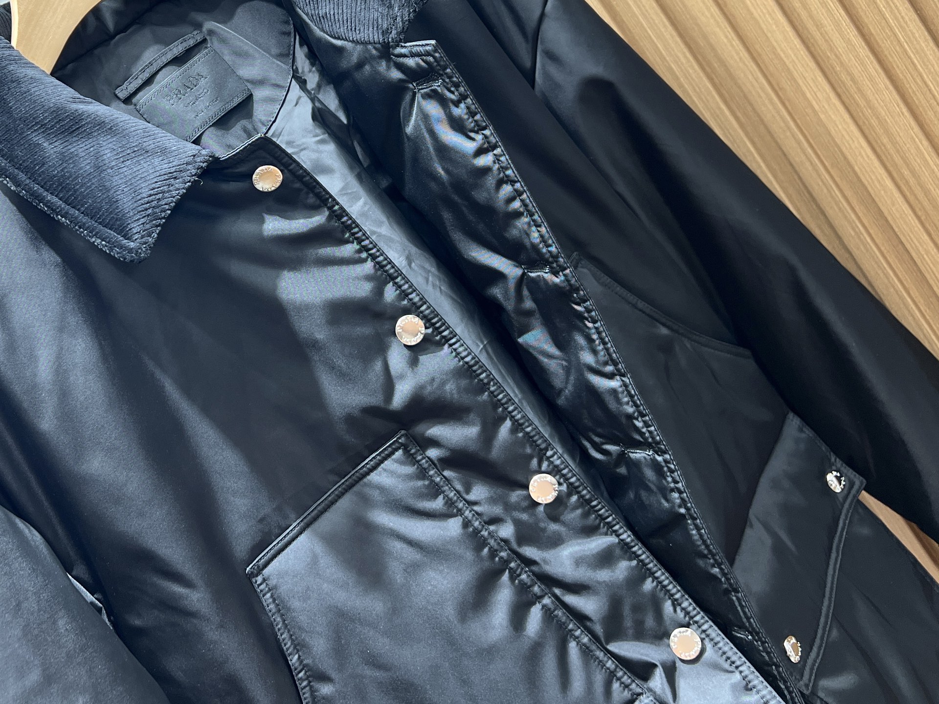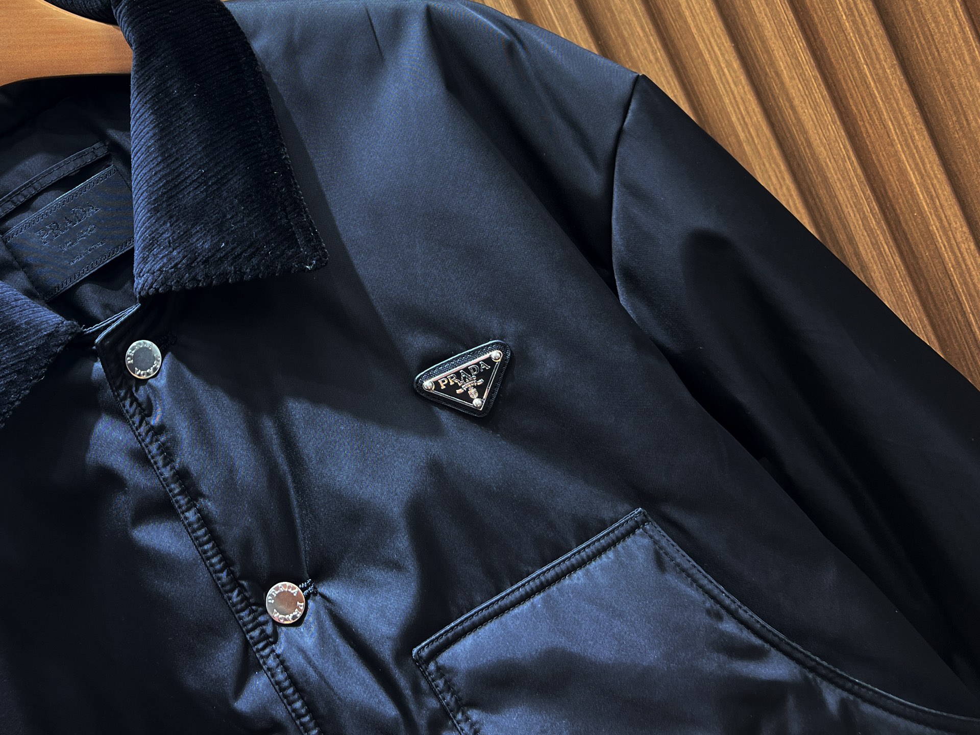 Prada chest pocket jacket: soft, breathable fabric, stylish minimalist cut. Versatile for daily wear, pairs with jeans. Quality stitching and buttons. Available in black sizes 48-56.