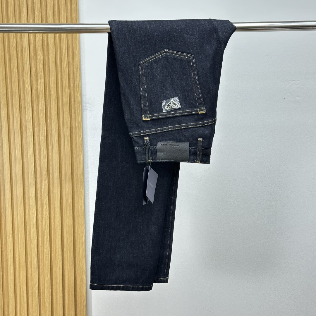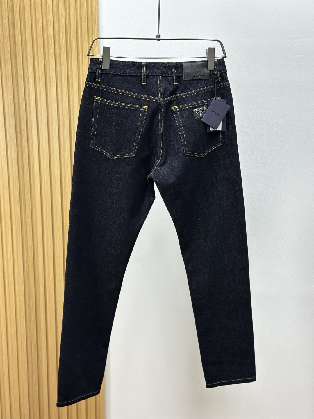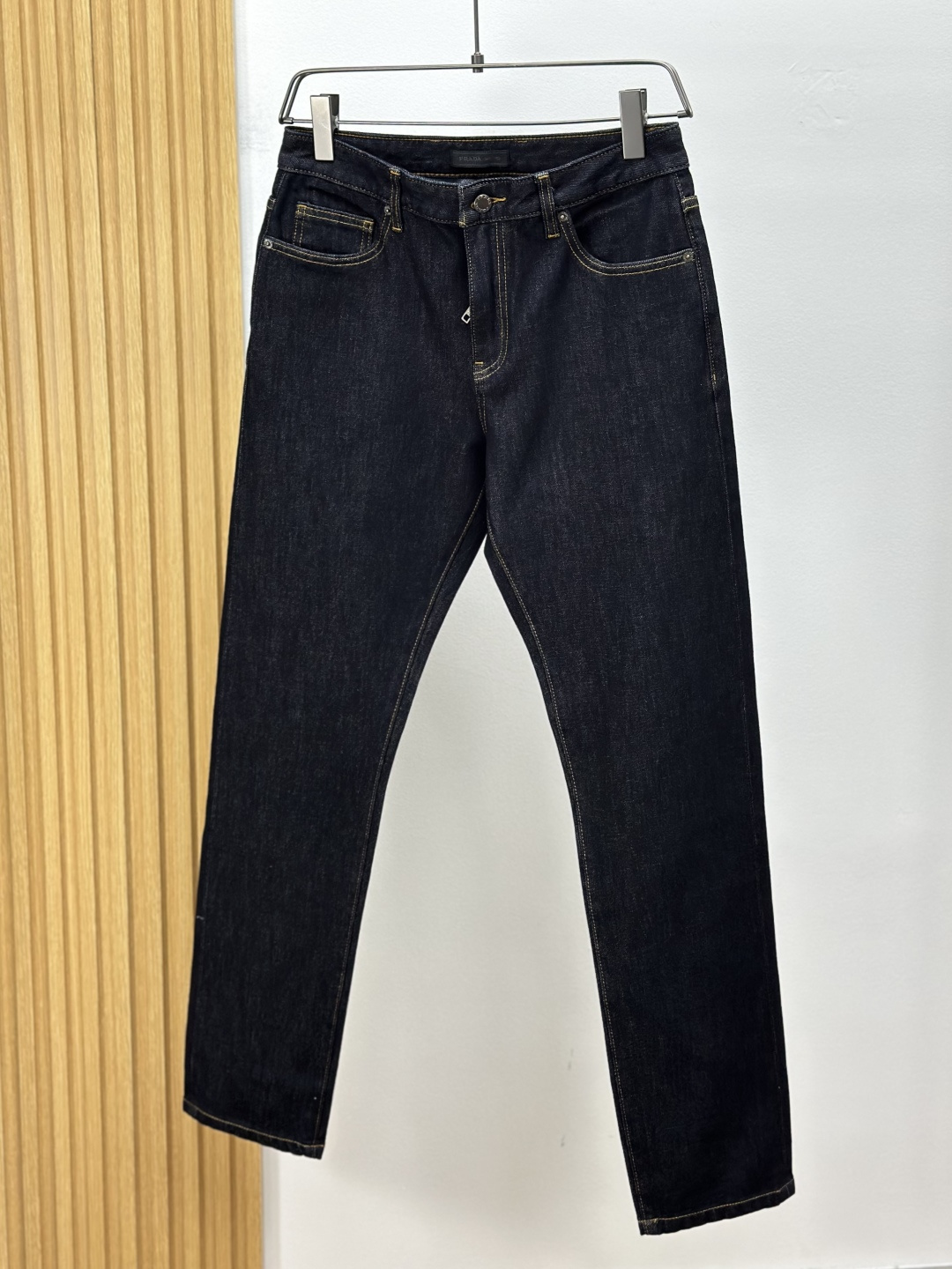 Prada men's slim straight-leg jeans. Classic, elegant, comfortable, and breathable. Features the iconic triangle logo. Timeless design for the sophisticated urban man. Sizes: 29-38 (no 35).