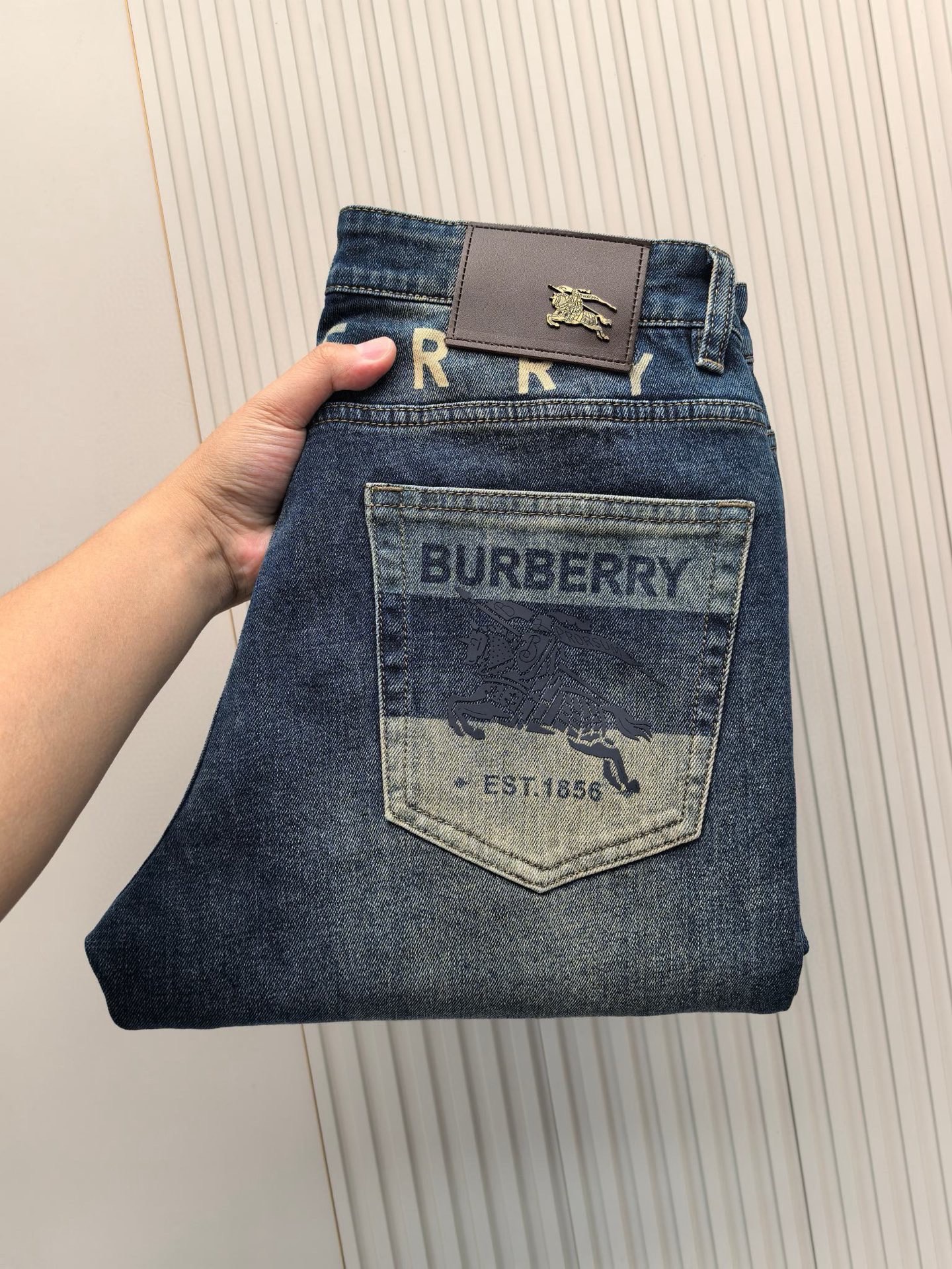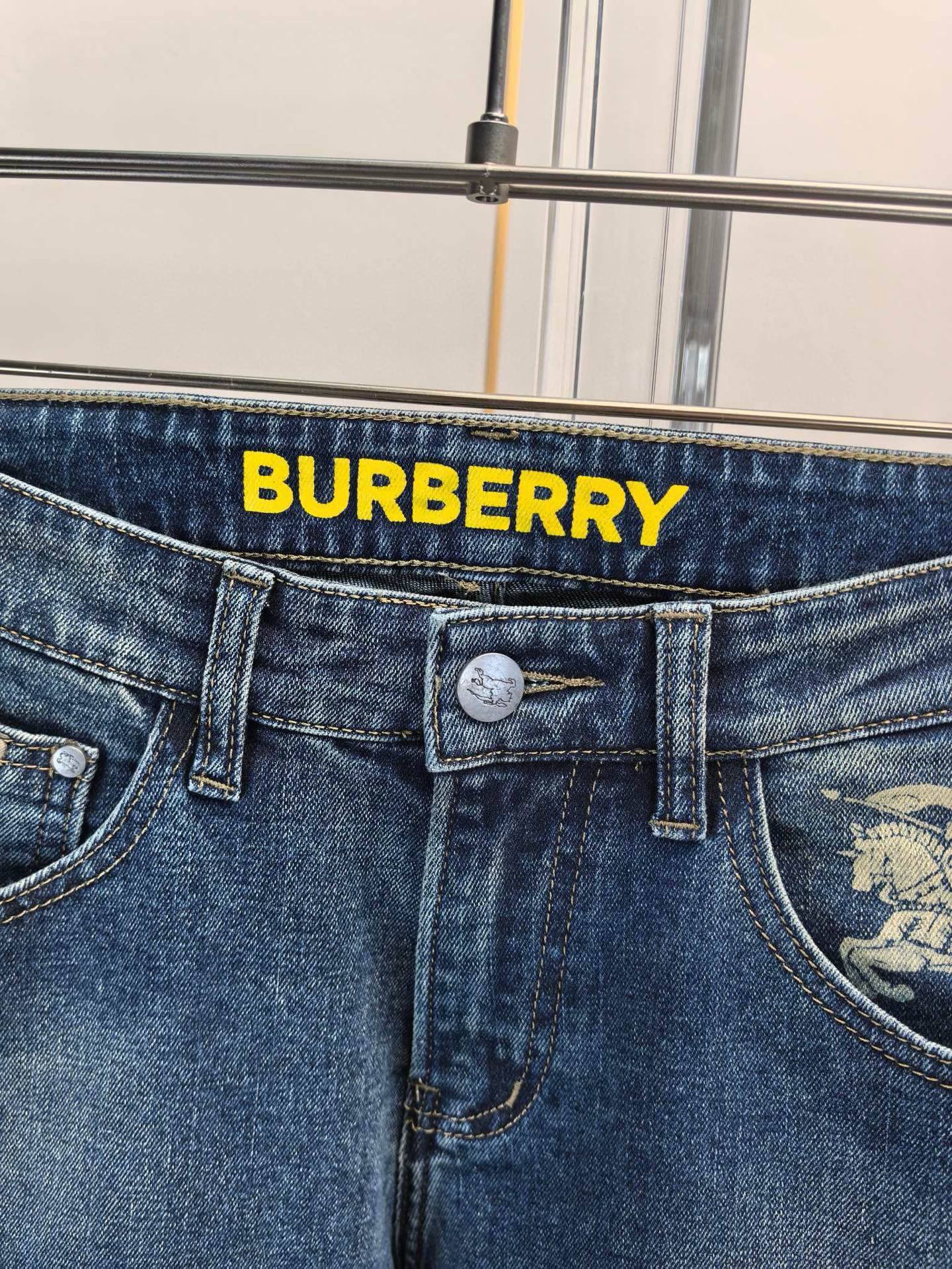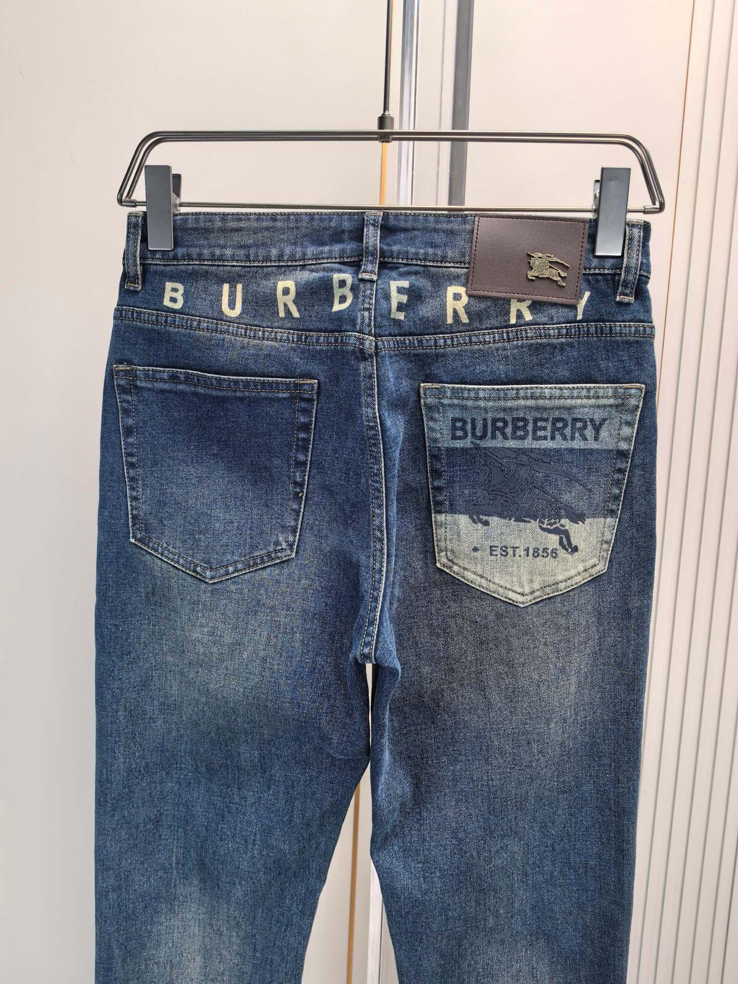 Burberry 2025 Fall/Winter men's jeans. Heavy wash denim, custom soft fabric. Double washing process, comfortable, breathable. Custom metal logos. Elastic fabric, minimalist design. Sizes 29-40.