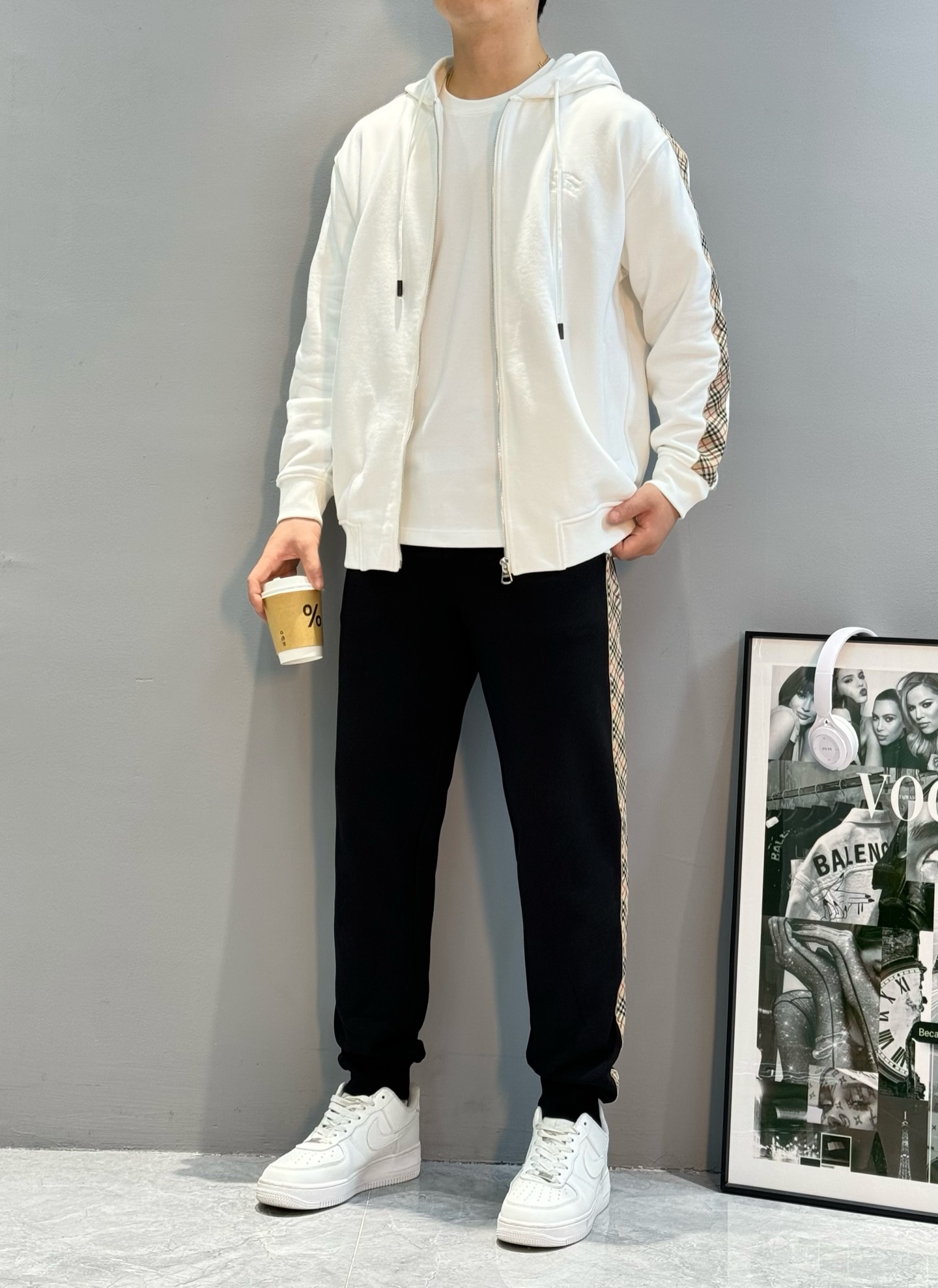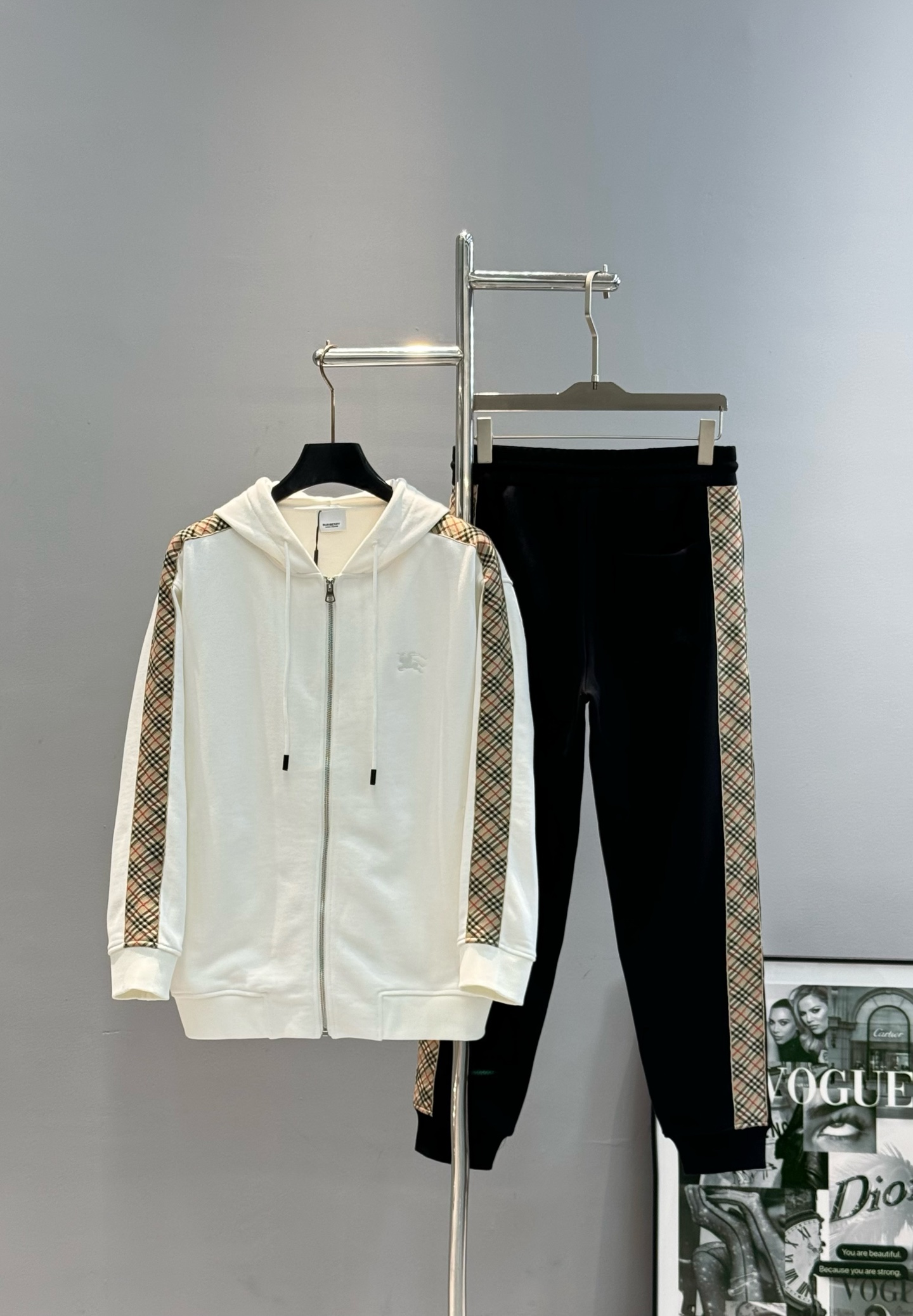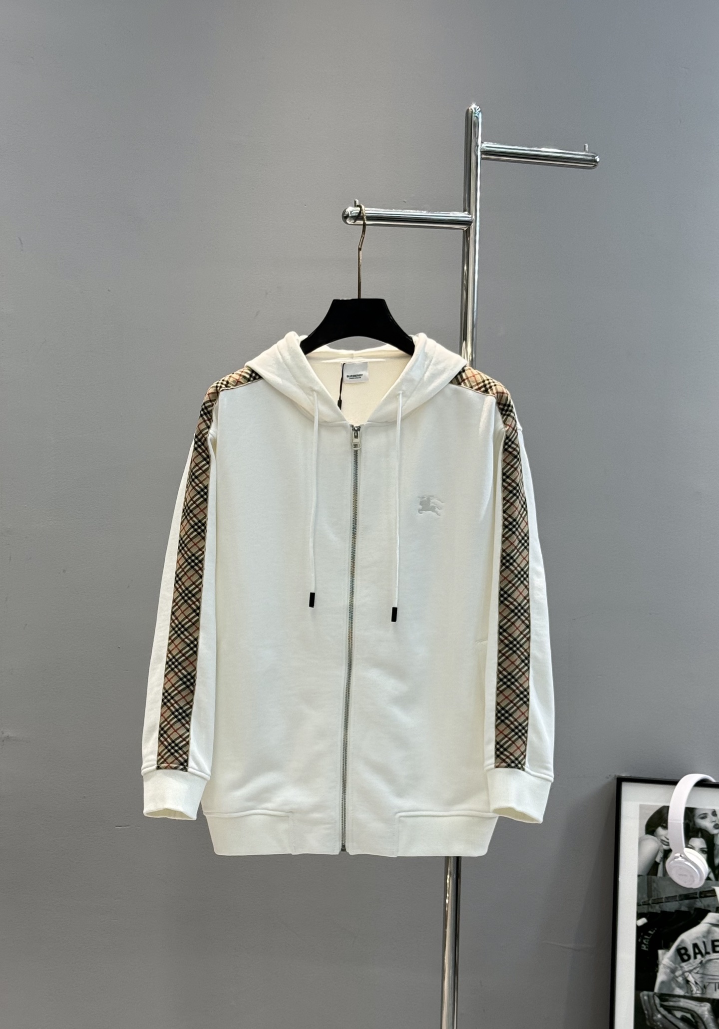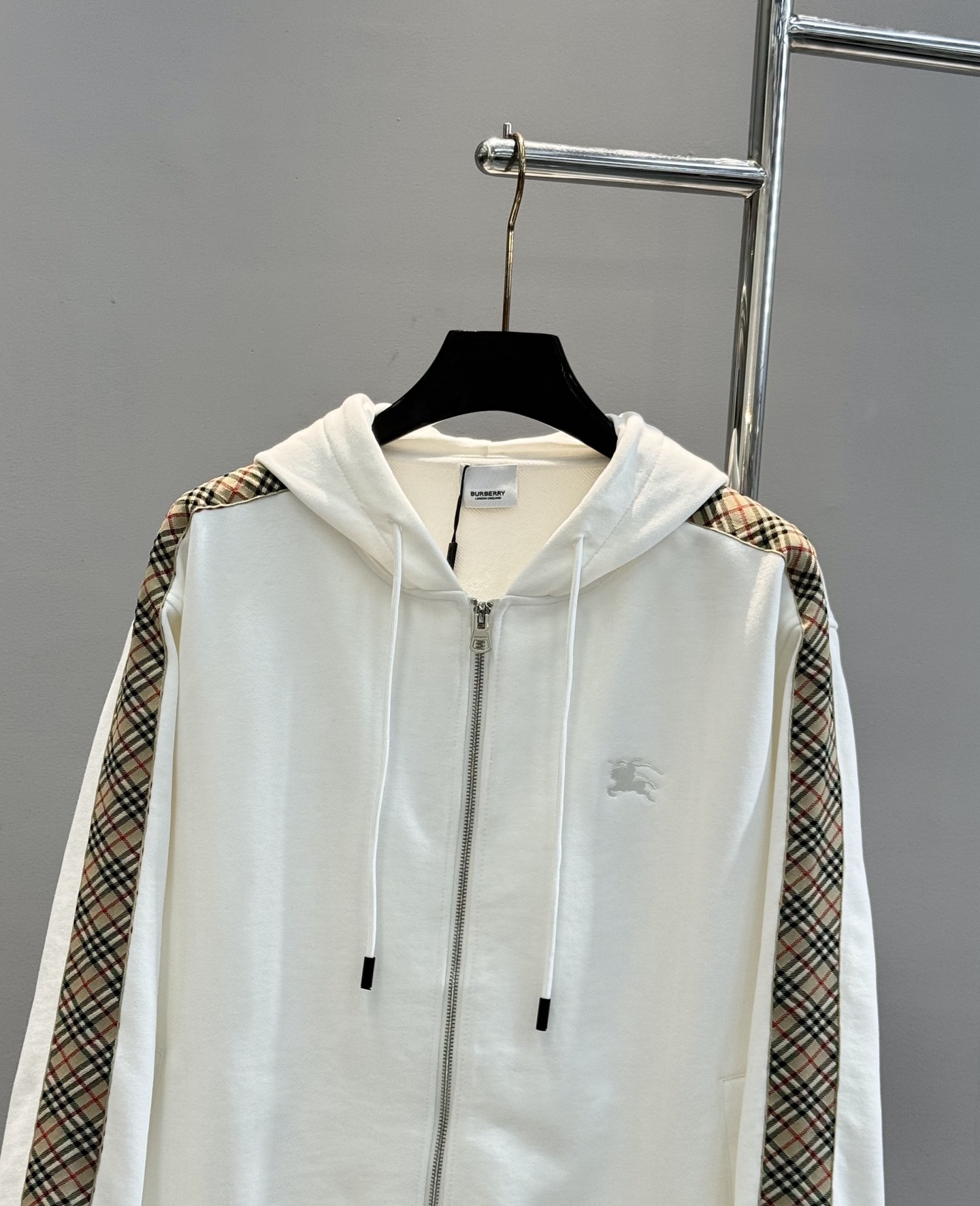 BBR Burberry 25s zip-up hooded jacket. Classic plaid side panels, embroidered horse logo. 420g cotton, soft. Colors: black, gray, white. Sizes: M-3XL, loose fit.