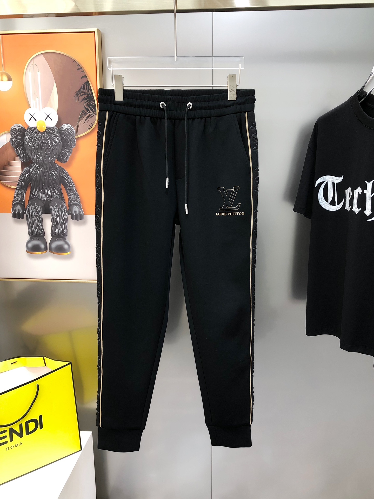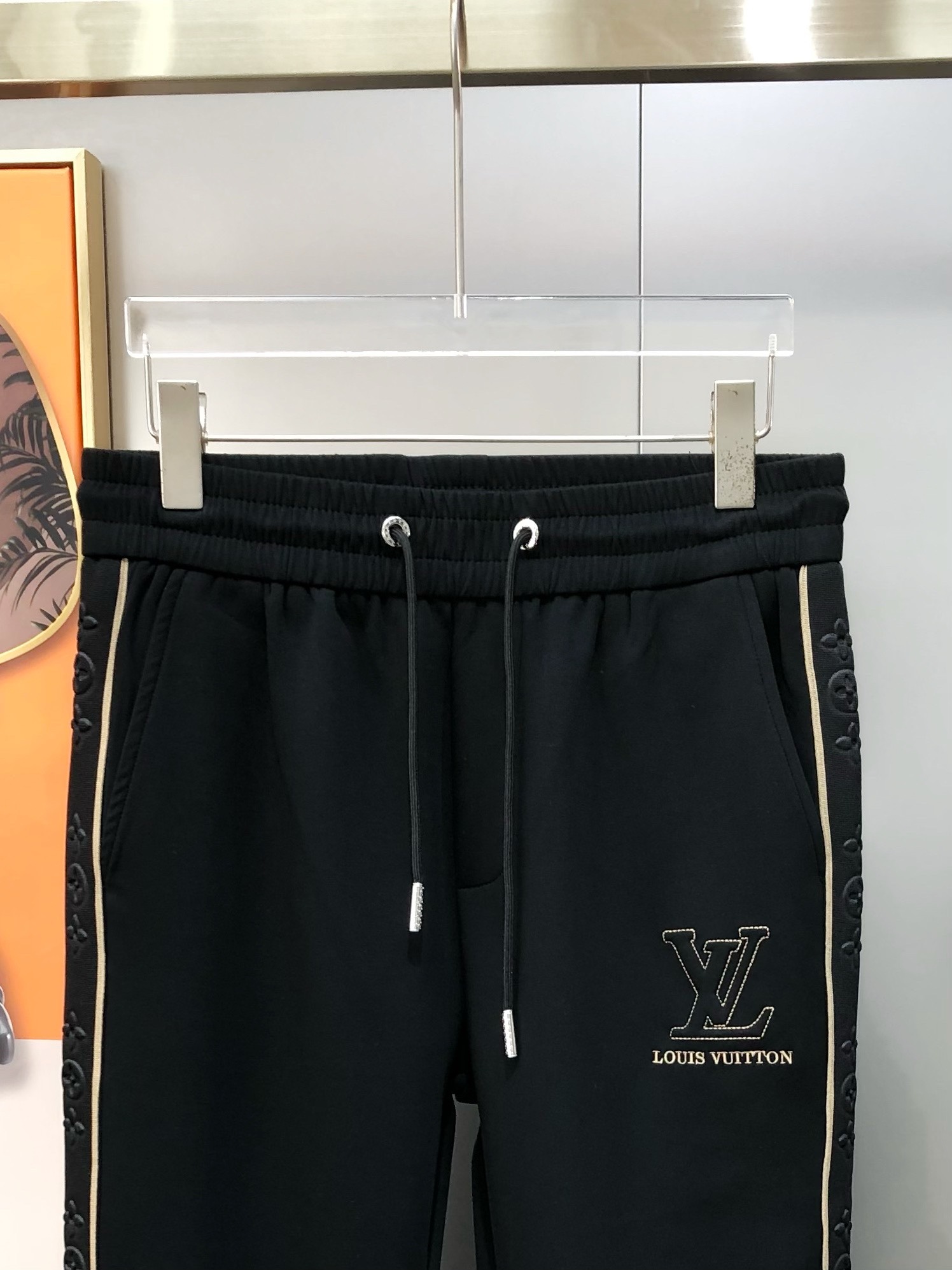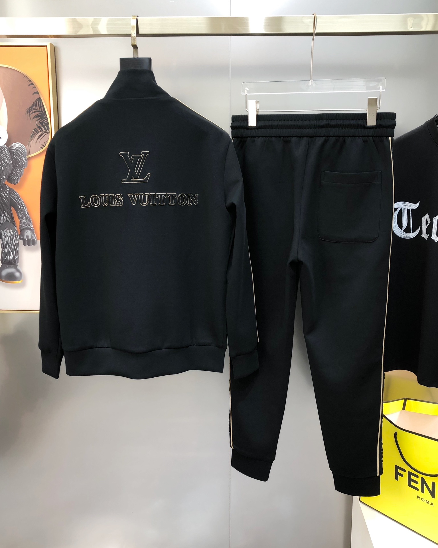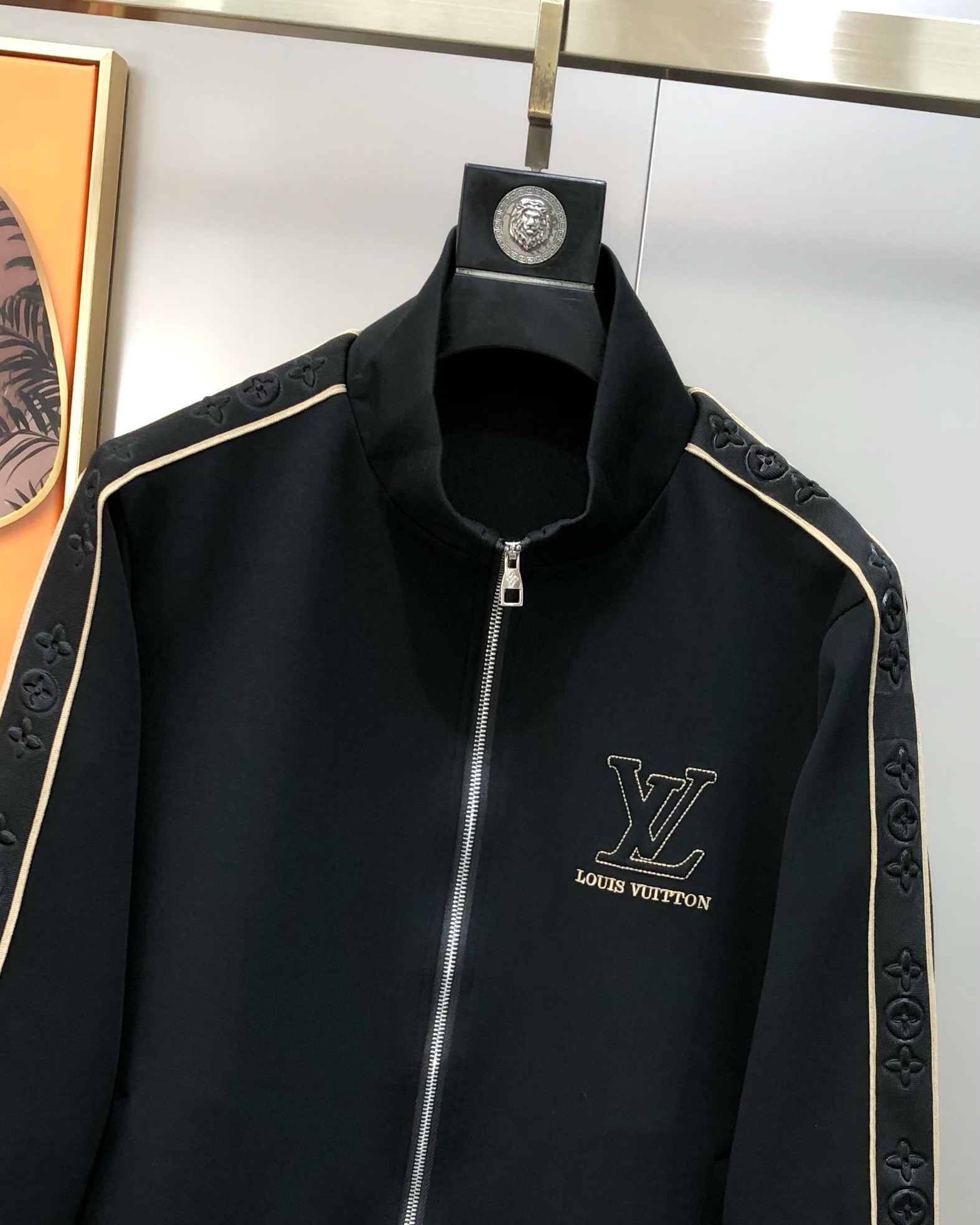 Louis Vuitton 2025 Fall/Winter Men's Casual Sportswear Set. Features zip-up jacket, pants, embossed sleeves, embroidered logo. 100% cotton. Sizes M-3XL. Black.