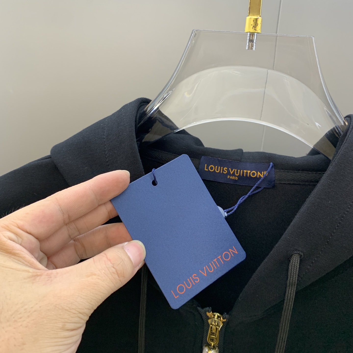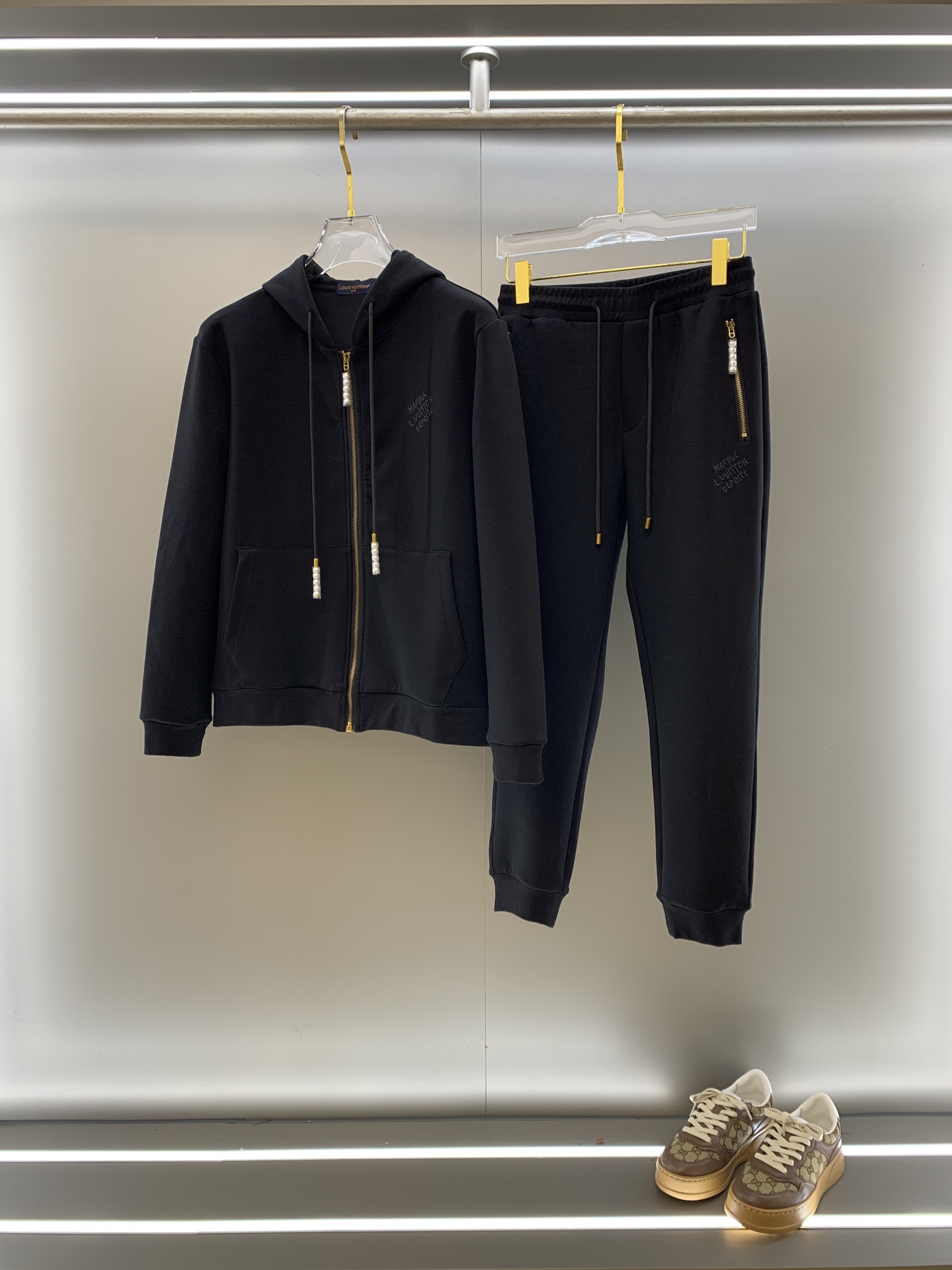 LV 2025 latest hooded sweatshirt set. Premium classic embroidery, heavy work stand collar design. High-quality boutique material, imported custom thread. Sizes: M-3XL, Color: Black.