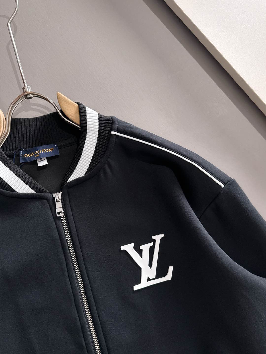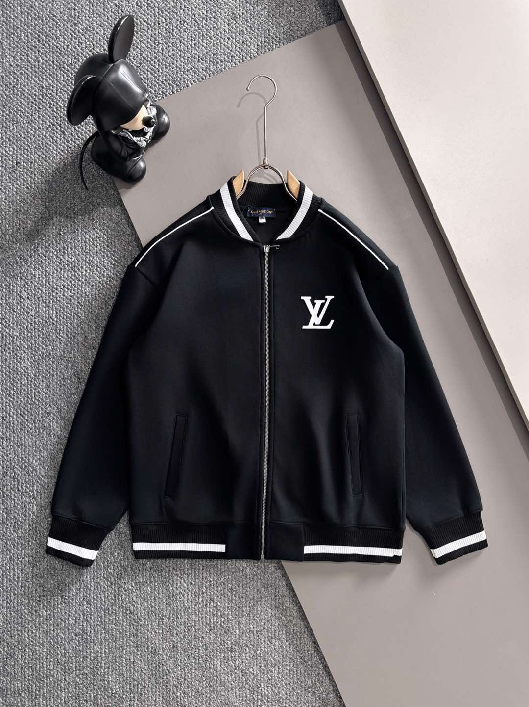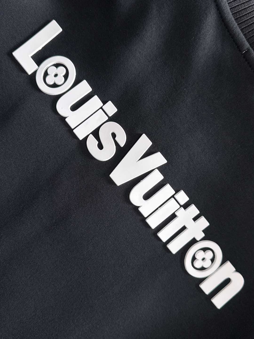 LV Louis Vuitton suit set. Top拼接suit, jacquard zipper pants, logo embroidery, classic black/white tape. Custom fabric, premium craftsmanship. Full 3 tags. Sizes M-3XL.