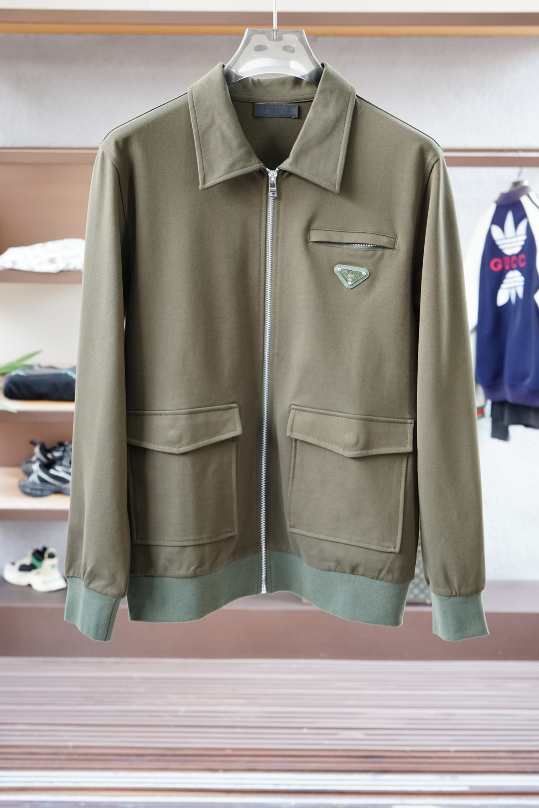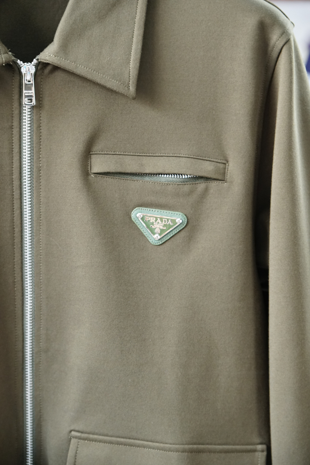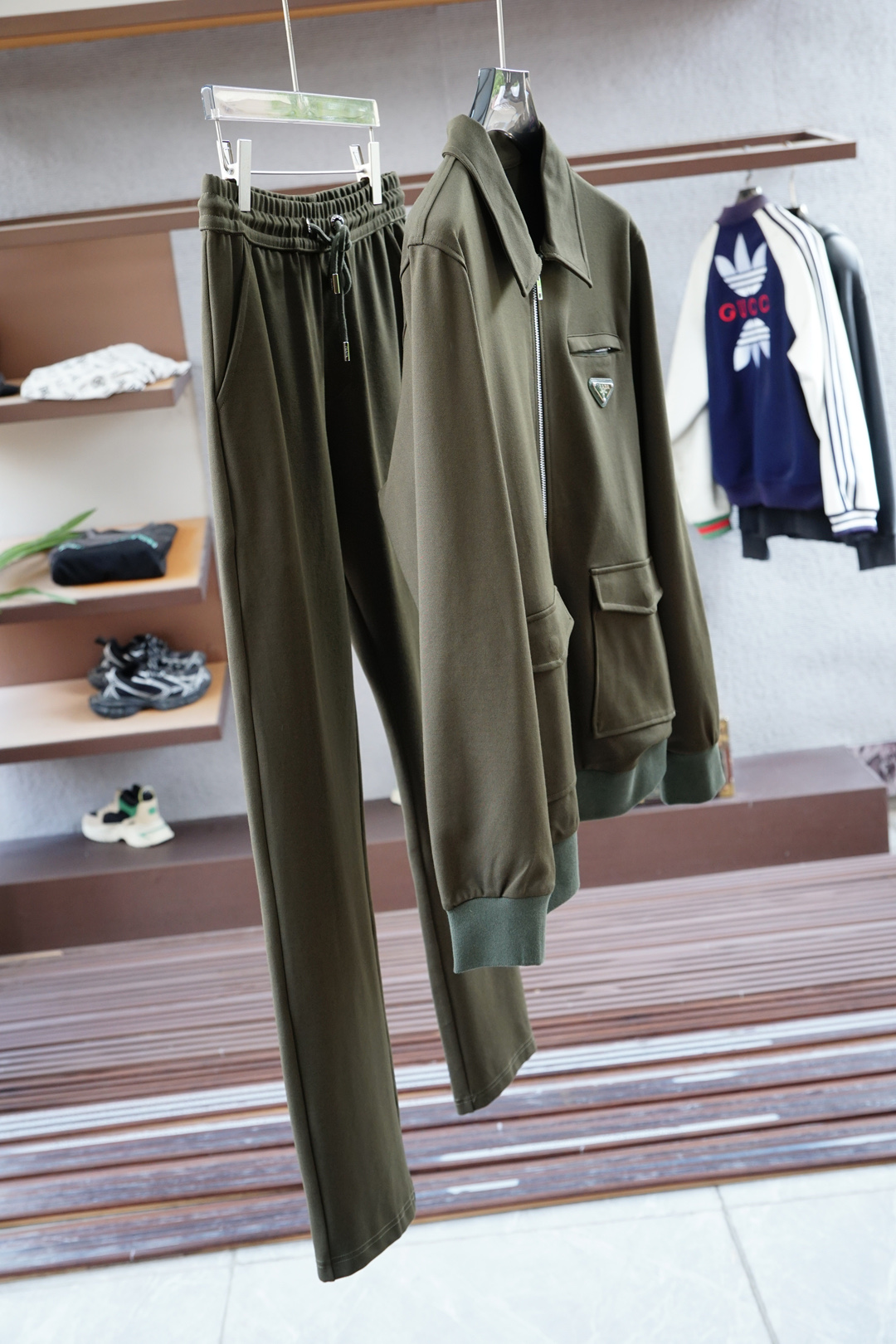 Prada Fall/Winter 2025 hoodie set. Simple, elegant, embroidered logo. Clean cut, urban style, custom fabric. Colors: black, blue. Sizes 48M-56XXXL.