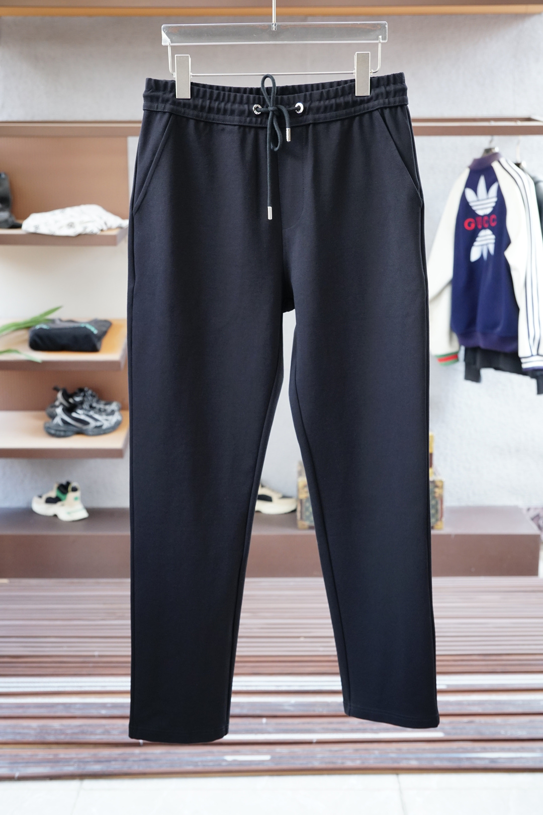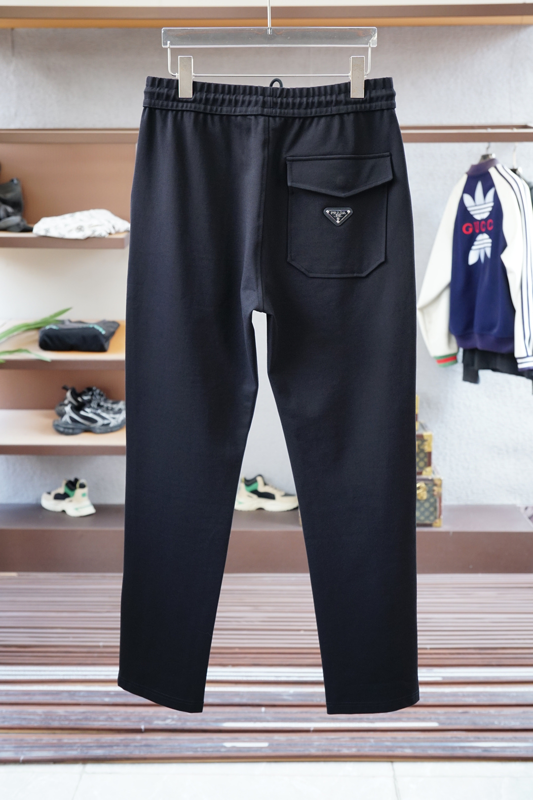 Prada Fall/Winter 2025 hoodie set. Simple, elegant, embroidered logo. Clean cut, urban style, custom fabric. Colors: black, blue. Sizes 48M-56XXXL.