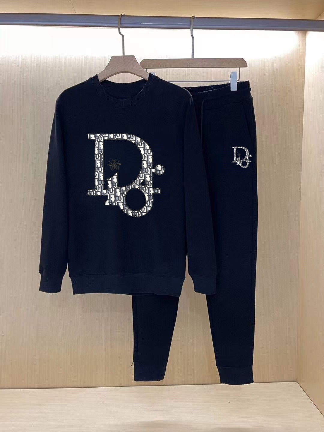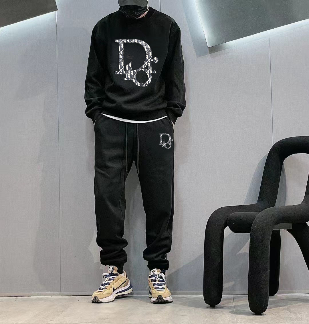 Dior 2025 new hoodie set. Classic print, trendy casual wear. Premium quality, loop fabric, custom yarn. Size chart with shoulder, chest, sleeve, length, height, weight. Manual measurement, 1-3cm error.