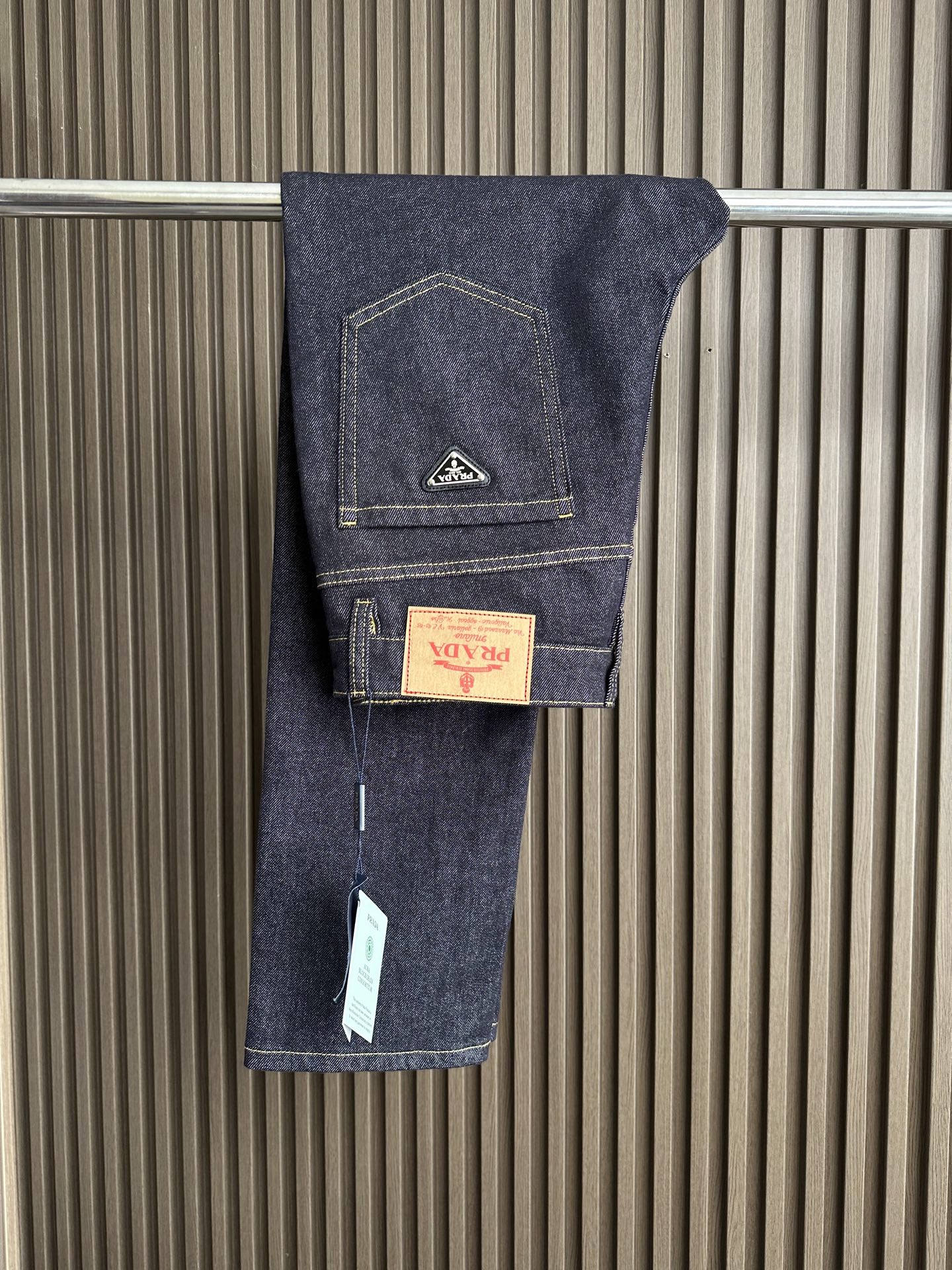 PRADA 25FW men's casual jeans. Minimalist design with premium Japanese denim. Features eco-enzyme wash, retro texture, and brand detailing. Versatile for business or casual wear. Classic blue color. Sizes 30-38.