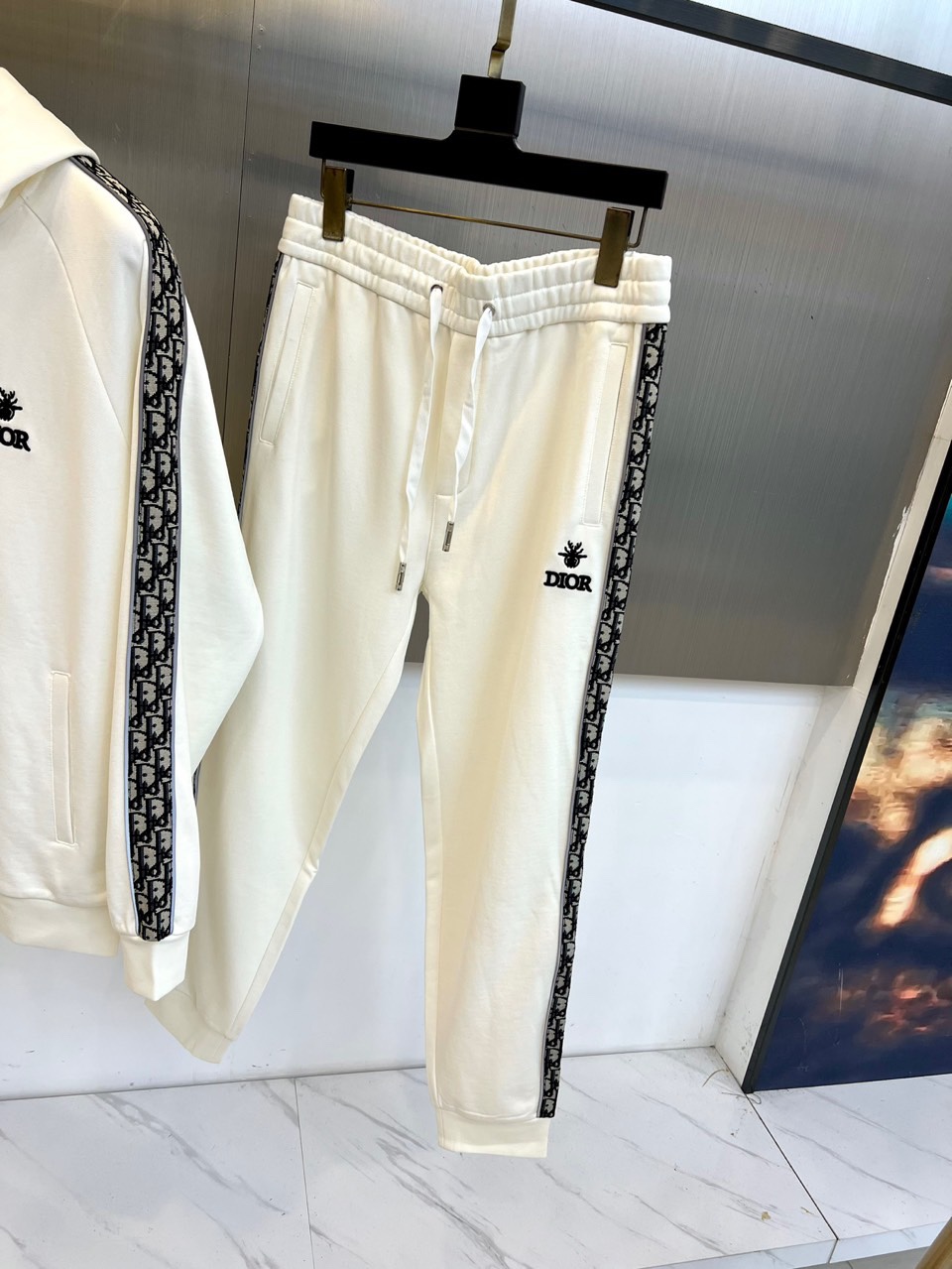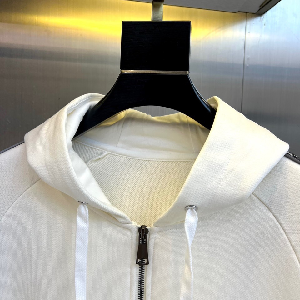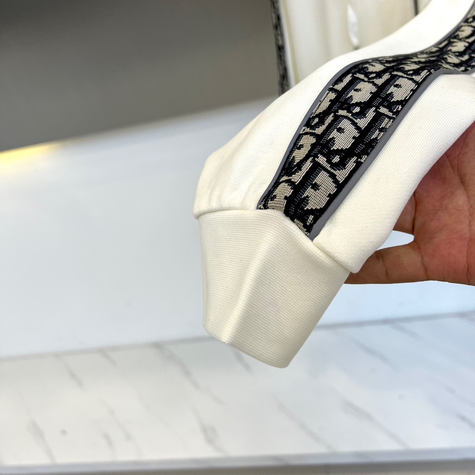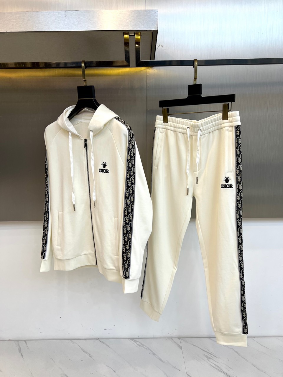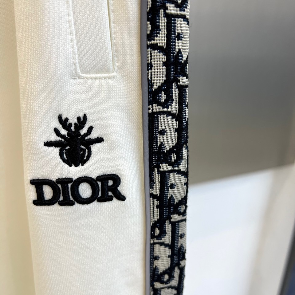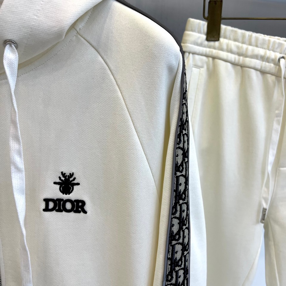 Dior 2025 autumn/winter white sportswear set. Hooded zip-up sweatshirt and tapered pants with classic DIOR logo, bee embroidery, and lettered tape details. High-quality cotton blend. Combines athletic functionality with luxury aesthetics.