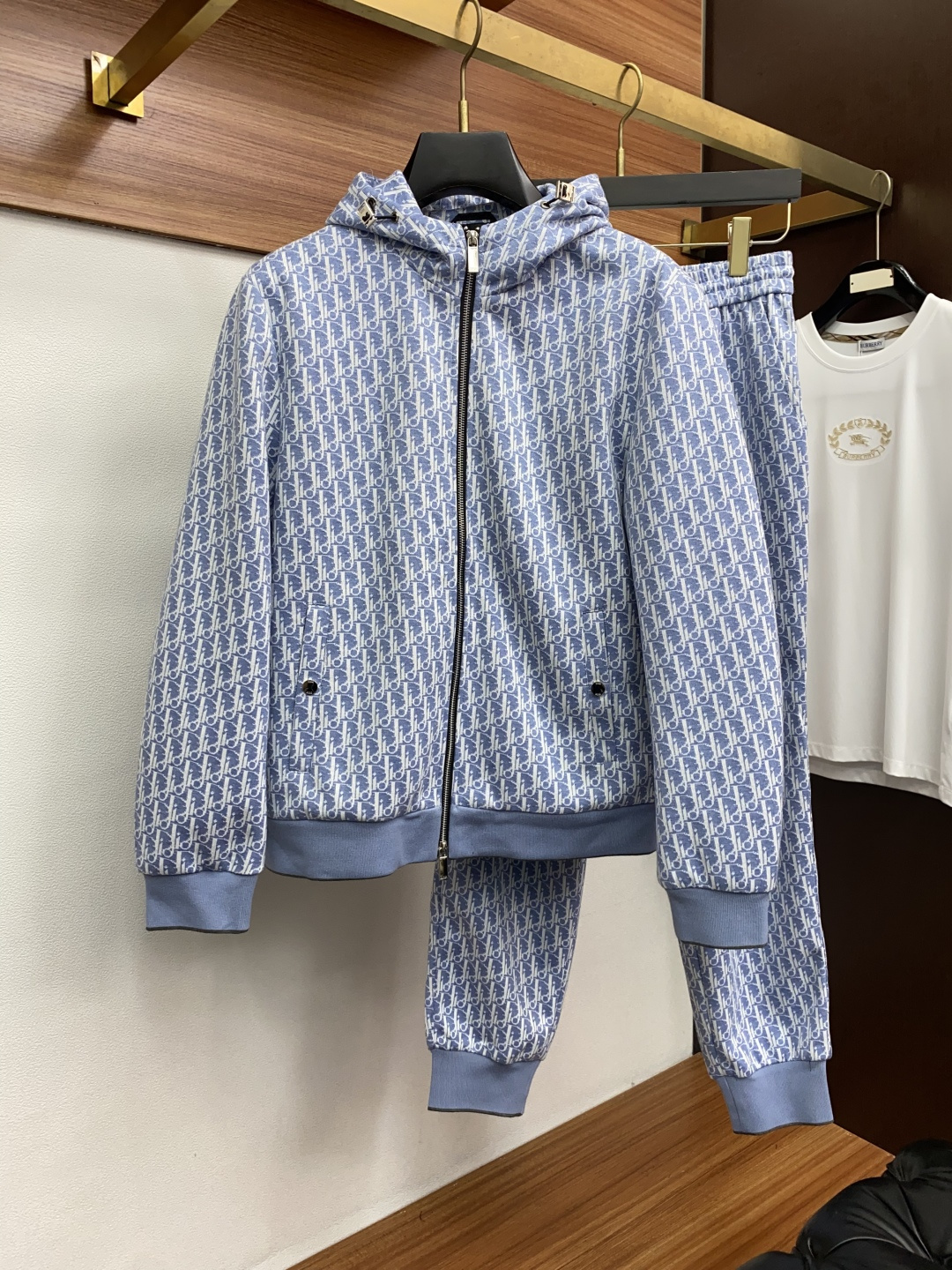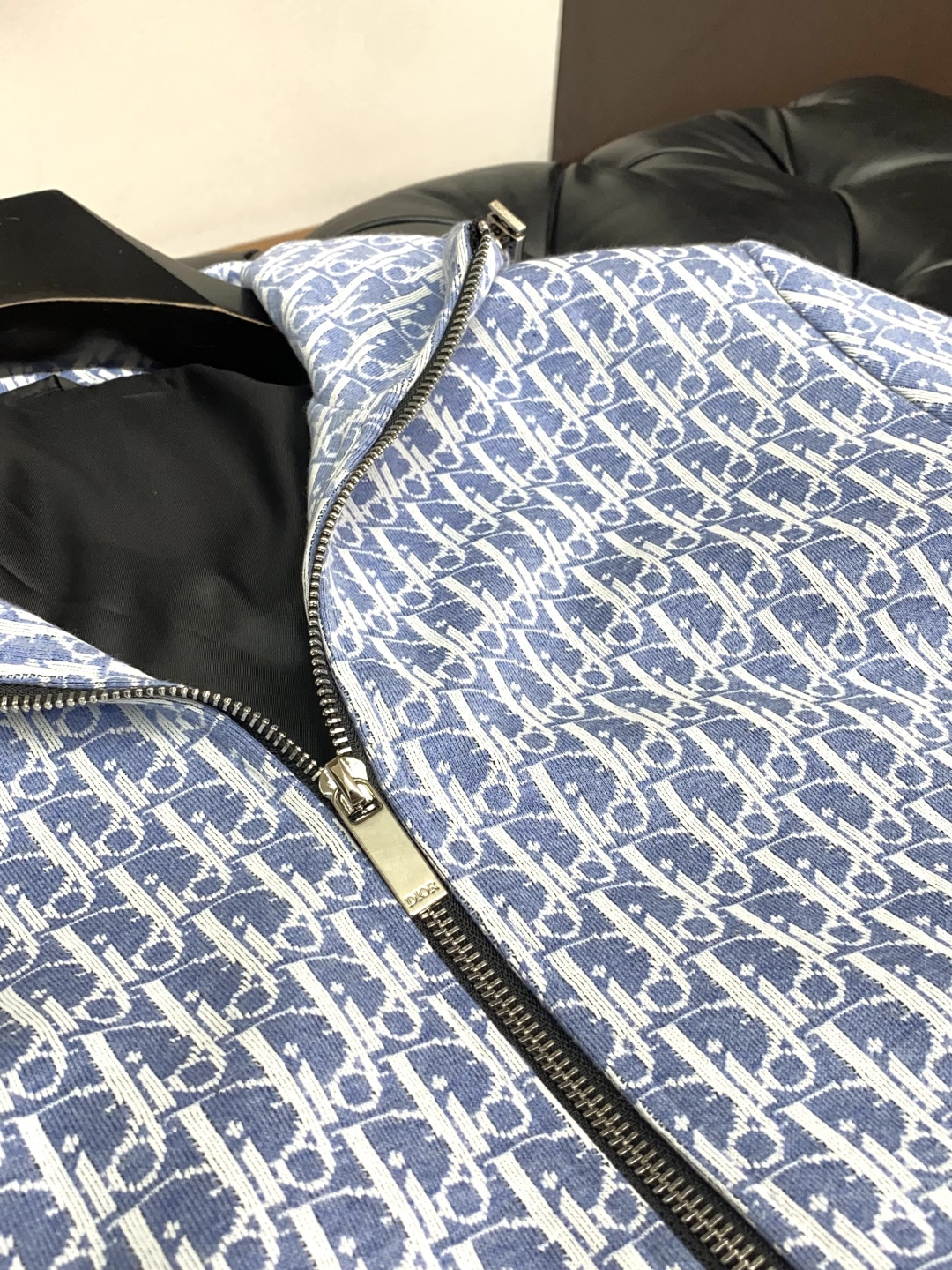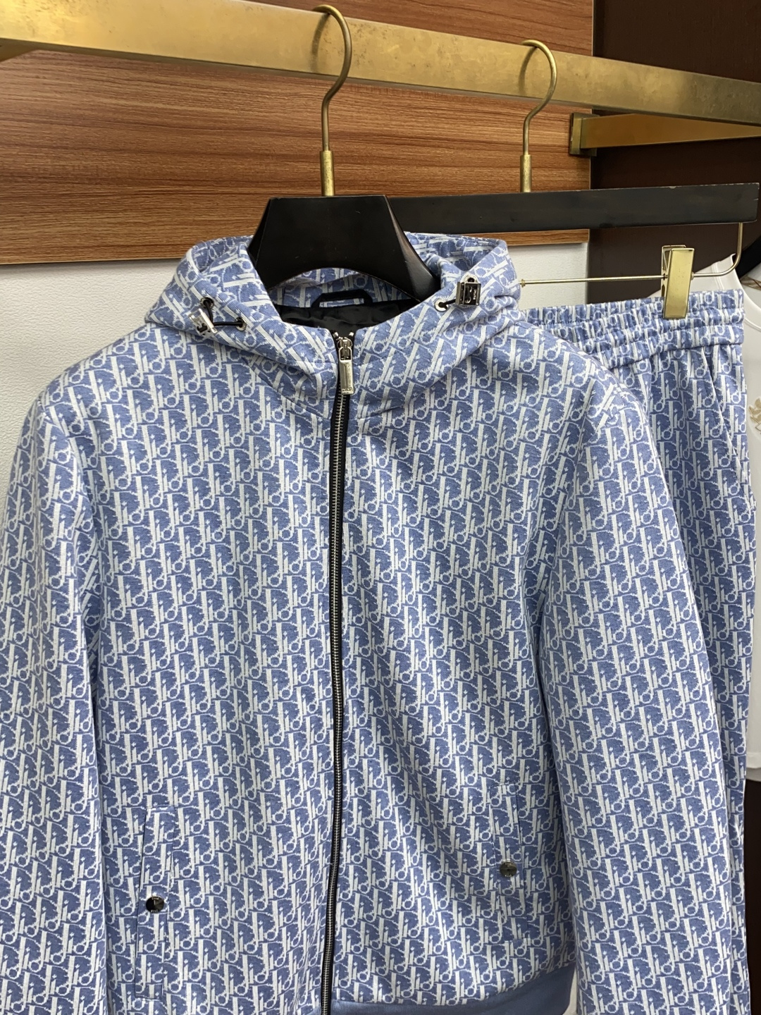 Dior 2025 early fall men's casual zip-up hoodie set. Loose fit, pure color design. Custom fabric, soft and breathable. Contrast chest detail. Versatile for daily wear.