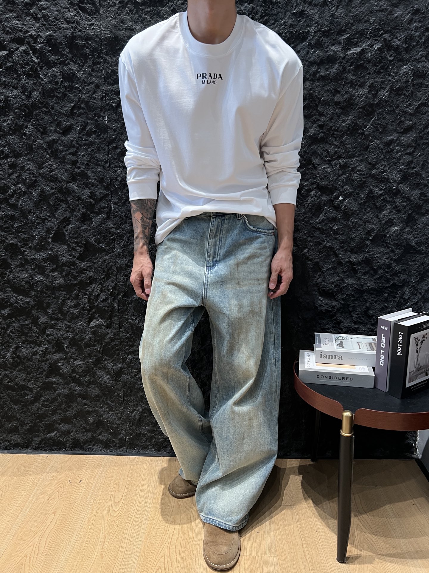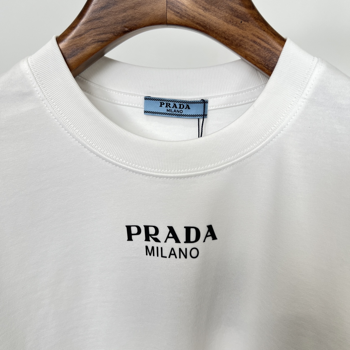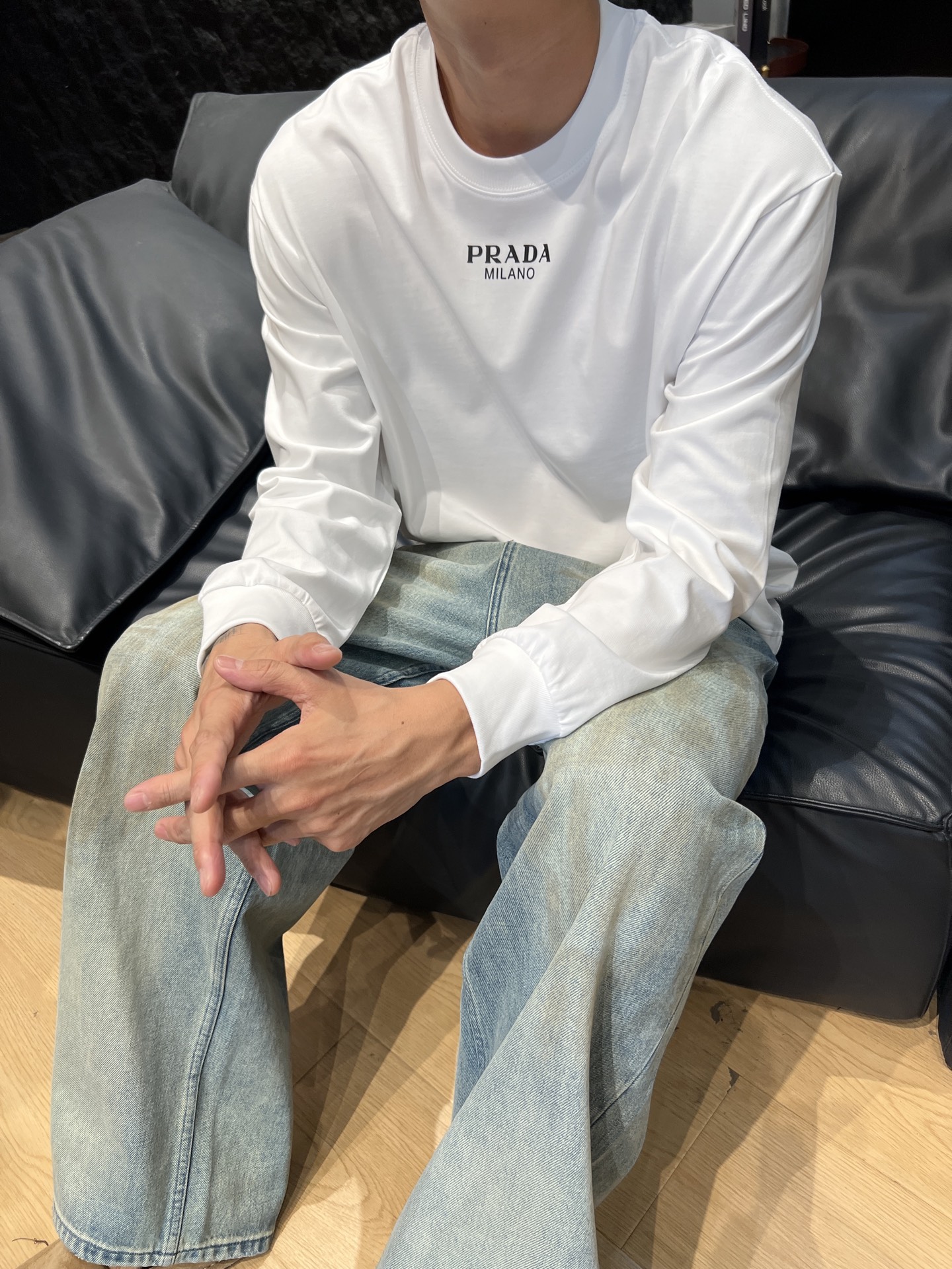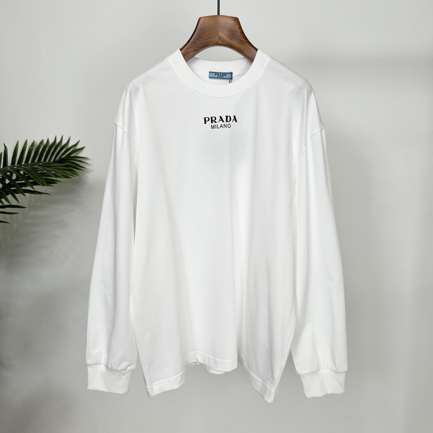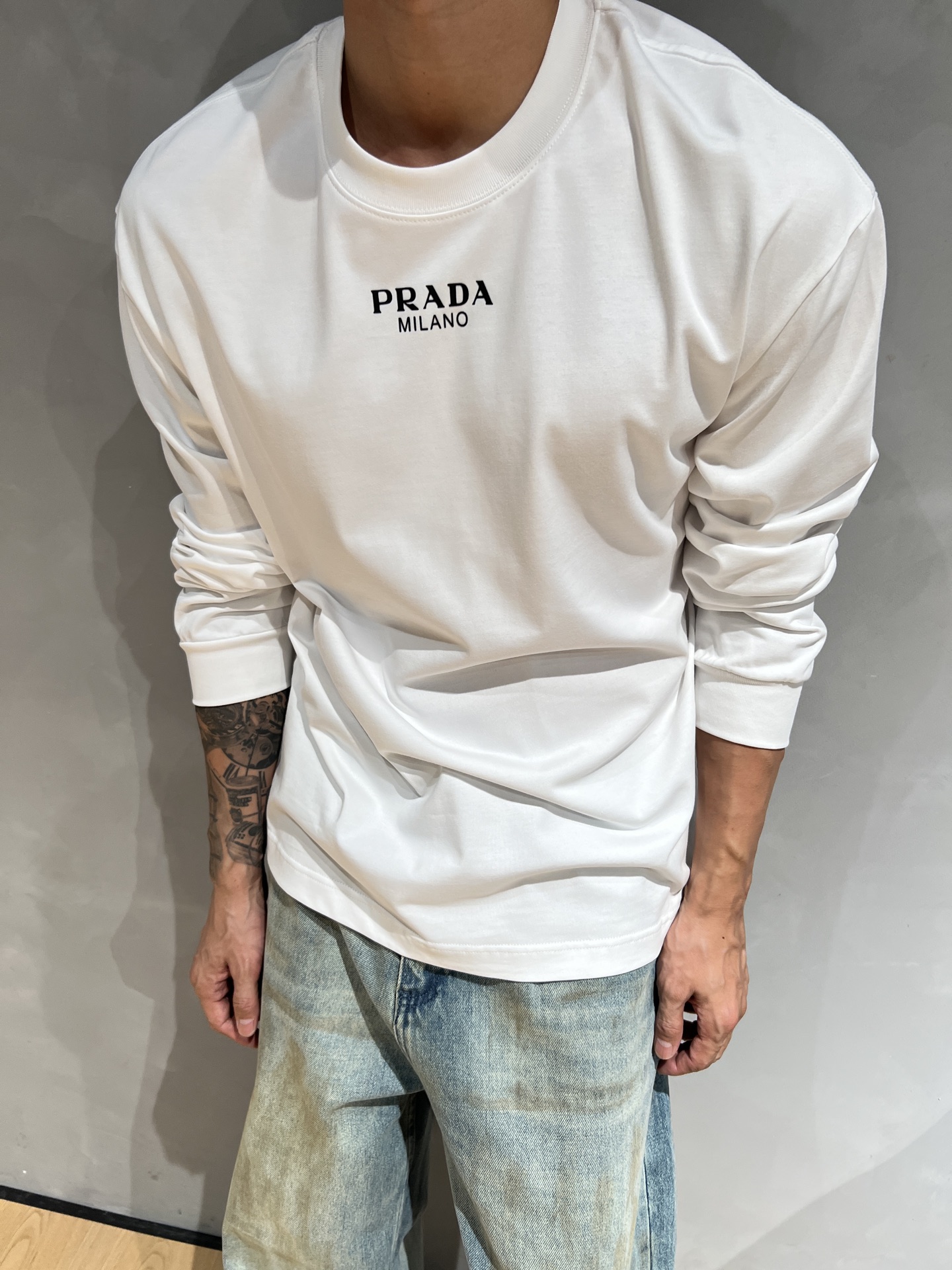 Prada 2025 early fall logo print cotton long sleeve T-shirt. Soft, breathable, relaxed fit. Colors: Black, White. Sizes: S-XL.
