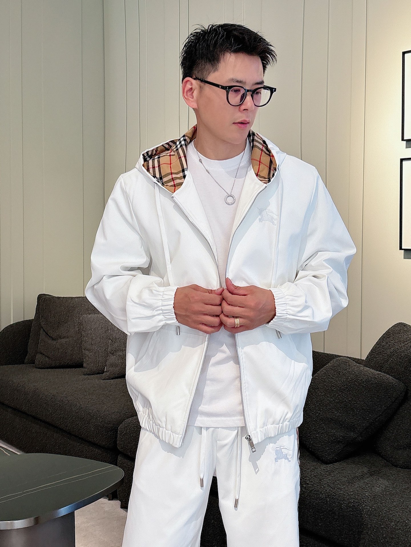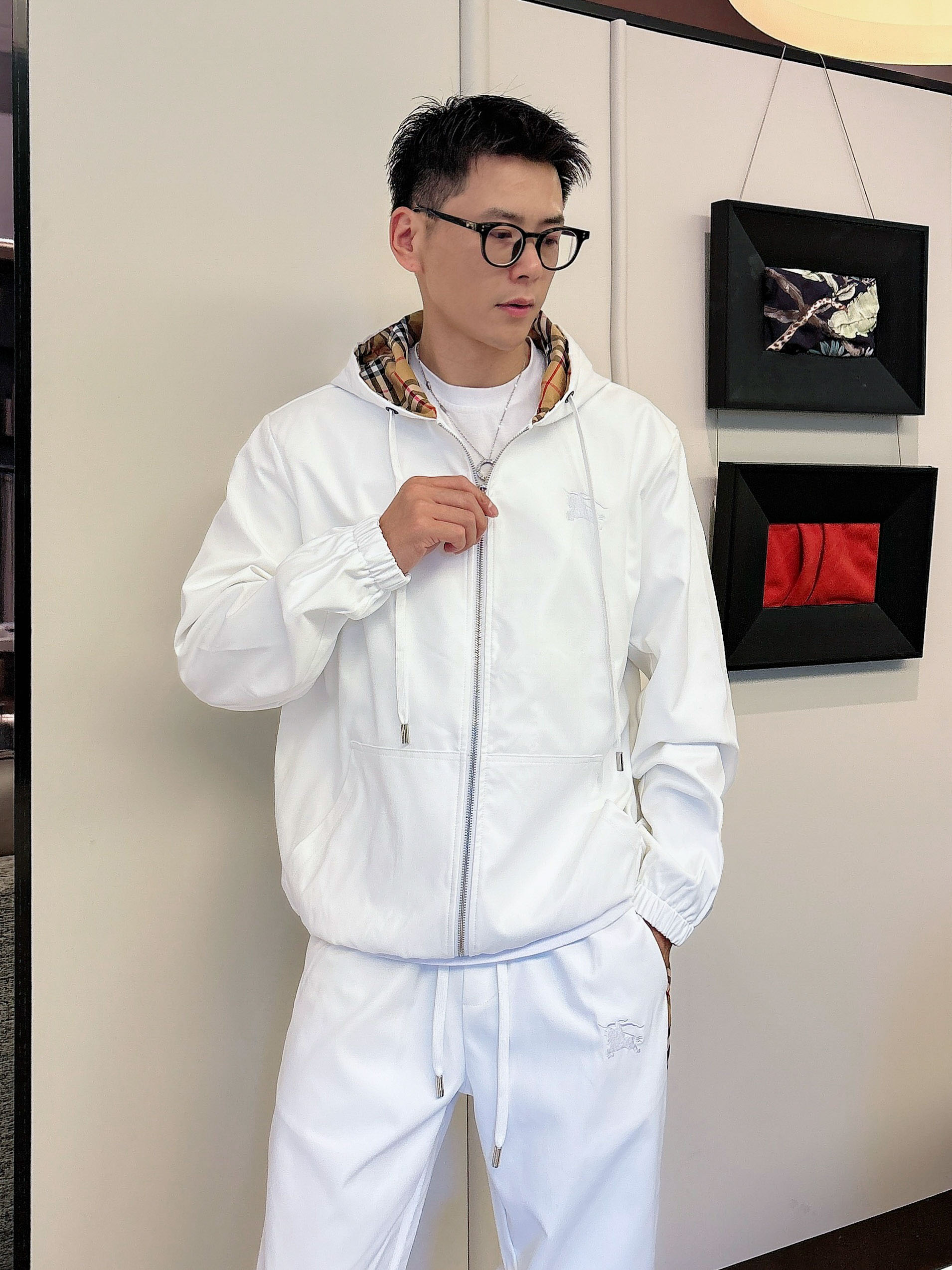 Burberry BBR casual set, 2025 autumn-winter top imported, hooded set with custom hardware, multi-zipper and pocket design, luxury boutique style.