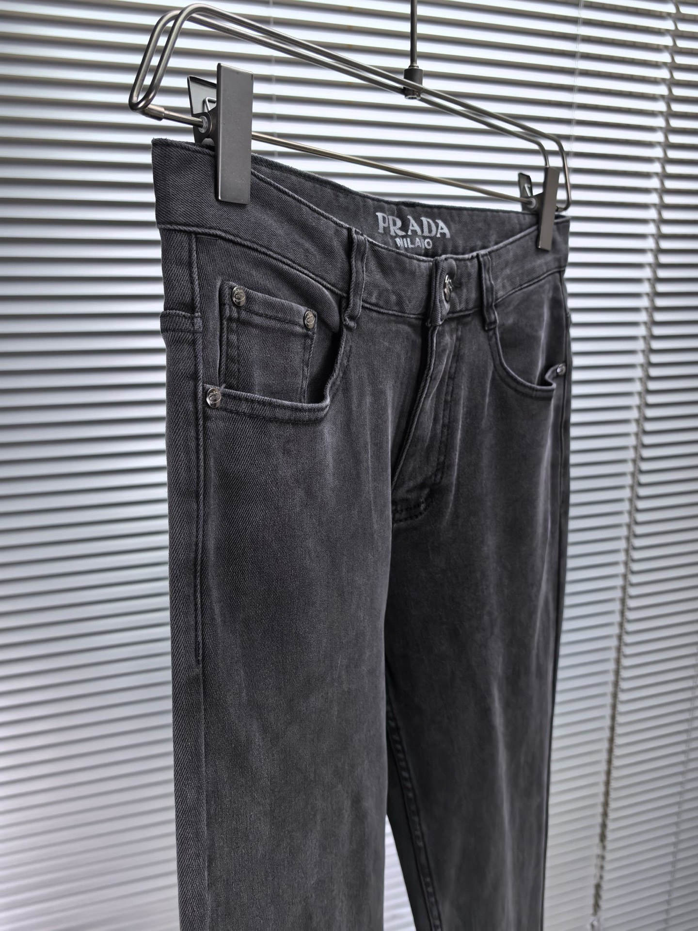 Prada wide-leg jeans, autumn-winter 1975. Heavy wash denim, soft & comfortable. Custom logo hardware. Sizes 29-38.