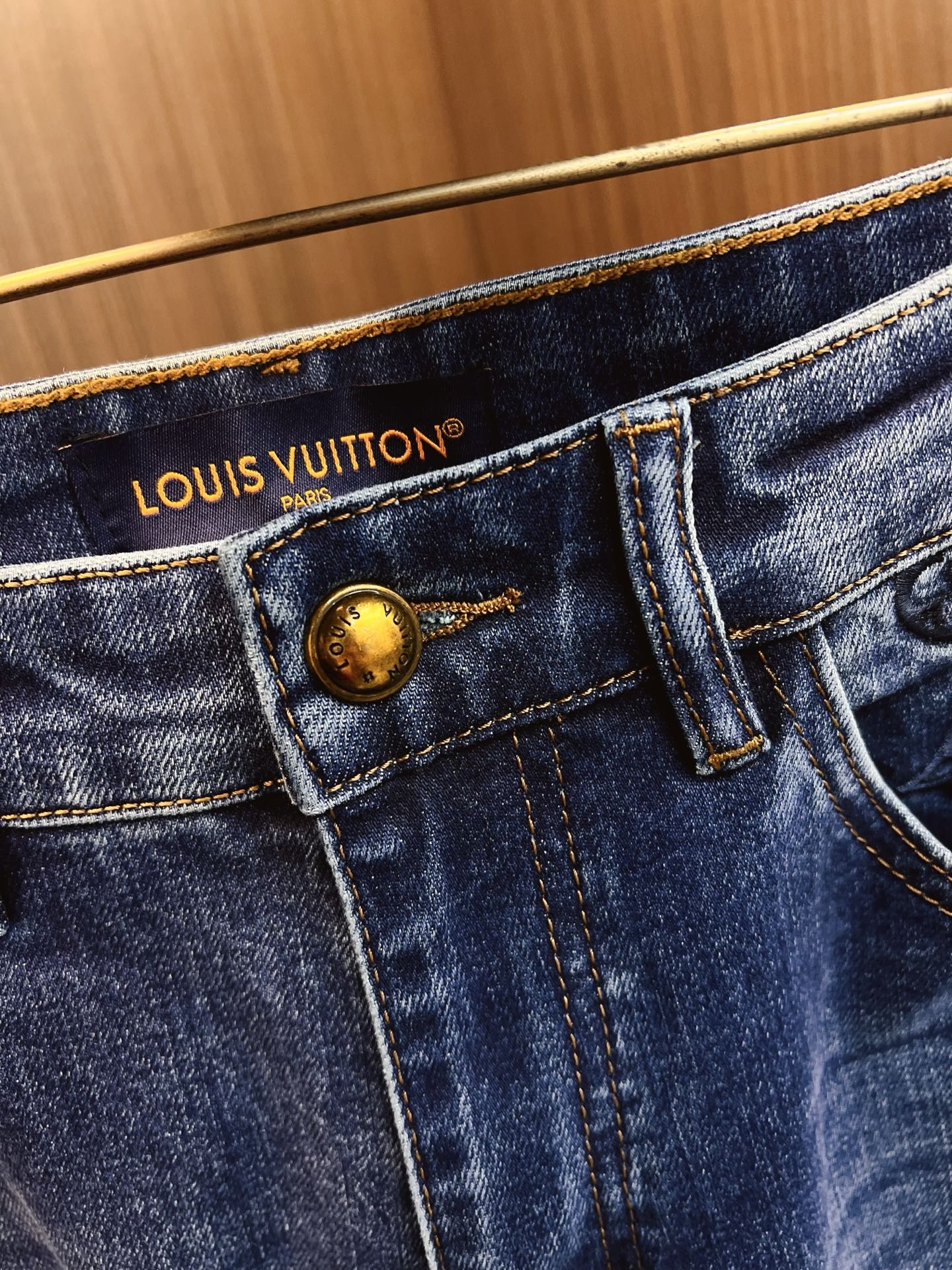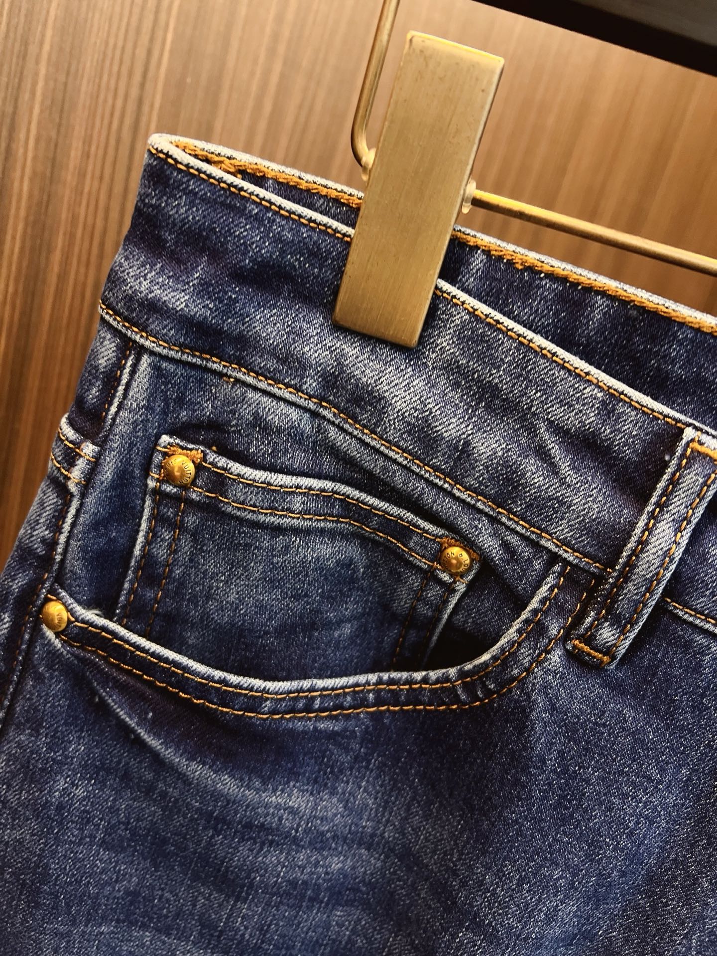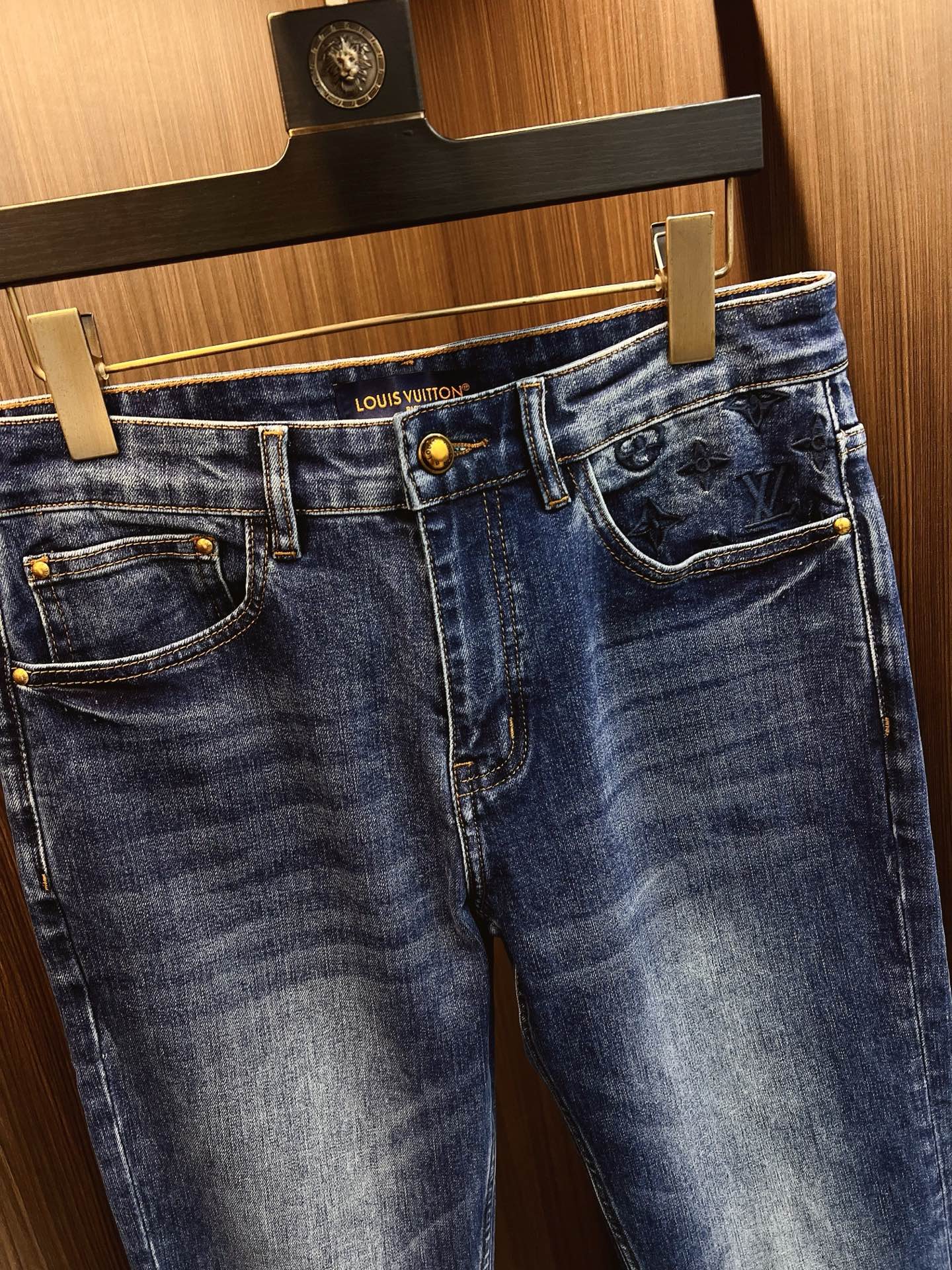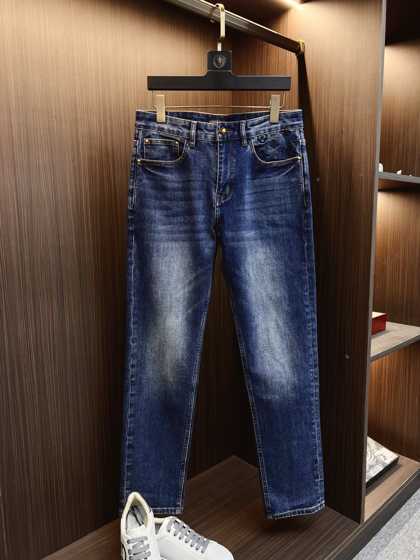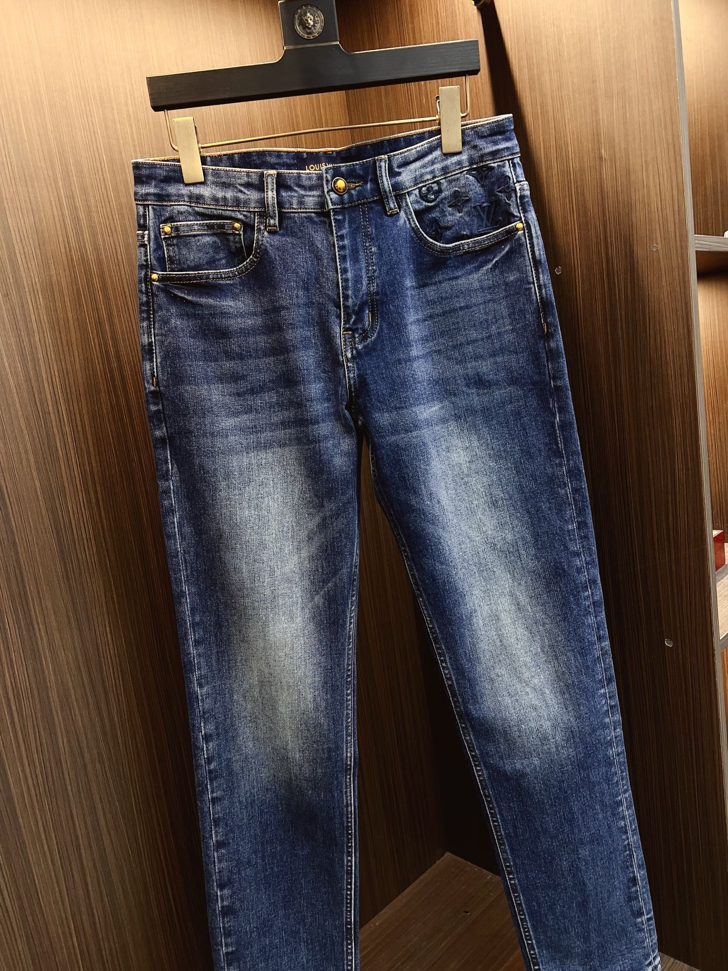 LV men's denim jeans. Official catalog style. Imported Japanese 13oz fabric, eco-enzyme wash for soft vintage texture. Tapered fit, leather brand tag. Sizes: 29-38 (excl. 35, 37).