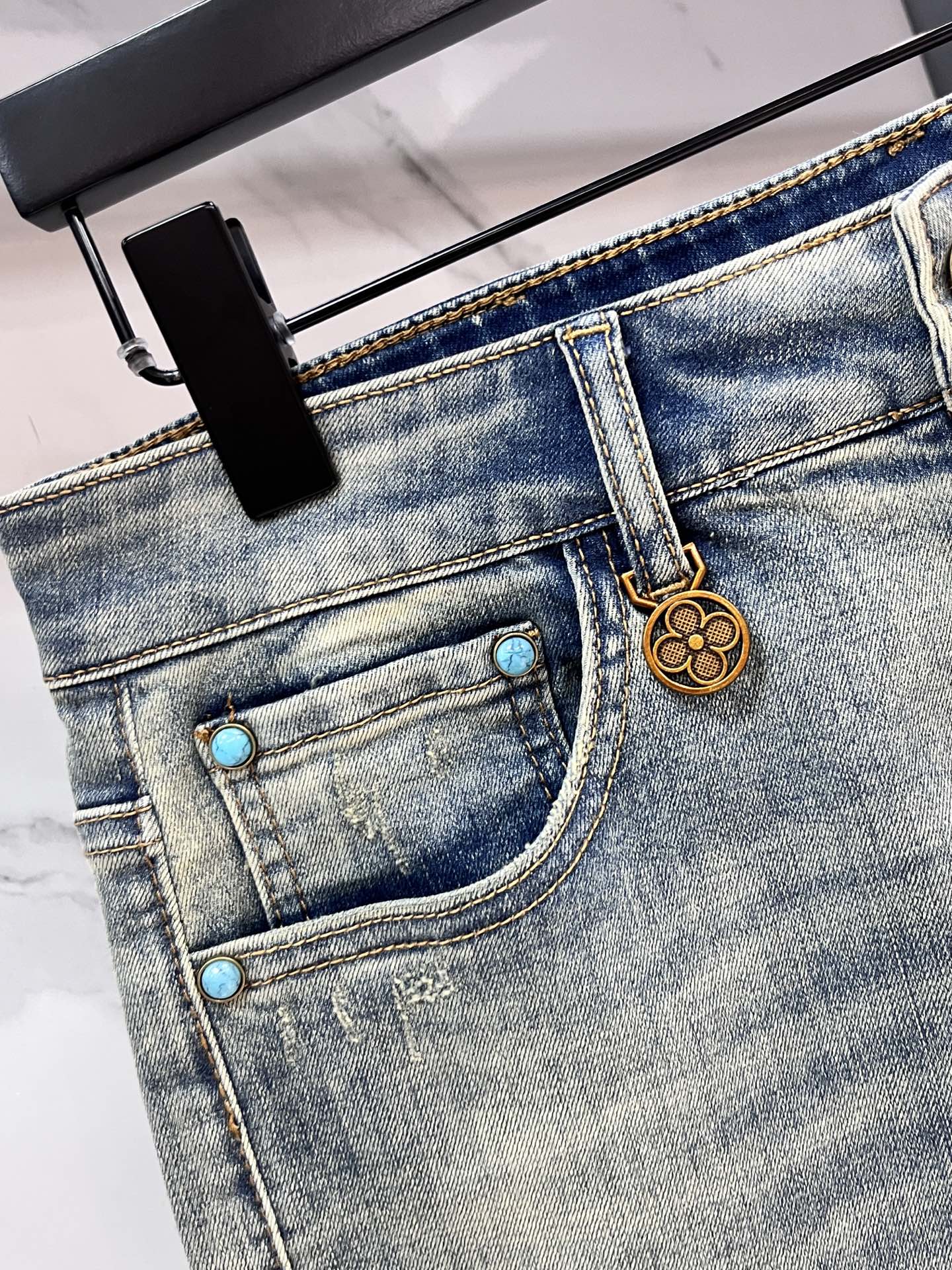 Home • Apparel • Jeans • LV 2025SS early spring new lightweight distressed jeans. Imported elastic denim, comfortable and breathable. Metal accents, great fit. Sizes 29-38.