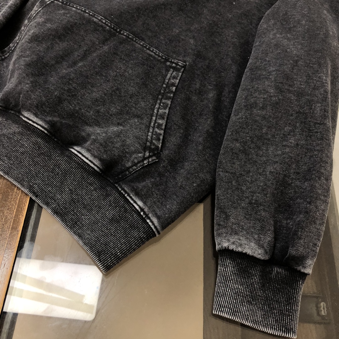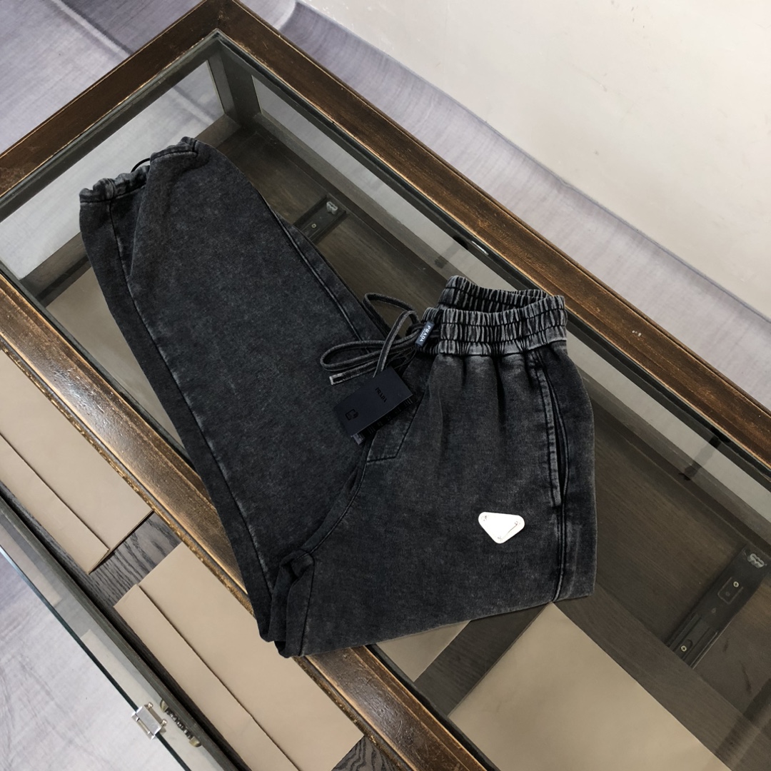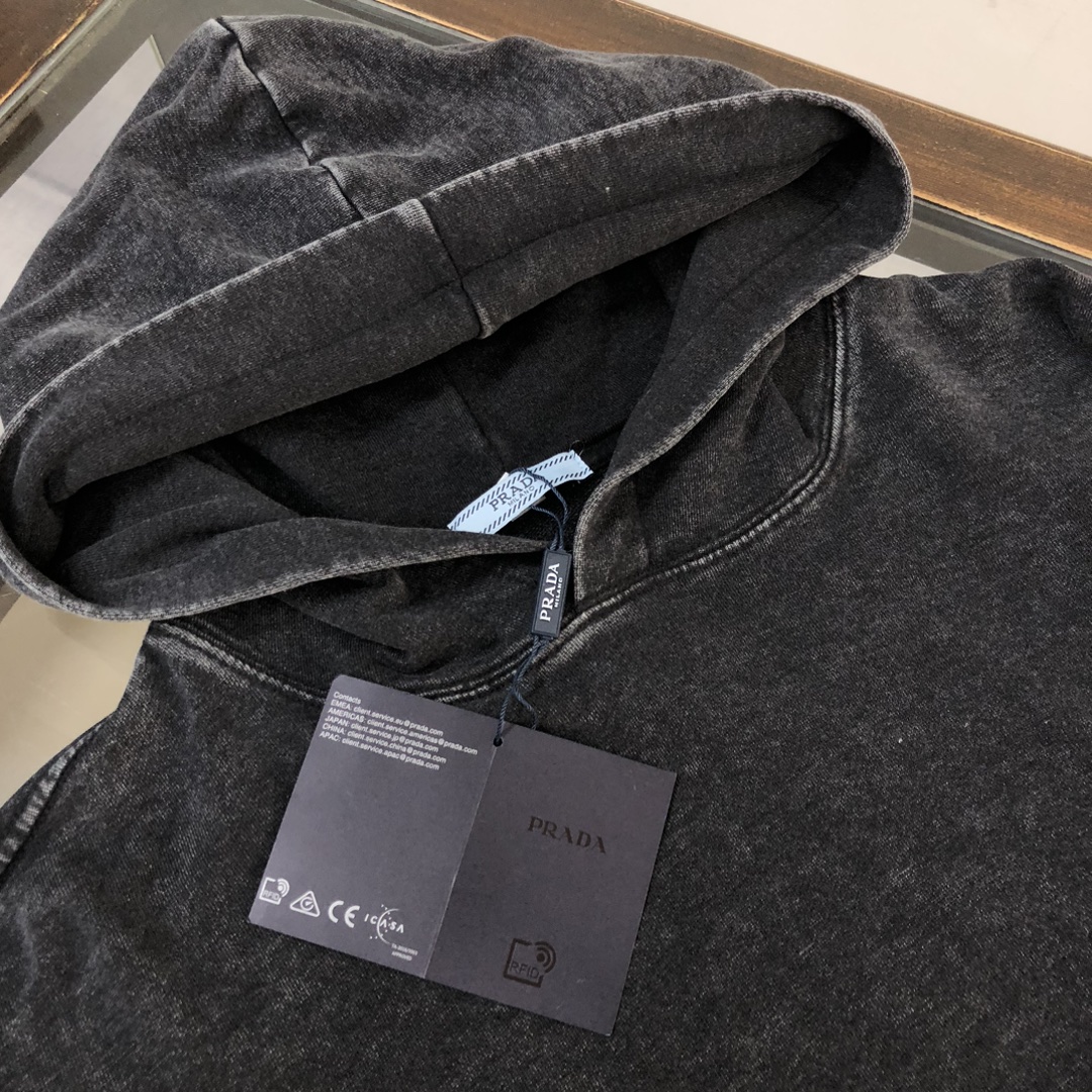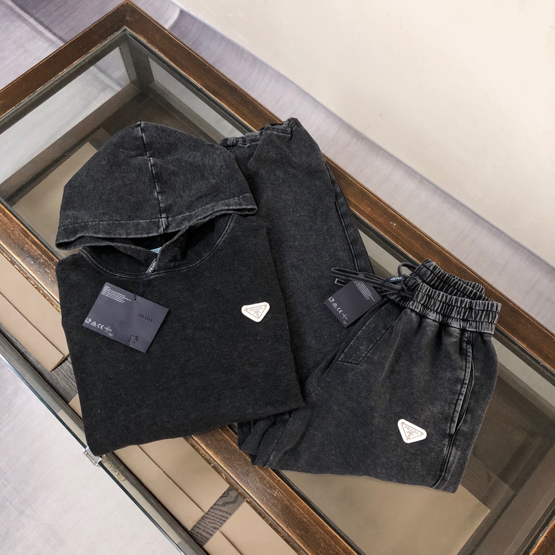 Prada 2025 early autumn couple's washed hoodie & straight-leg pants set. Top quality, custom Italian fabric, 3D tailoring, vintage wash. Sizes S/M/L/XL/XXL (oversized fit).