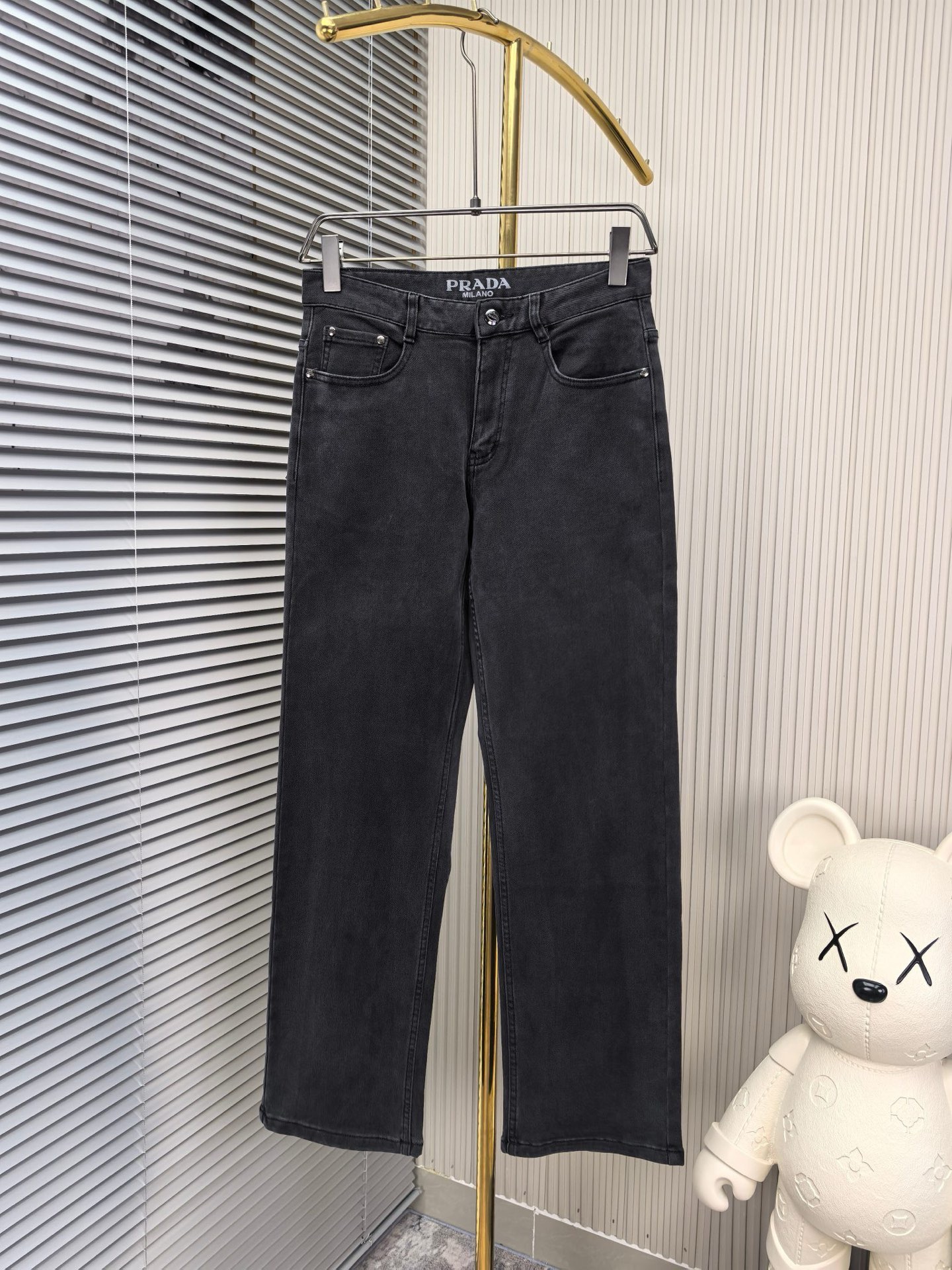 Prada wide-leg jeans, autumn-winter 1975. Heavy wash denim, custom soft fabric, comfortable, breathable. Custom metal logo, elastic material, simple design. Sizes 29-38.