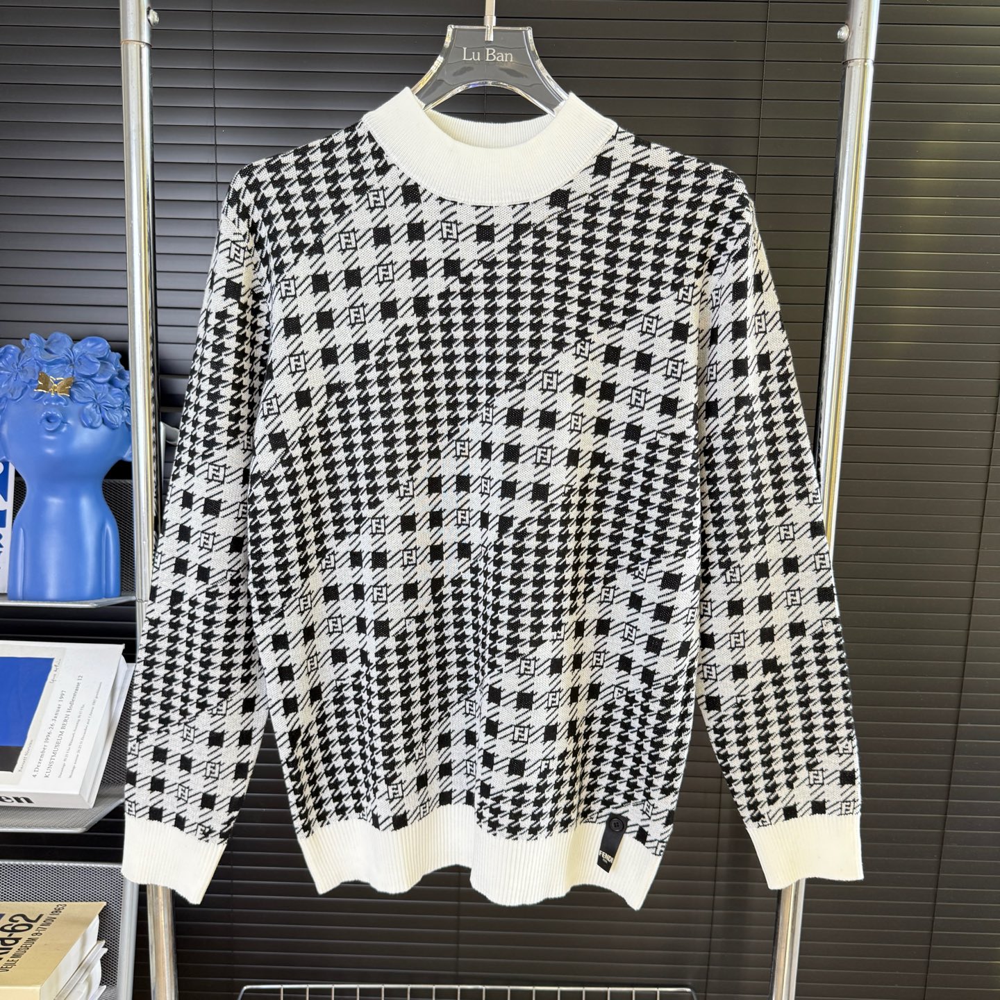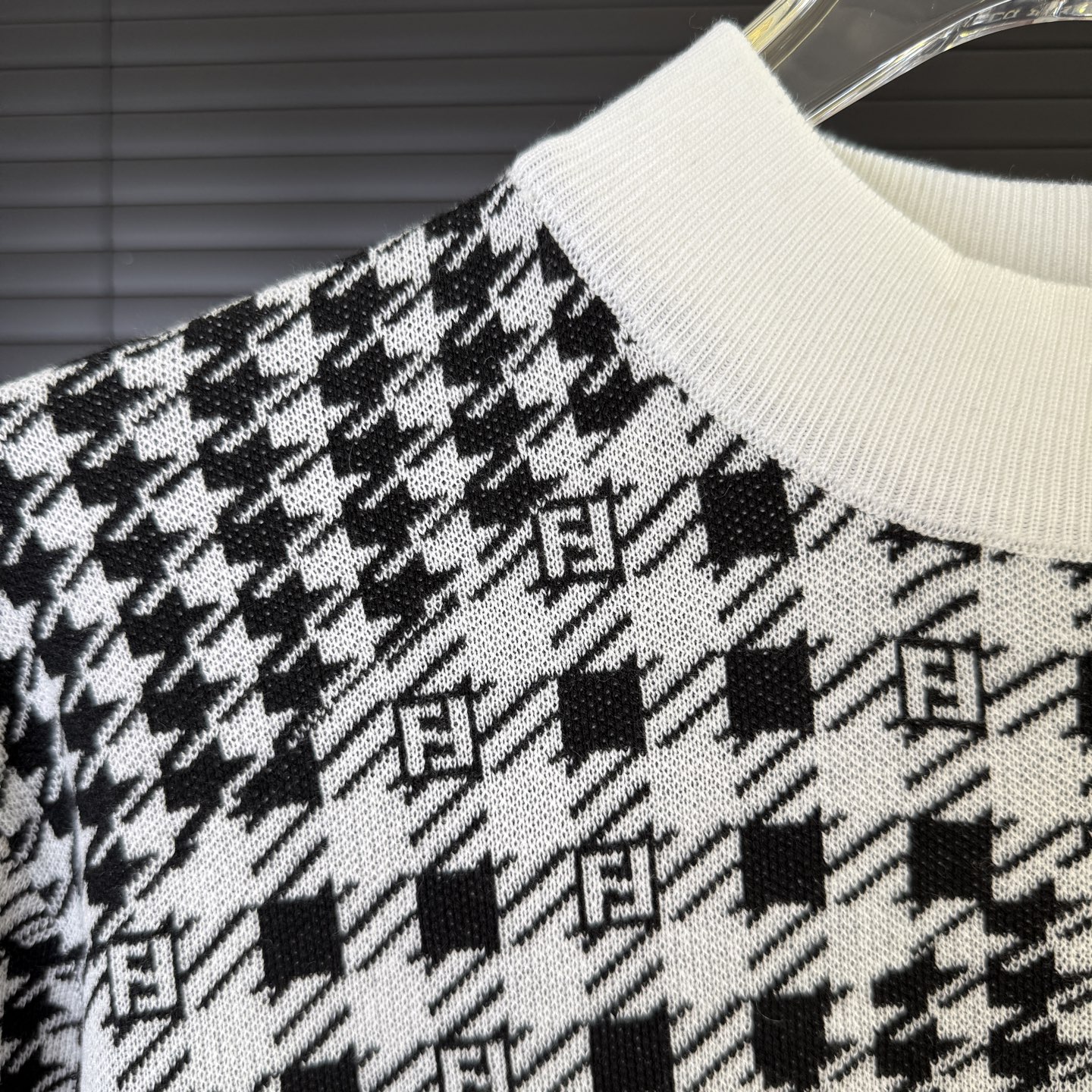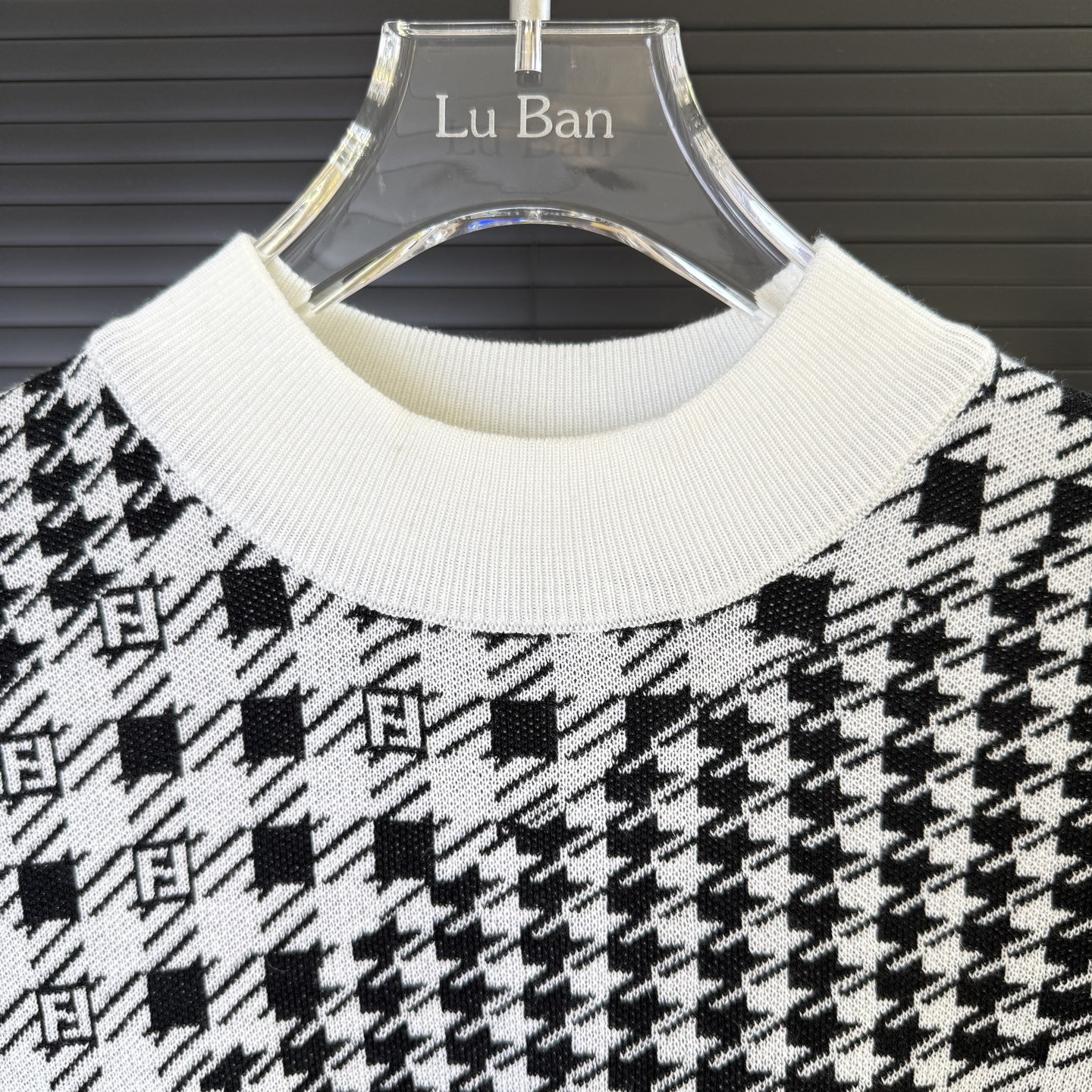 FENDI Fall/Winter houndstooth double F logo long sleeve wool sweater. Upgraded 80s retro style. 2025ss original fabric. Color: White. Sizes: M-3XL.