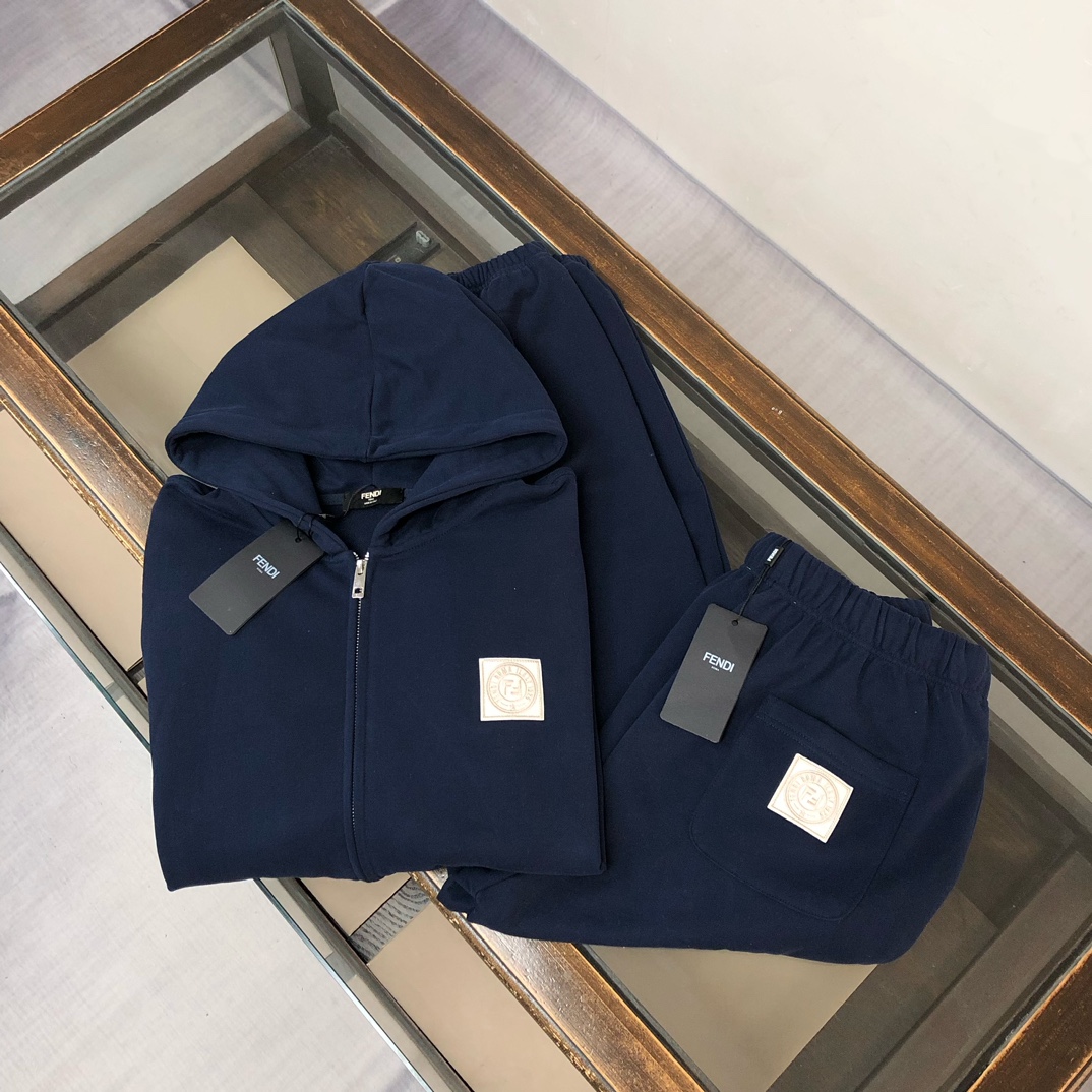 FENDI 2025 early autumn couples hoodie & sweatpants set. Custom 420g cotton, breathable, logo detail. Colors: Black, White, Navy, Gray. Sizes: S-XXL.