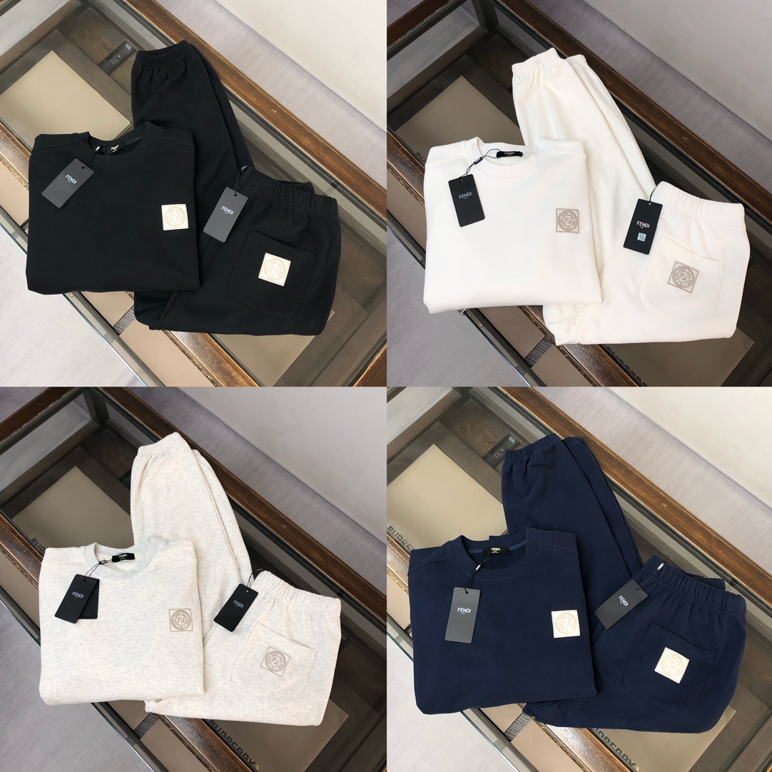 FENDI 2025 early autumn couples crewneck sweatshirt & jogger set. Custom 420g washed cotton. Available in black, white, navy, gray. Sizes S-XXL.