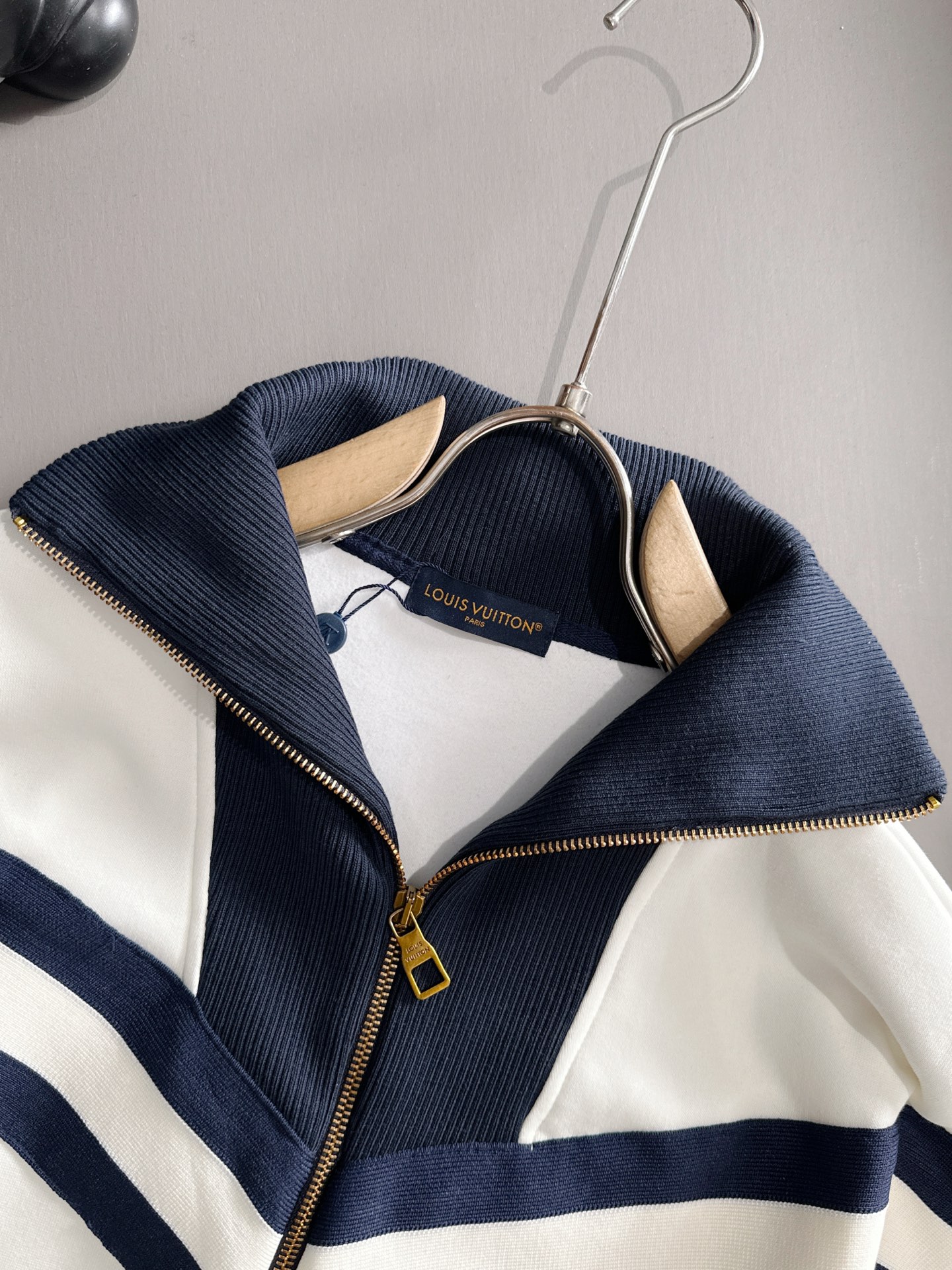 LV Louis Vuitton suit set. Top拼接suit, jacquard zipper pants, logo embroidery, classic black-white tape. Custom fabric, premium craftsmanship. Full 3 tags. Trendy men's fashion. Sizes M-3XL.