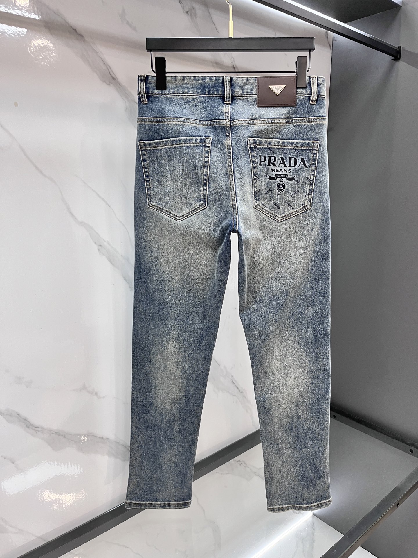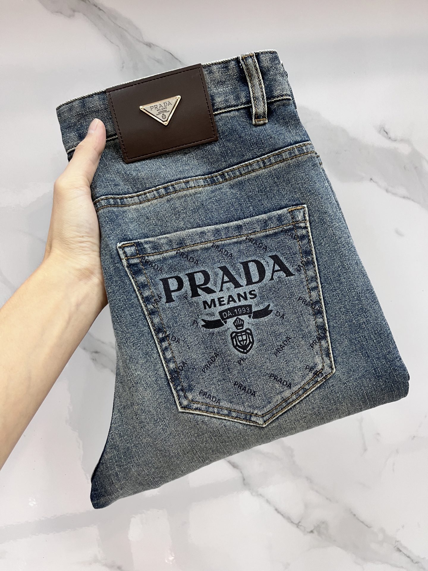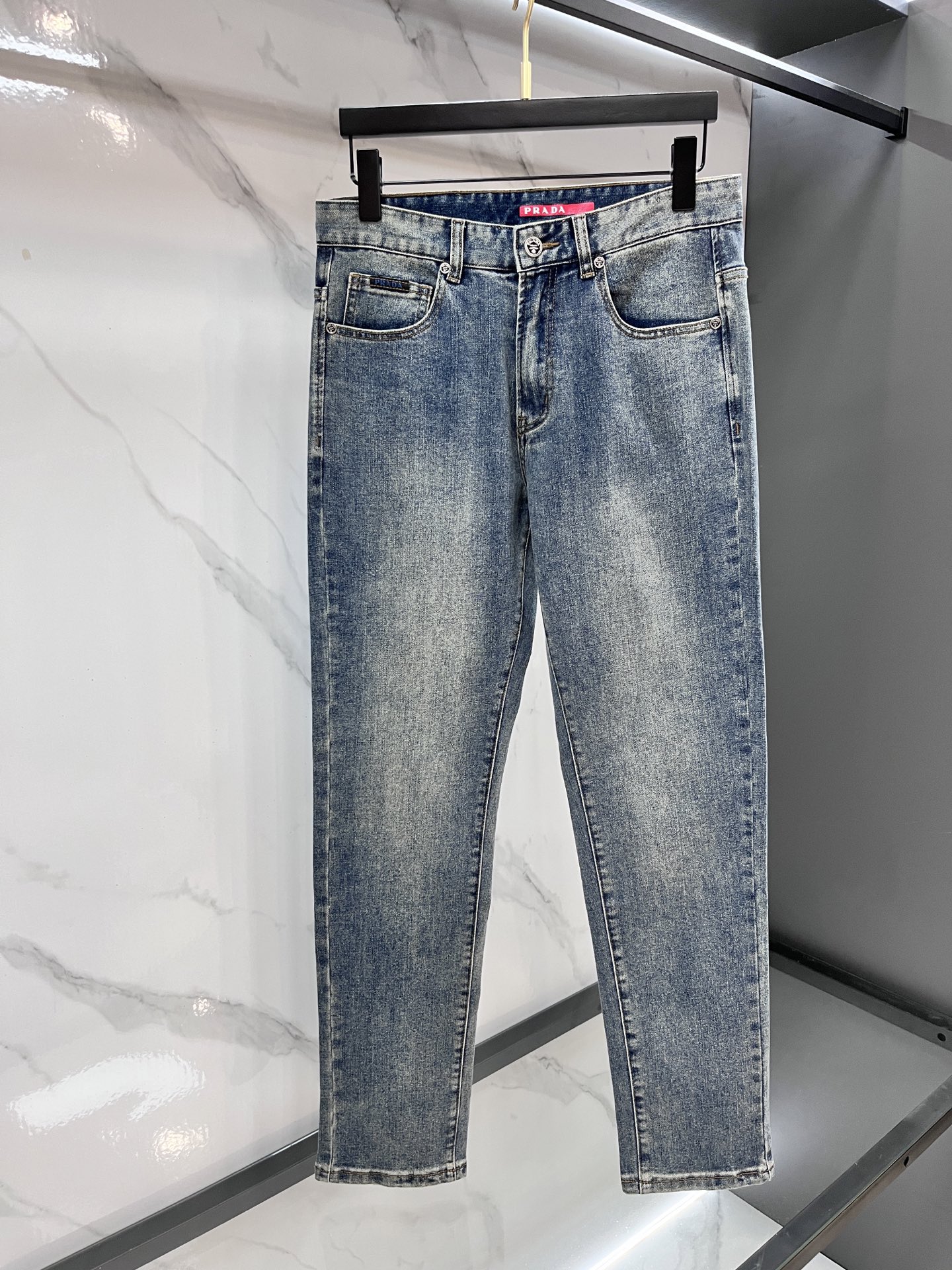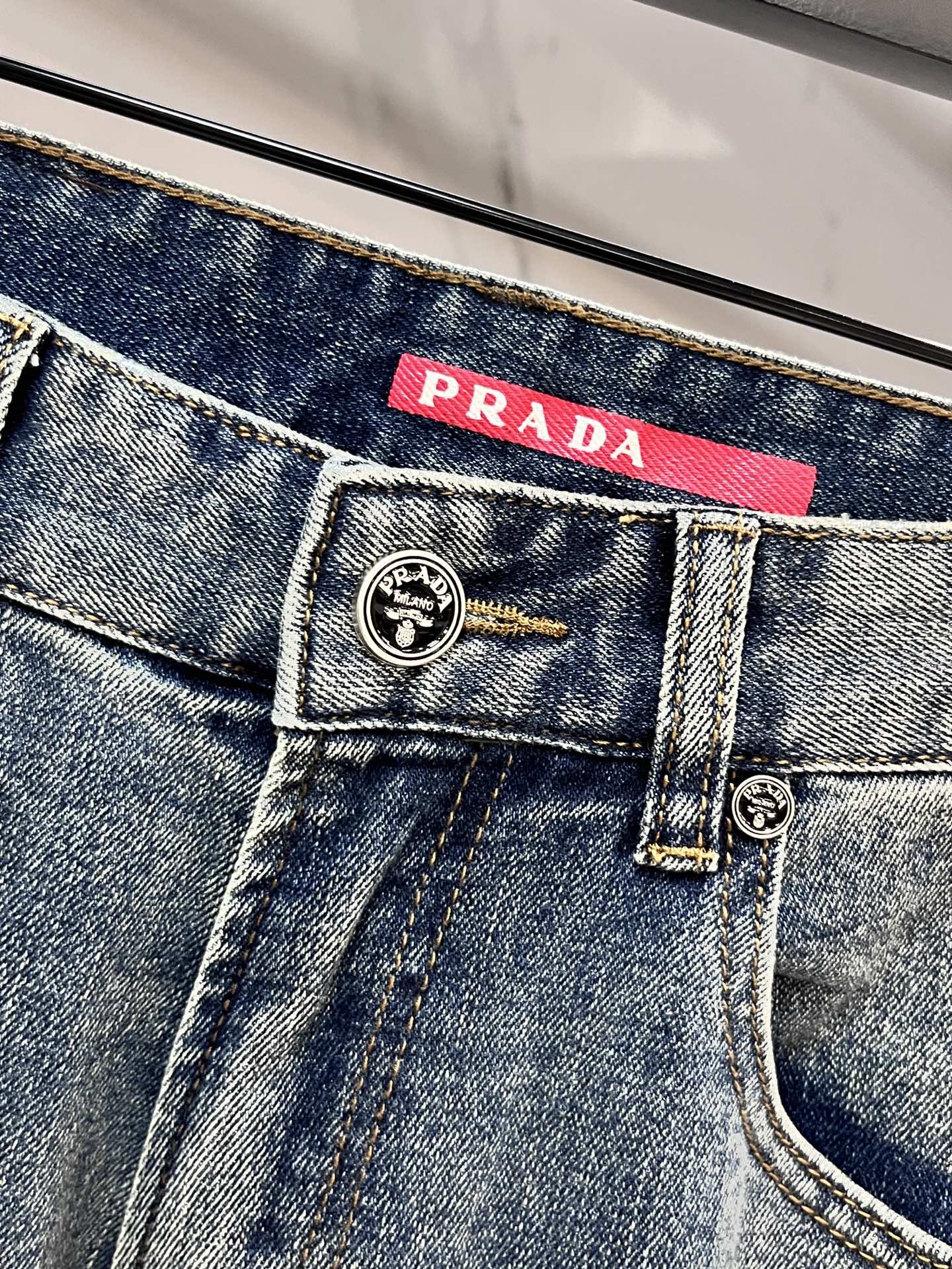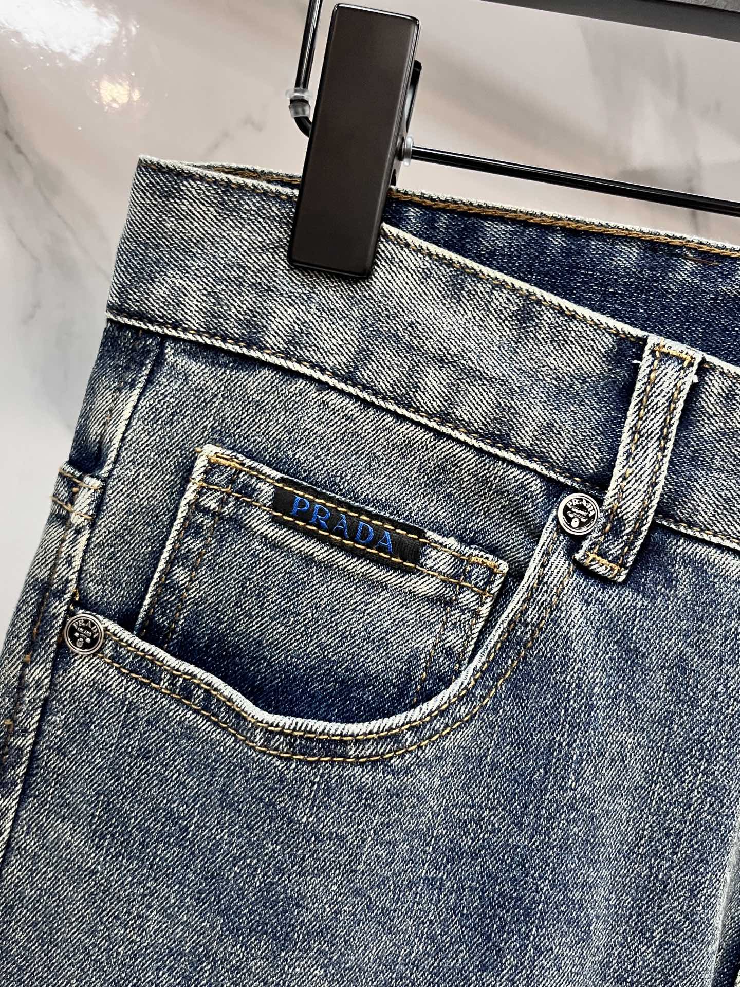 Prada 2025SS early spring lightweight distressed jeans. Imported stretch denim, comfortable and breathable. Metal trim, flattering fit. Sizes 29-40.