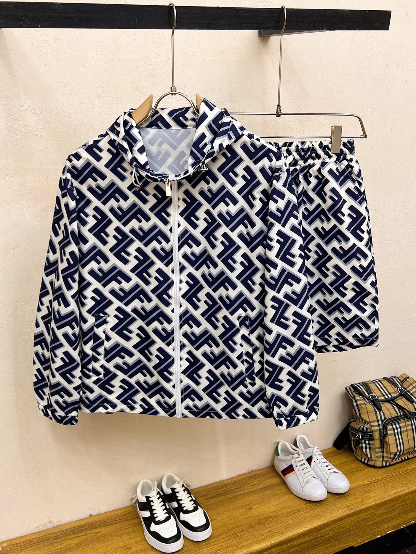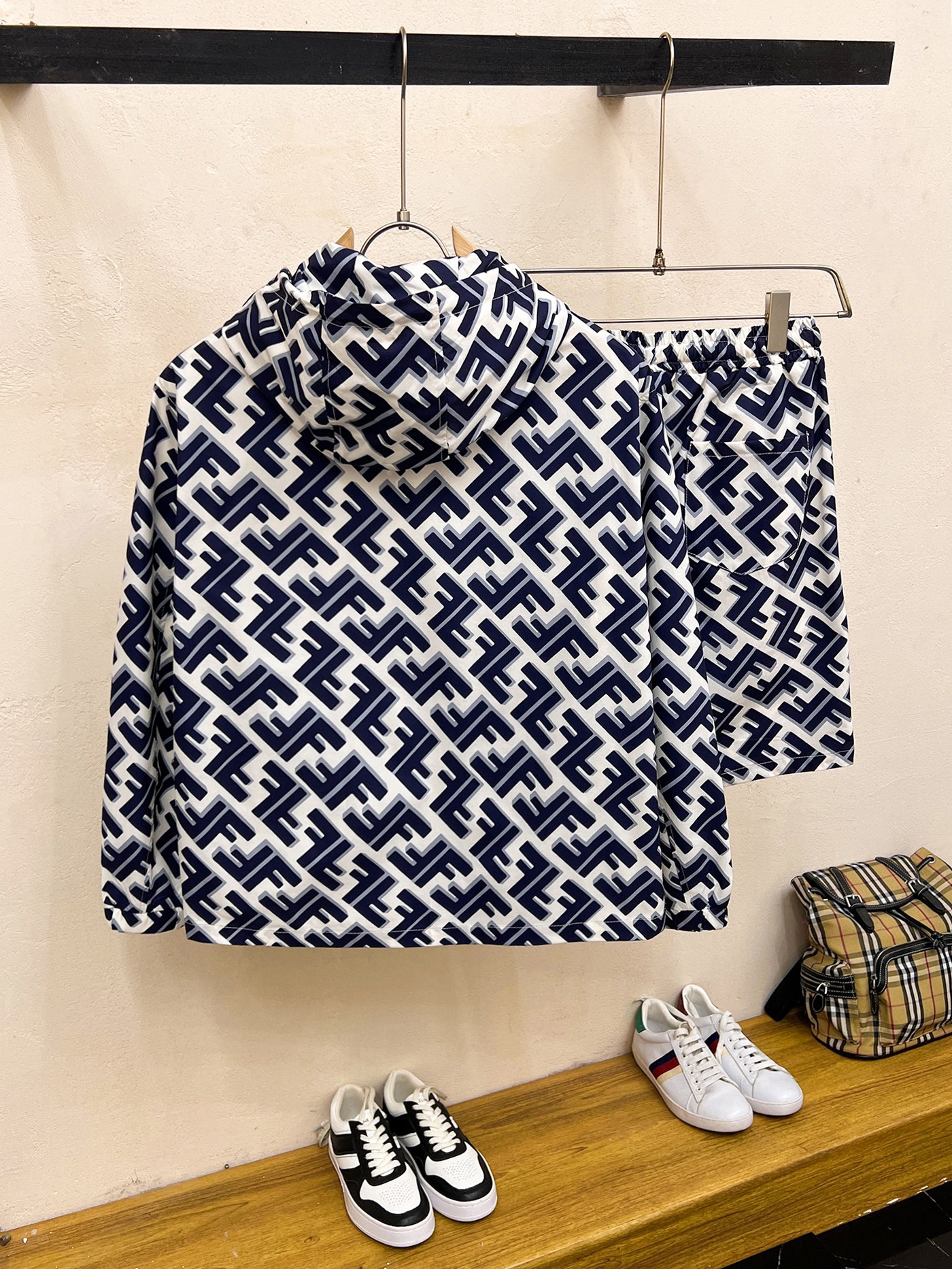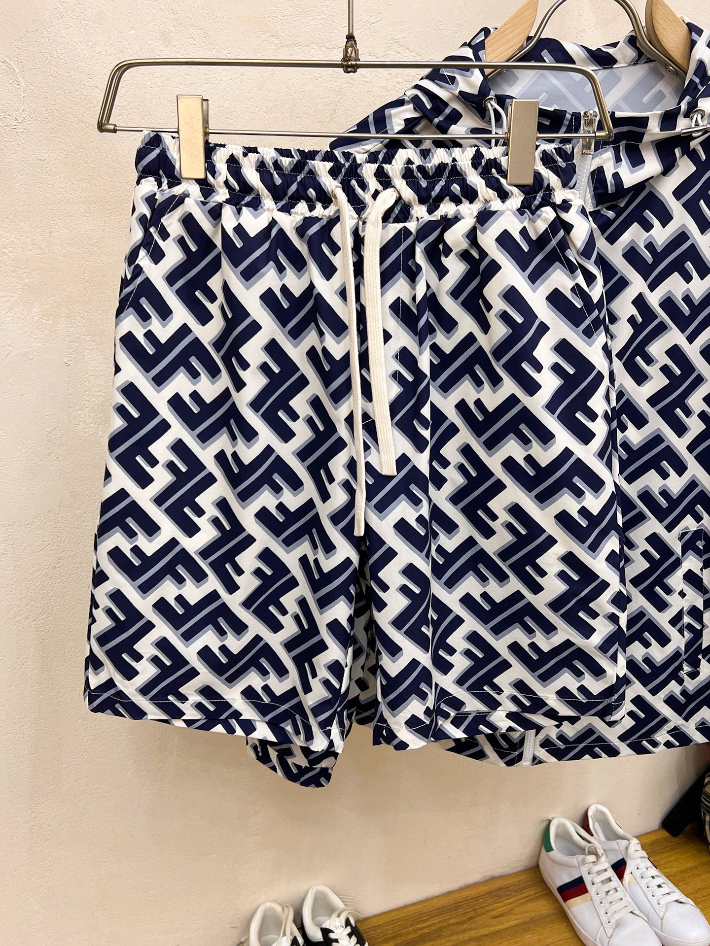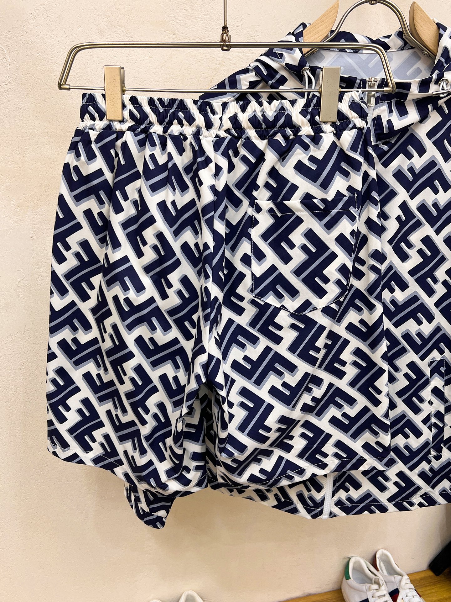 Fendi 2025 summer sun protection shorts set. Overseas edition, luxury custom fit. Imported poly fiber fabric, soft, comfortable, sweat-absorbent. High-density custom fabric, retains shape after washing. Youthful, stylish streetwear. Sizes M-XXXL.