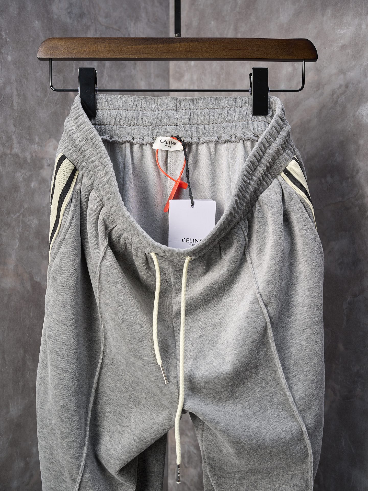 Custom-made cloud-soft twin misty cotton satin, delicate and smooth, skin-contact feels like wrapped in clouds. Primarily in advanced gray tone, low-key yet connotative. The iconic CELINE Arc de Triomphe embroidery awakens on the ash misty velvet surface, highly recognizable. Contrast color trim on both sides enhances it, highlighting the color tension. Visual impact between movement and stillness. The lazy lines of the straight-leg drape cut, combining strength and softness. Separated, they are style pieces; worn together, they are aura battle robes. Wearing the set ensures effortless styling.