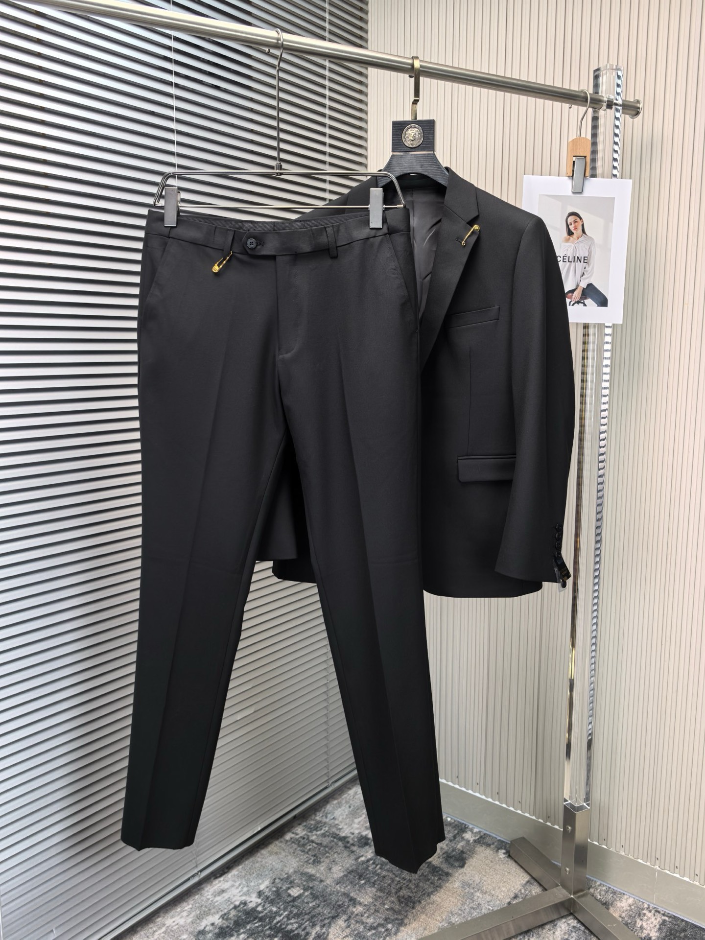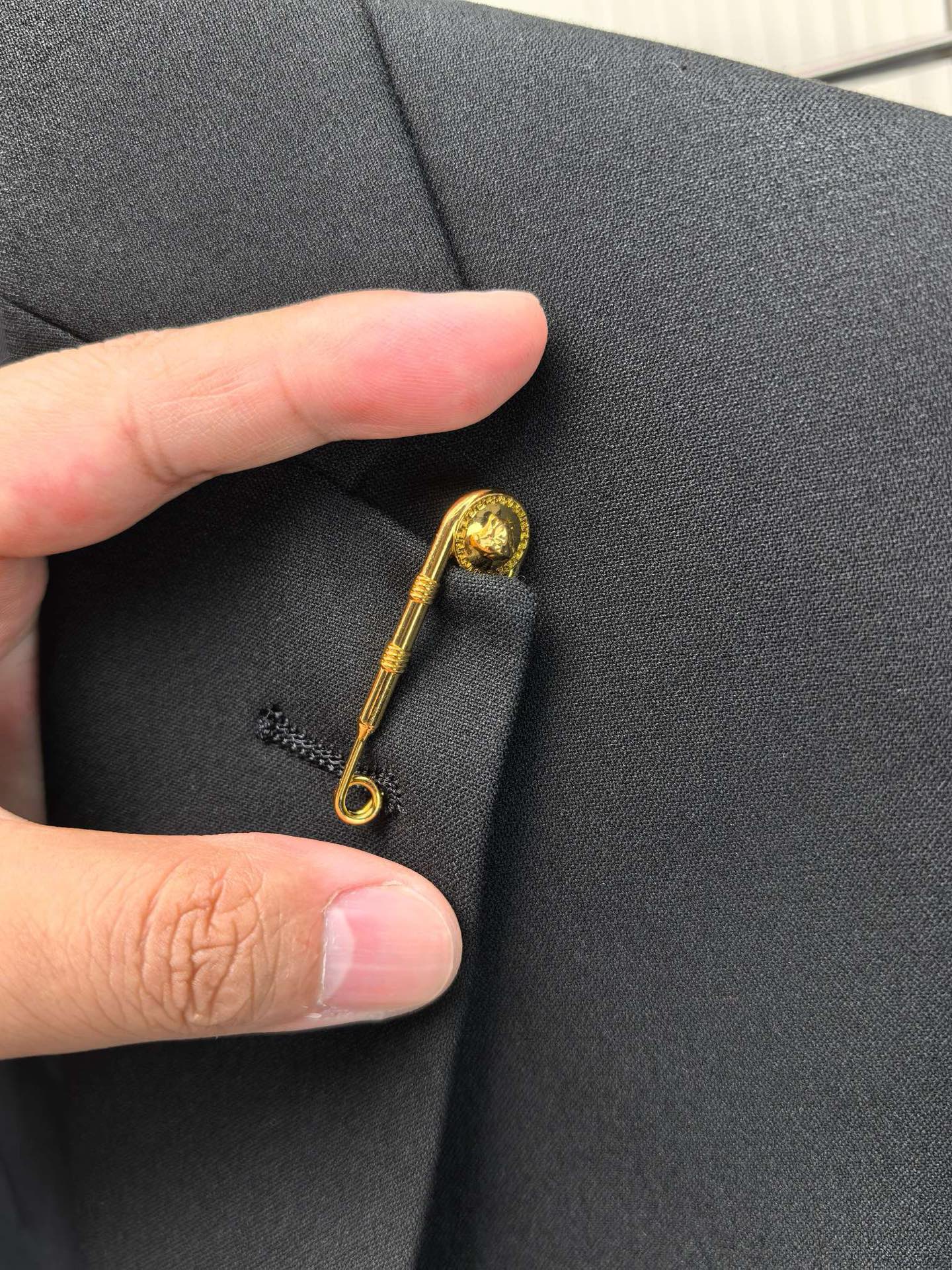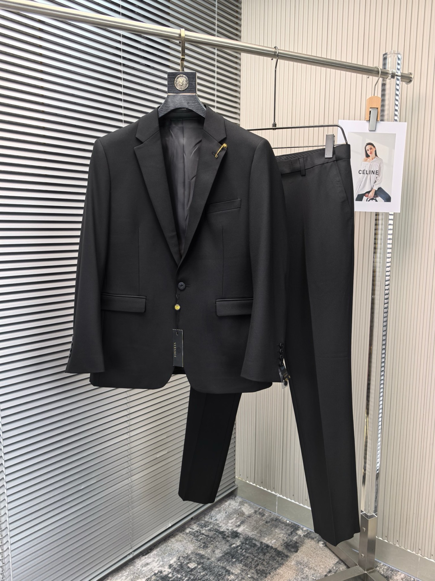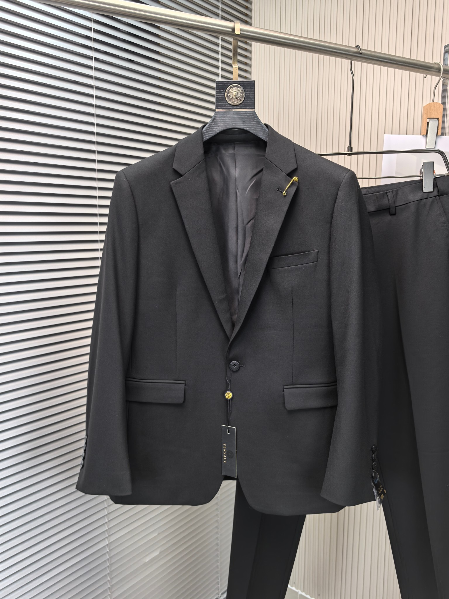 Home•Apparel•Suit•Versace wool blend suit for 2025 wedding, business, and casual wear. Modern design with lapel collar and logo details. Sizes 46-56 (M-4XL). Comfortable and stylish for various occasions.