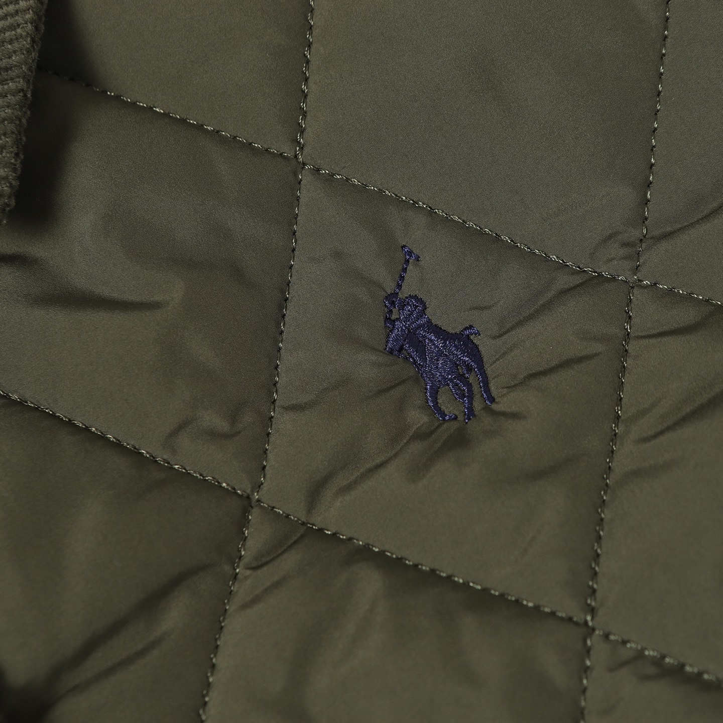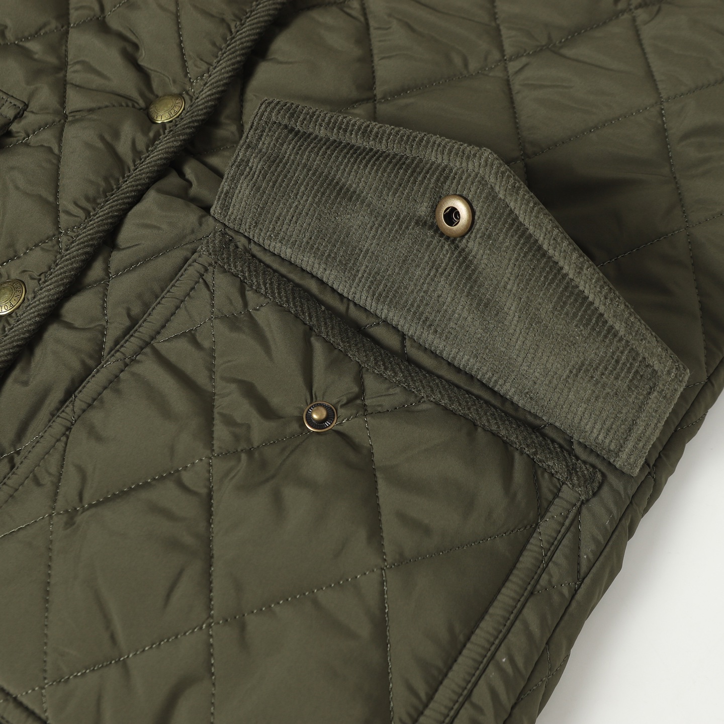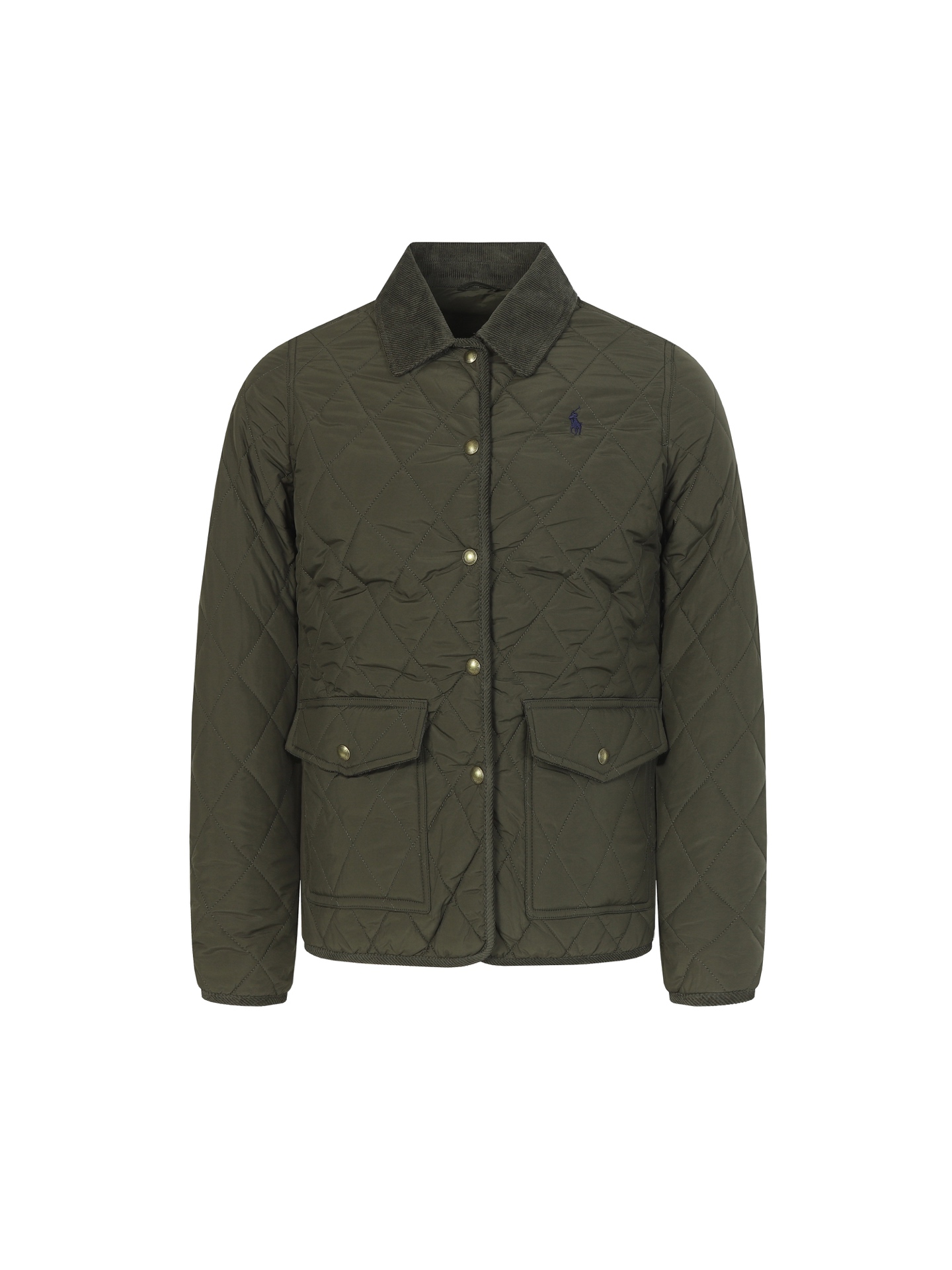 RL Lauren women's diamond-pattern cotton jacket. Feather-like filling, soft corduroy trim. Lightweight, warm, non-bulky. Sizes: S M L.