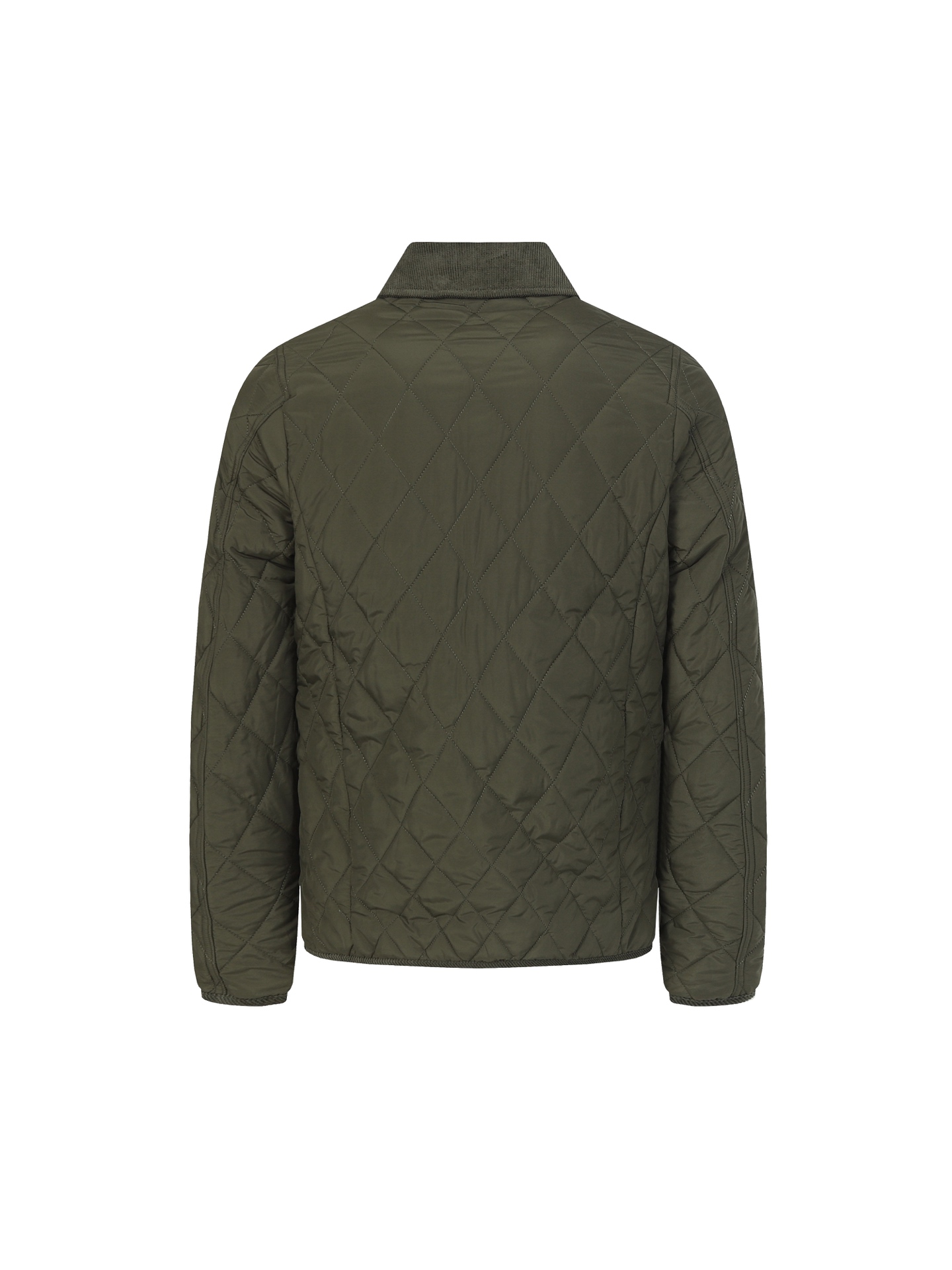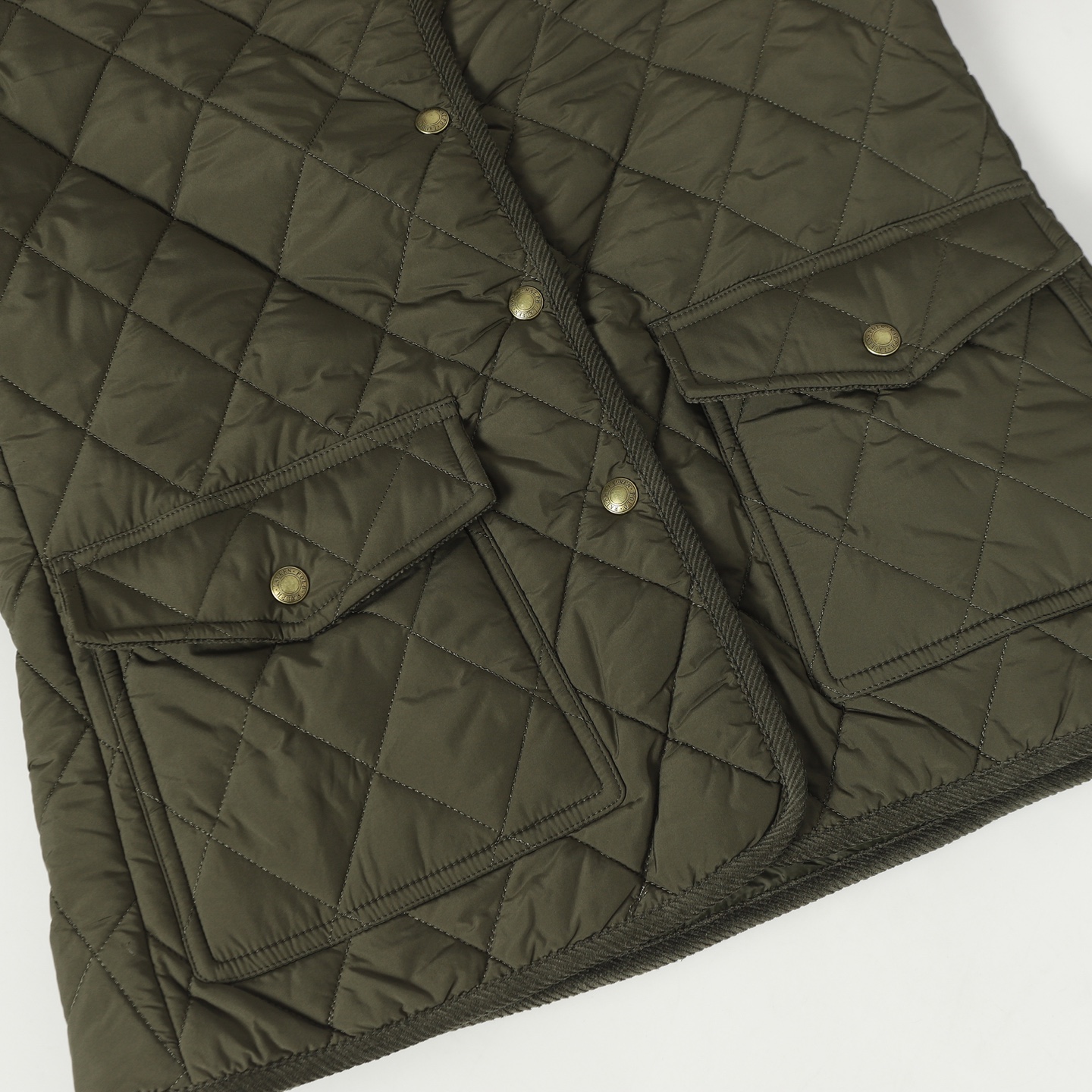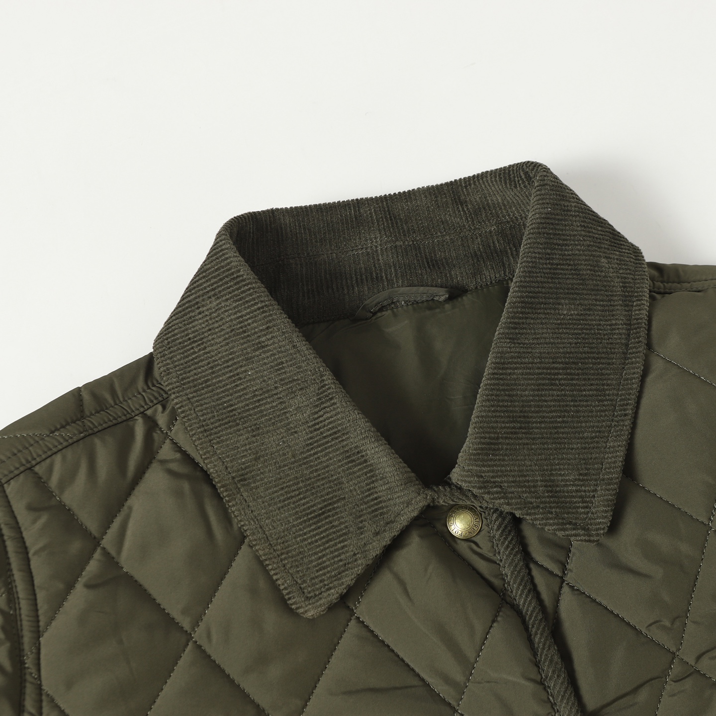 RL Lauren women's diamond-pattern cotton jacket. Feather-like filling, soft corduroy trim. Lightweight, warm, non-bulky. Sizes: S M L.