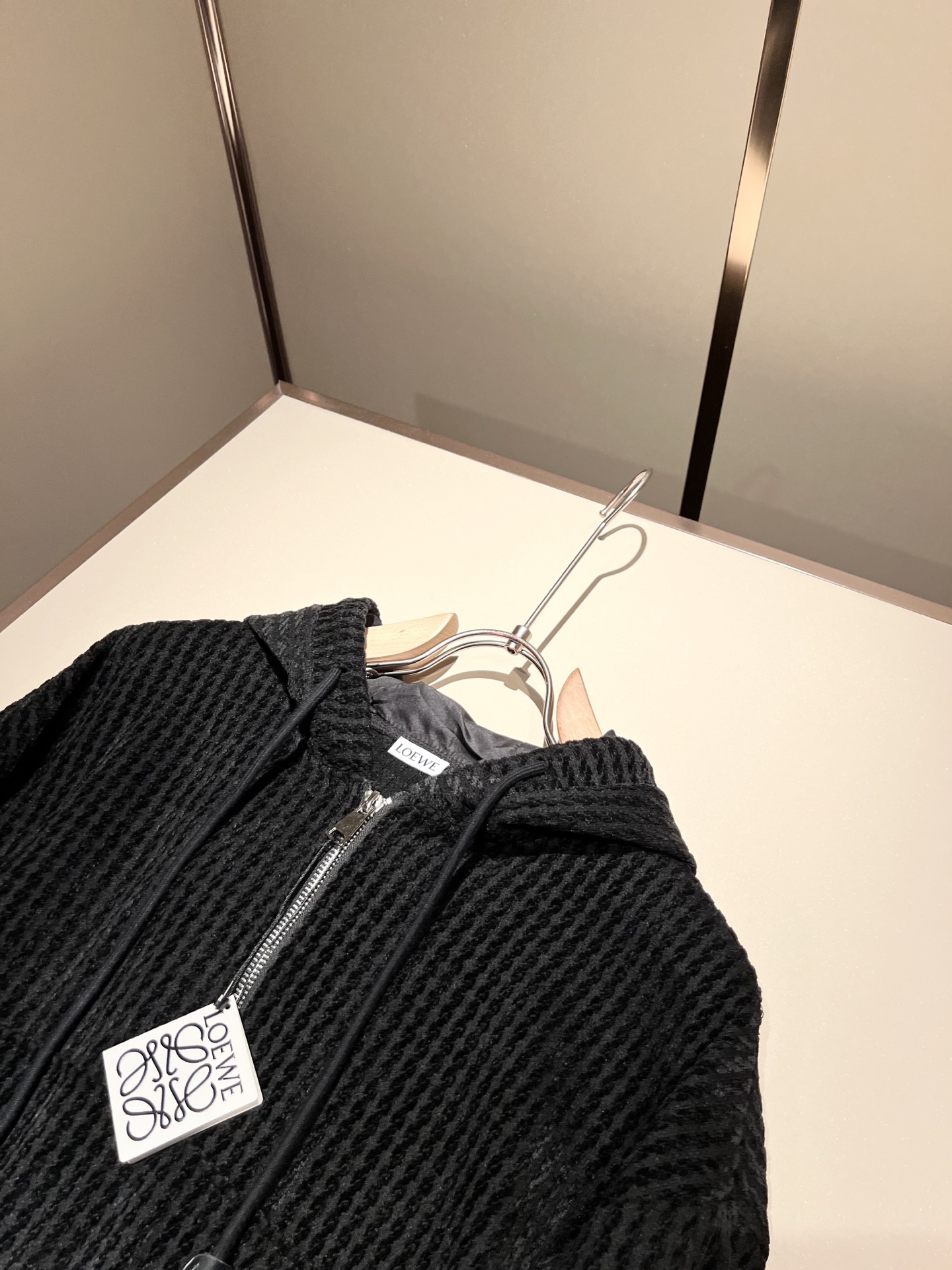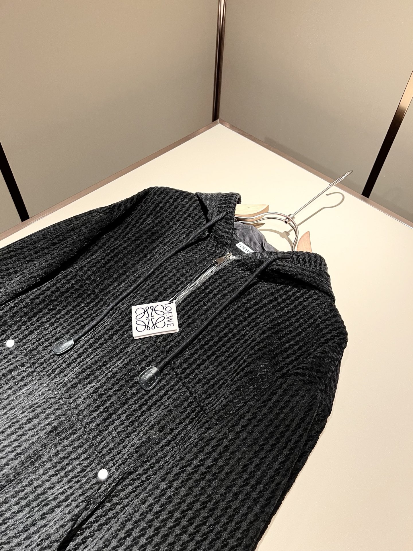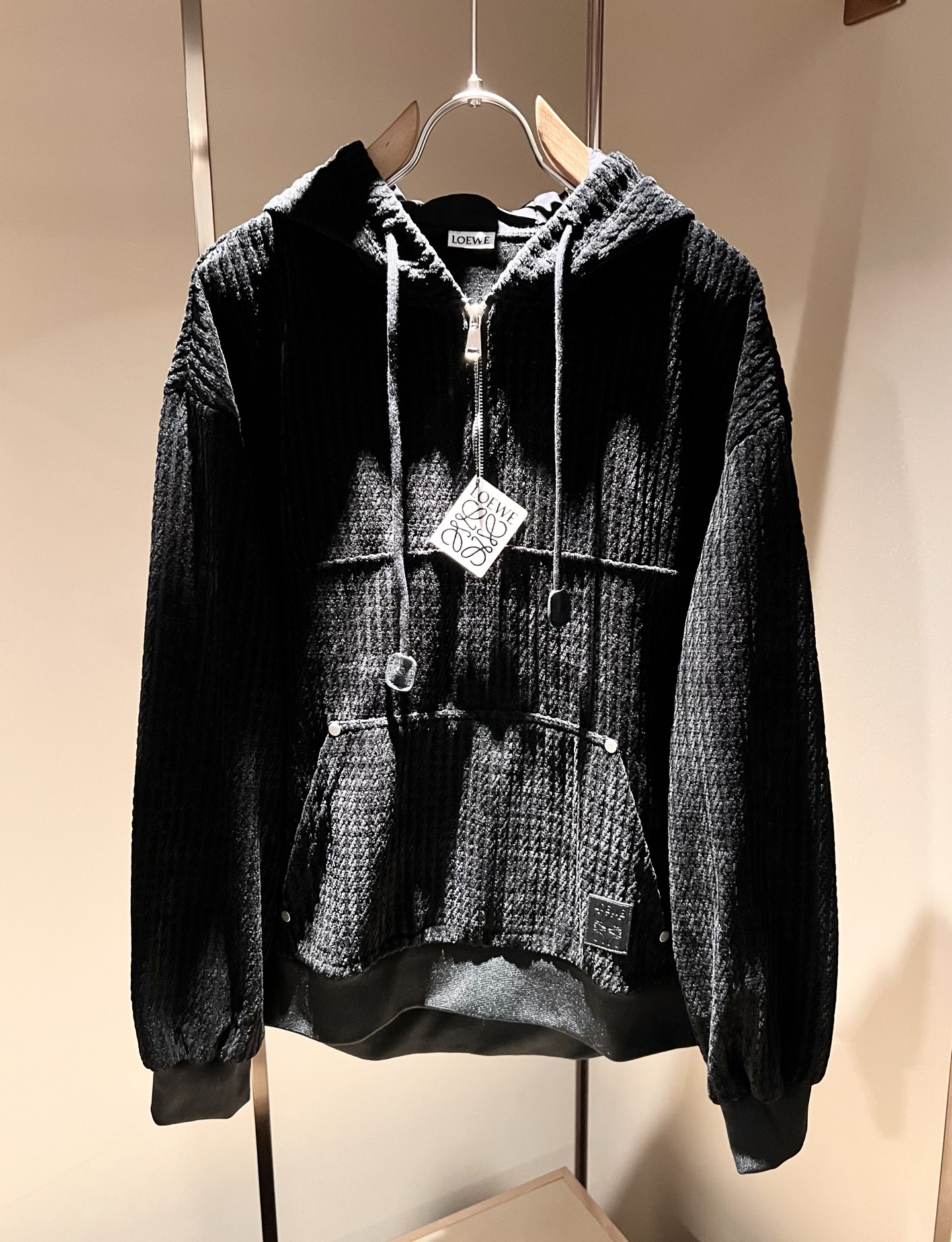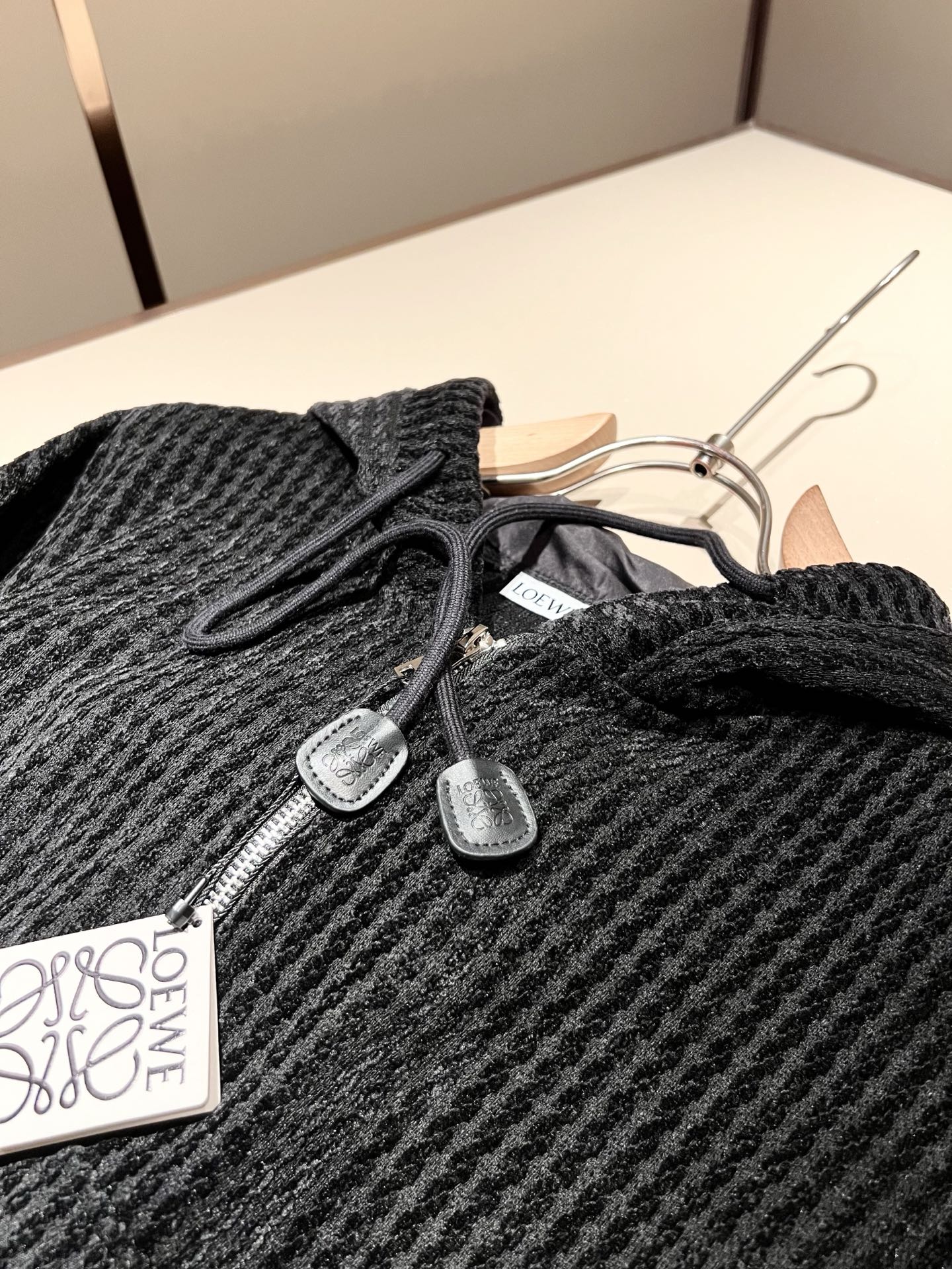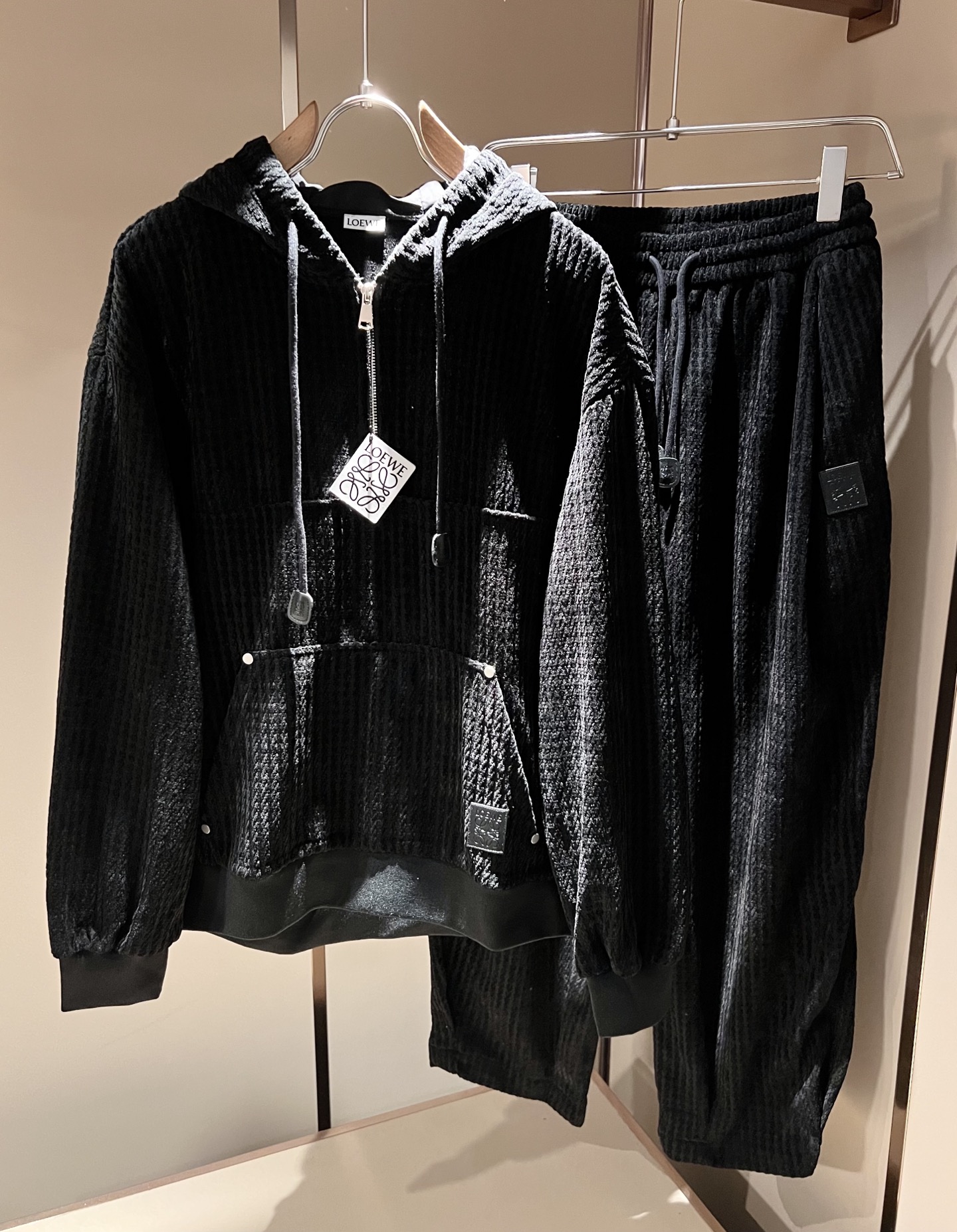 LOE*WE 2025 Fall/Winter unisex set. Italian factory order, stylish logo leather design, custom cotton fabric. Trendy, high-end essential. Sizes: M-3XL.