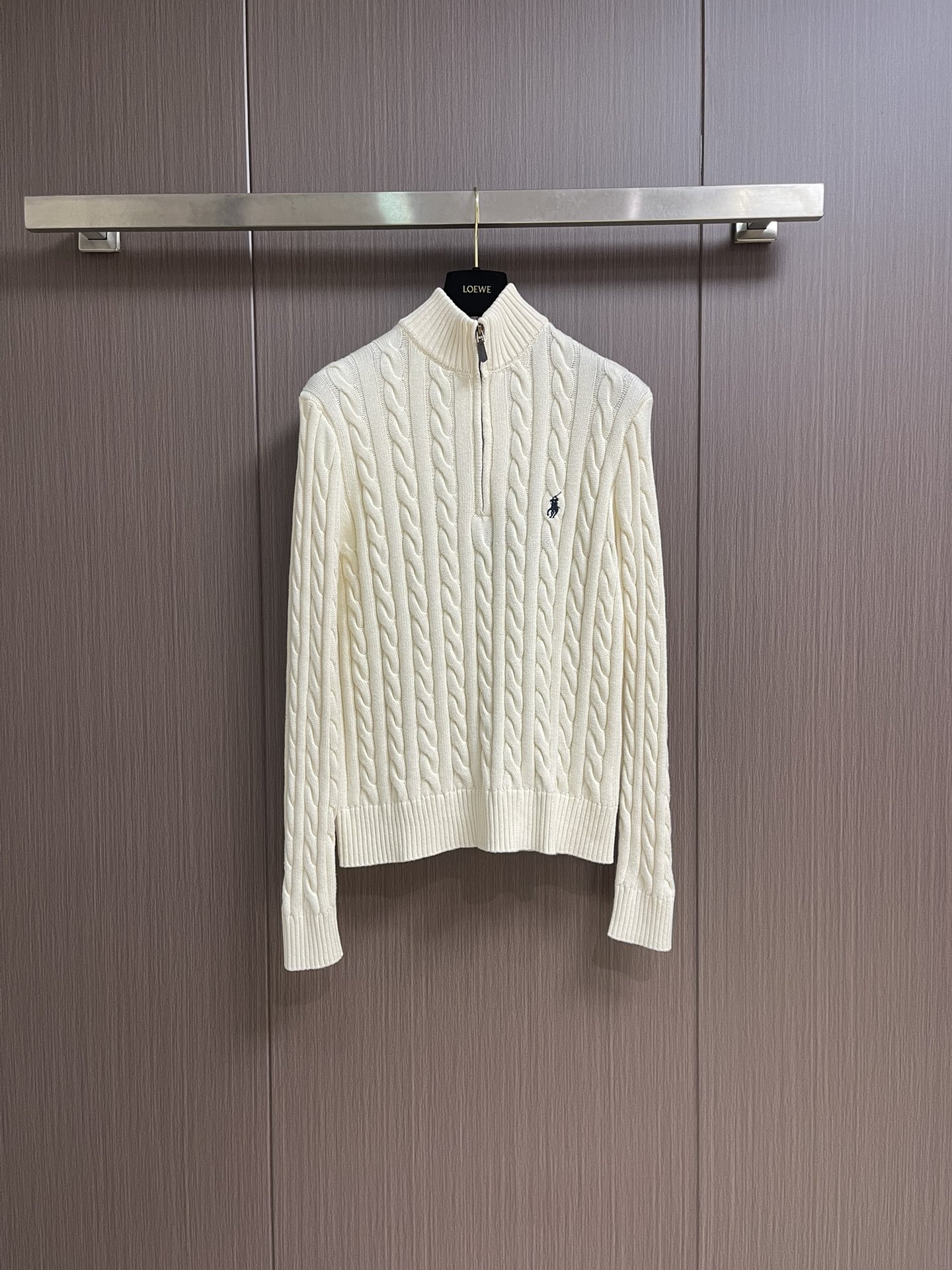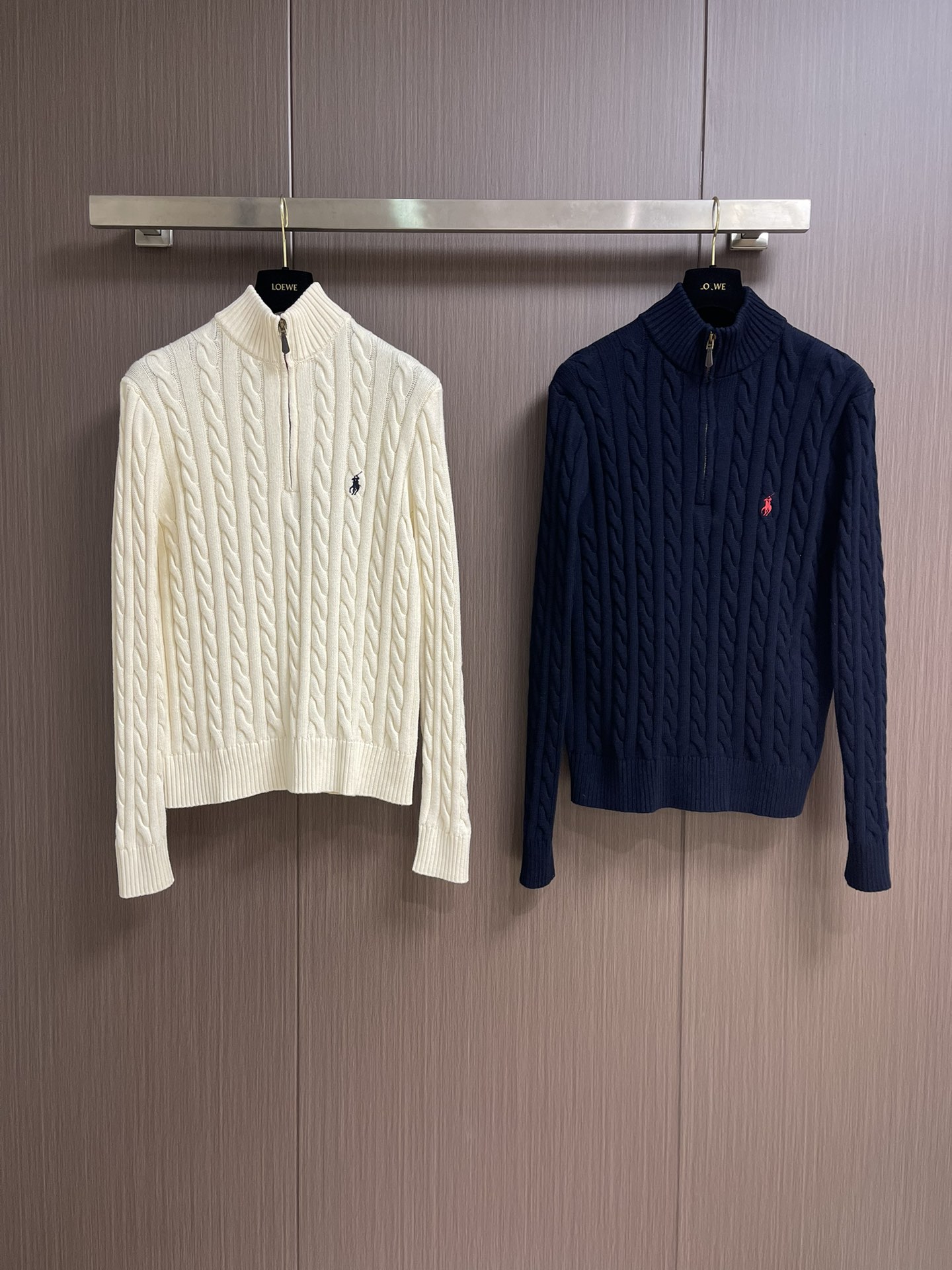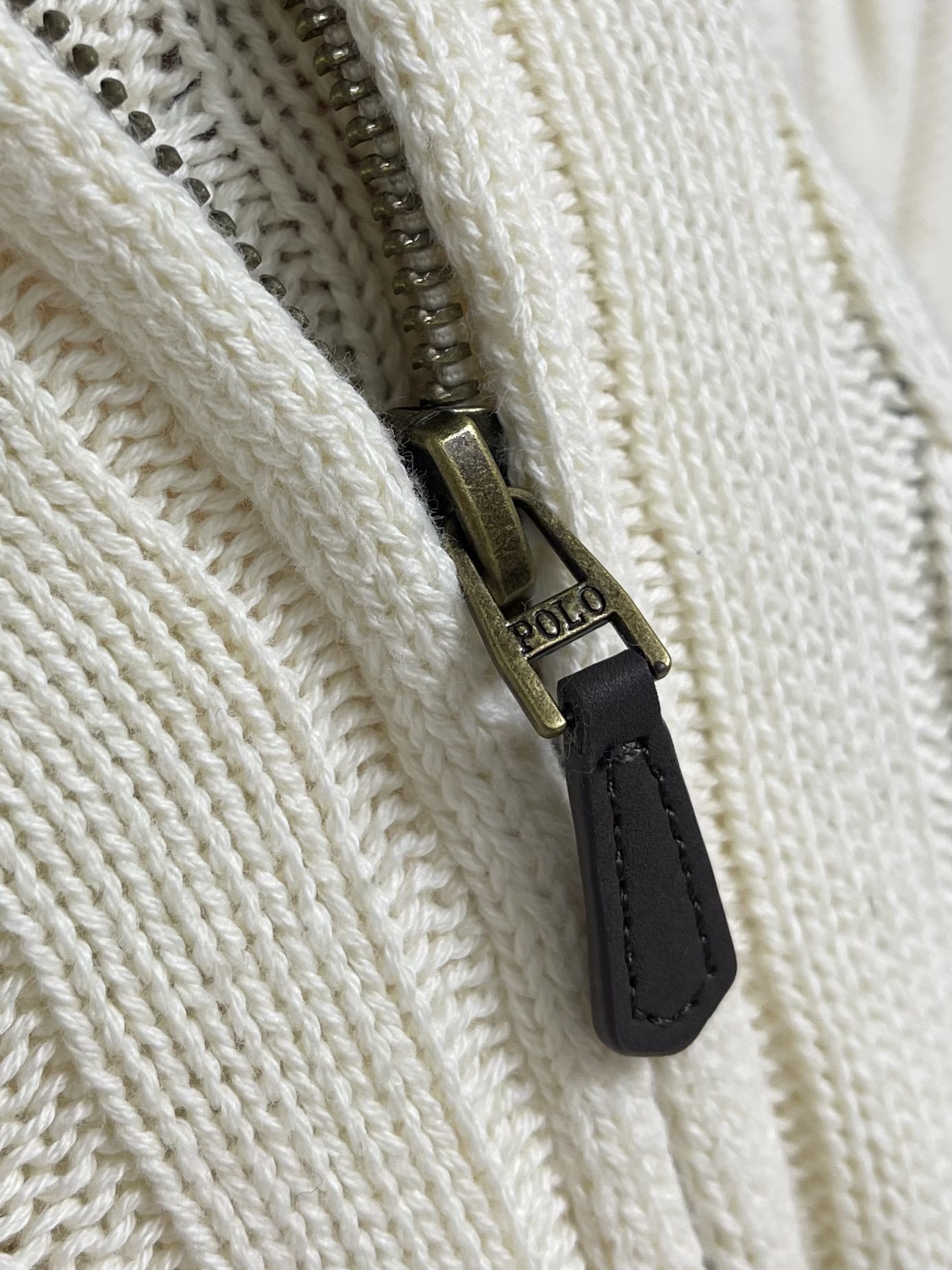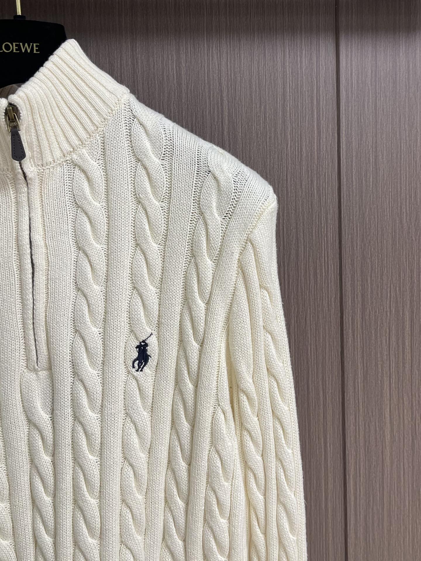 Ralph Lauren cable-knit half-zip sweater. Made of thick woven cotton with细腻纹理. Classic cable design, precise arrangement. Embroidered pony logo. Semi-high neck zipper. Elegant and timeless. Sizes: S-XL.