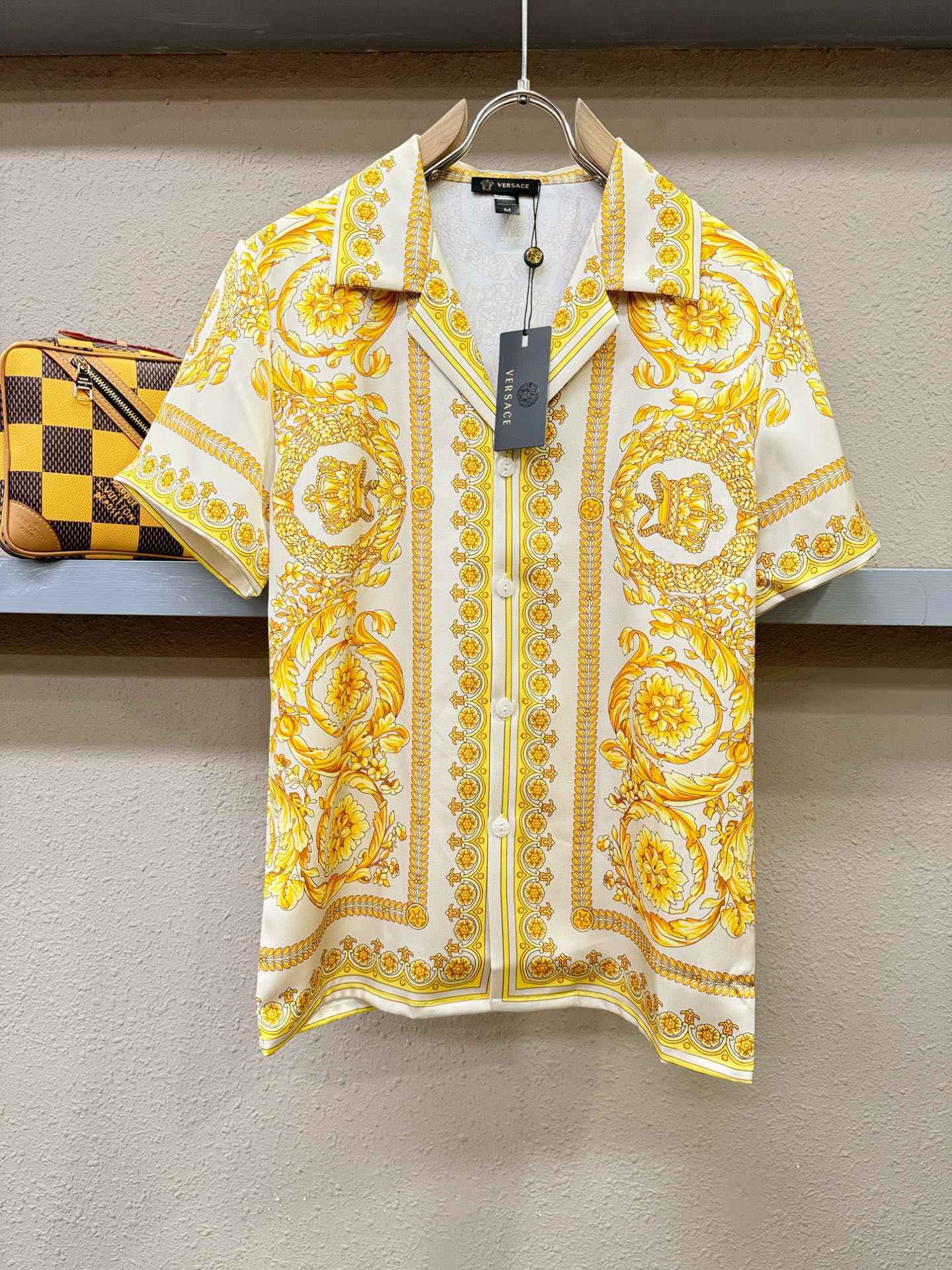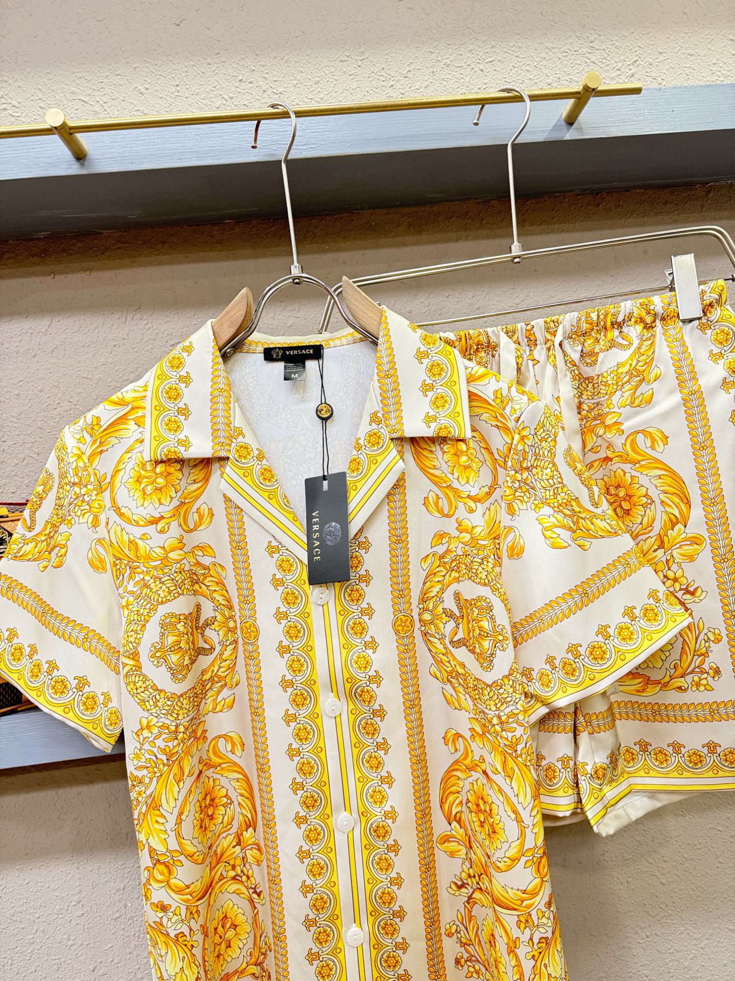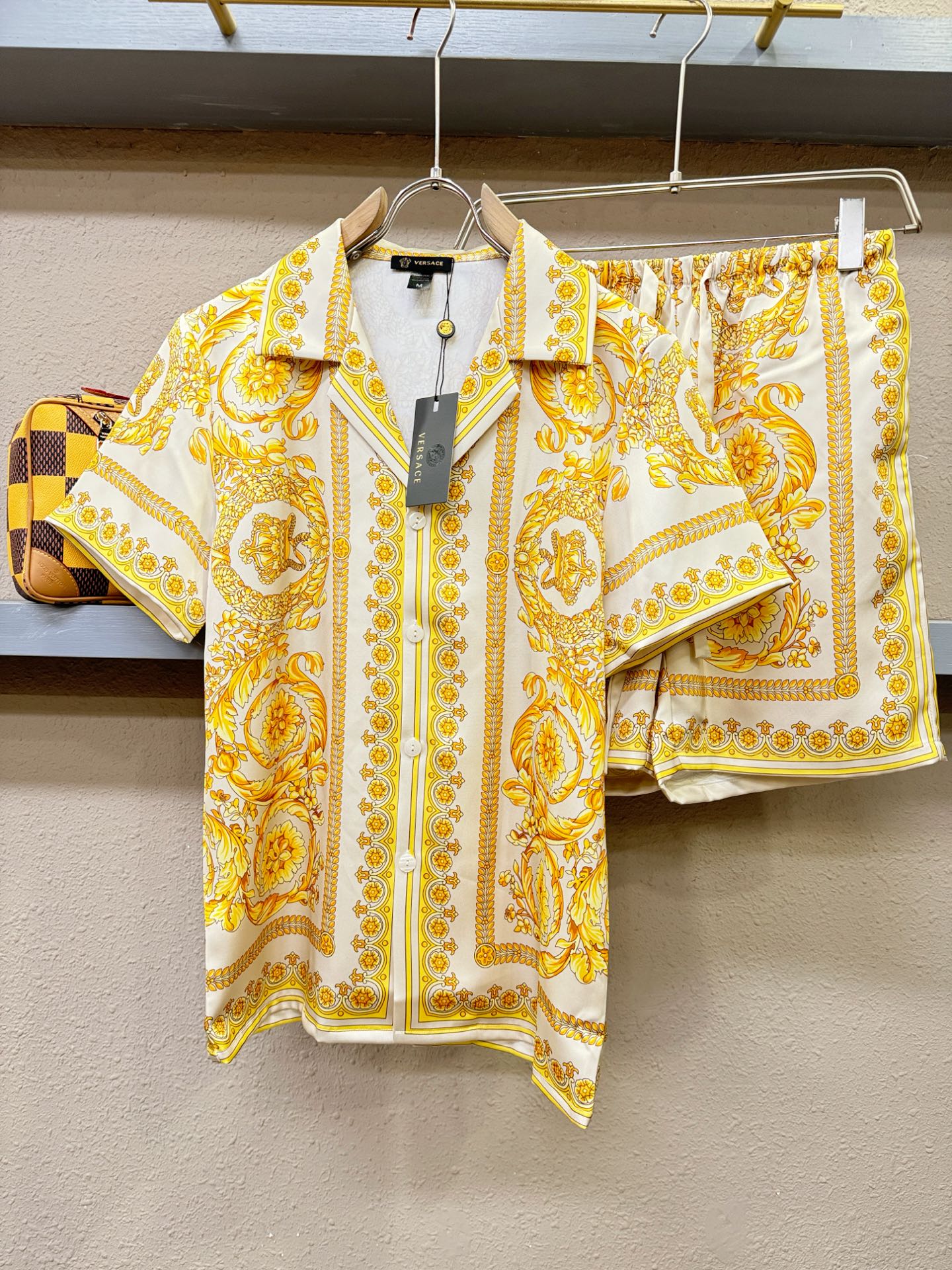 Versace 2025 silk set, unisex loungewear/pajamas. Clean cut, urban style. Soft, smooth silk, structured fit. Exquisite hardware, premium materials. Sizes M-3XL.