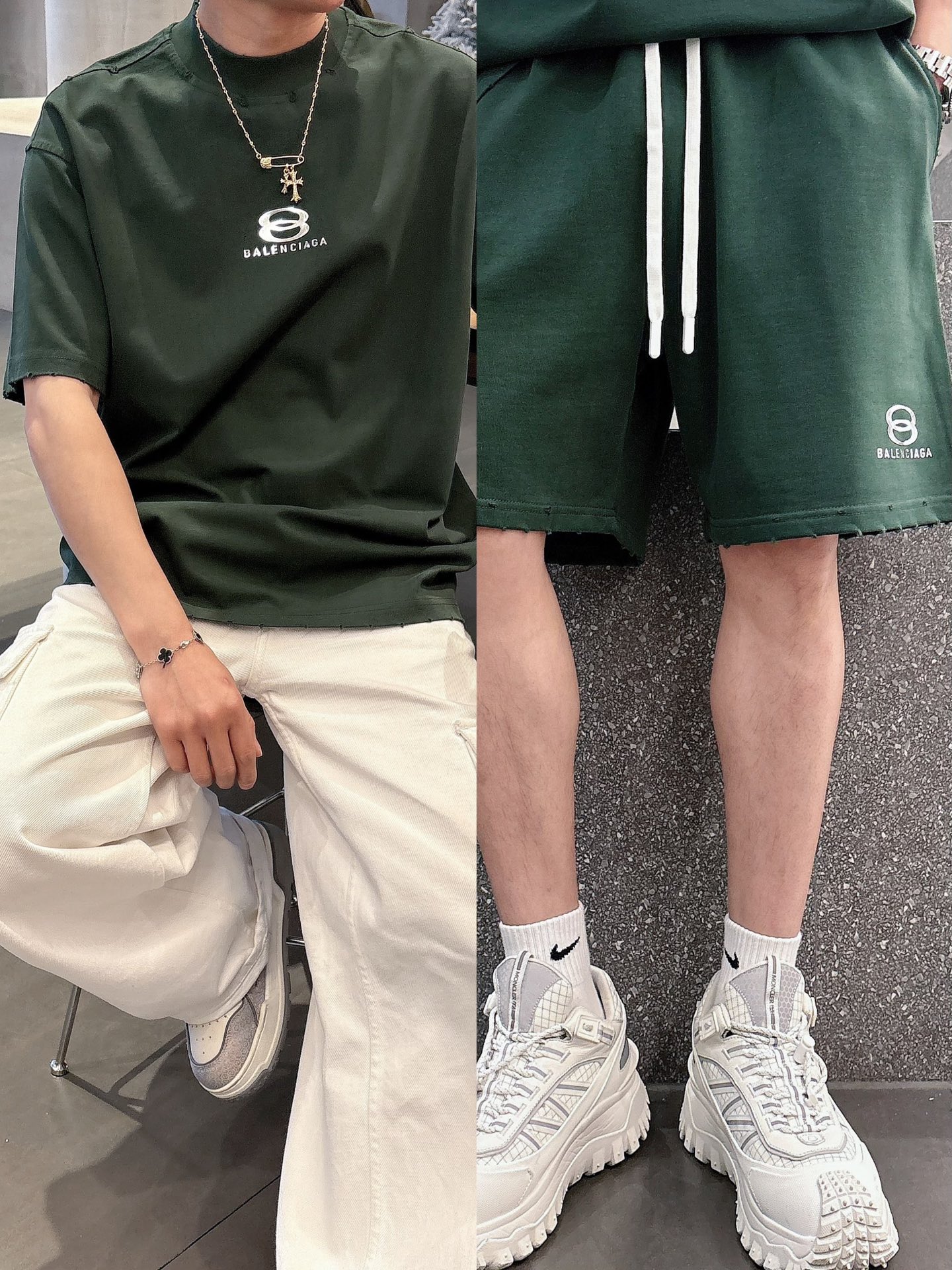 Balenciaga 2025 set: new washed & distressed tech. Short sleeve tee & shorts. Colors: Grey, Beige, Black, Green. Sizes: M-3XL (top), 29-38 (shorts).